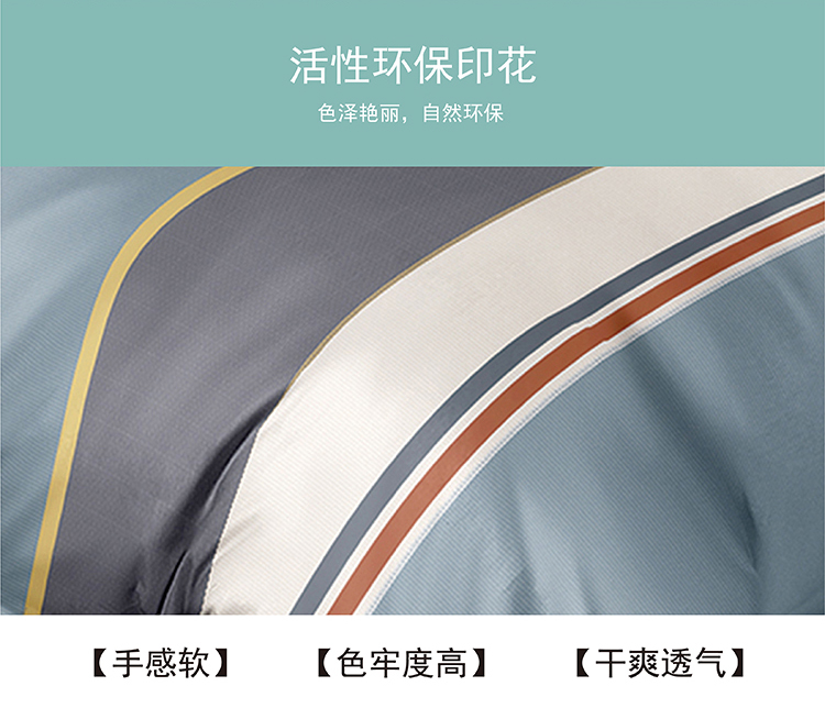 床单:230x245cm 被套:200x230cm 枕套:50x80cm(外径) 【面 料】全棉 AB版 (40支,密度128*68) 产品特点: 1.优质全棉织造,面料柔软细腻,透气性佳; 2.AB双版拼色设计,时尚灵动,带来清新的感觉; 3.优质印染工艺,色彩丰富,层次感佳,做工精良,款式简约大方。