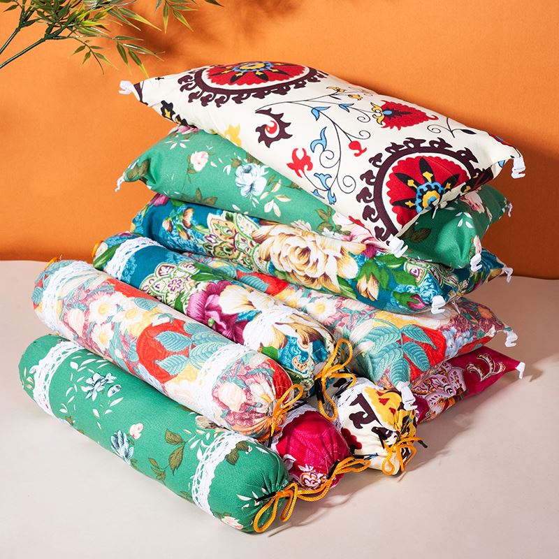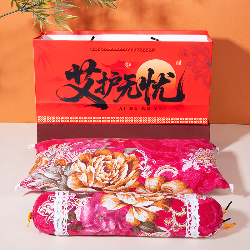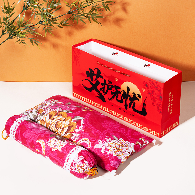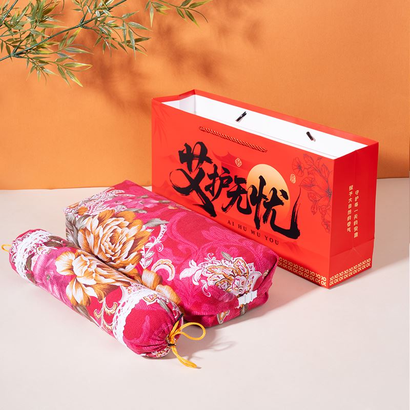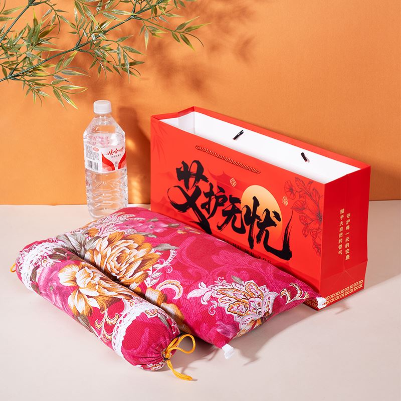 手提规格:400*200*100mm 产品配置:艾草宫廷枕40*20*6cm*1 艾草颈椎枕35*8*8cm*1 推荐理由: 1、艾护无忧手提袋,国潮风,大气,喜庆。 2、艾草套枕精选老粗布面料,色泽鲜艳,亲肤透气,内芯填充艾草碎,淡淡艾草香,可安神舒眠,温经通络。 3、颈椎枕圆柱造型贴合颈部曲线,专注颈椎健康,缓解各种颈部不适。 4、宫廷枕两侧设调节卡扣,调节枕头高度,牵引模式、睡眠模式,两种模式可转换。 5、白天小憩时颈椎枕拉伸颈椎,夜晚睡眠时宫廷枕一夜相伴,搭配使用,为健康助力。 6、花开富贵,繁花似锦,五种花色混搭,每种都好看。