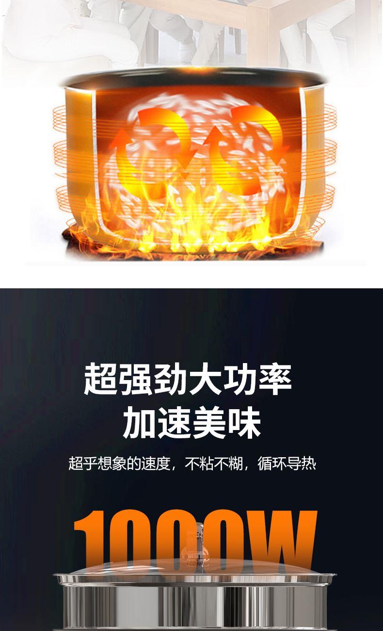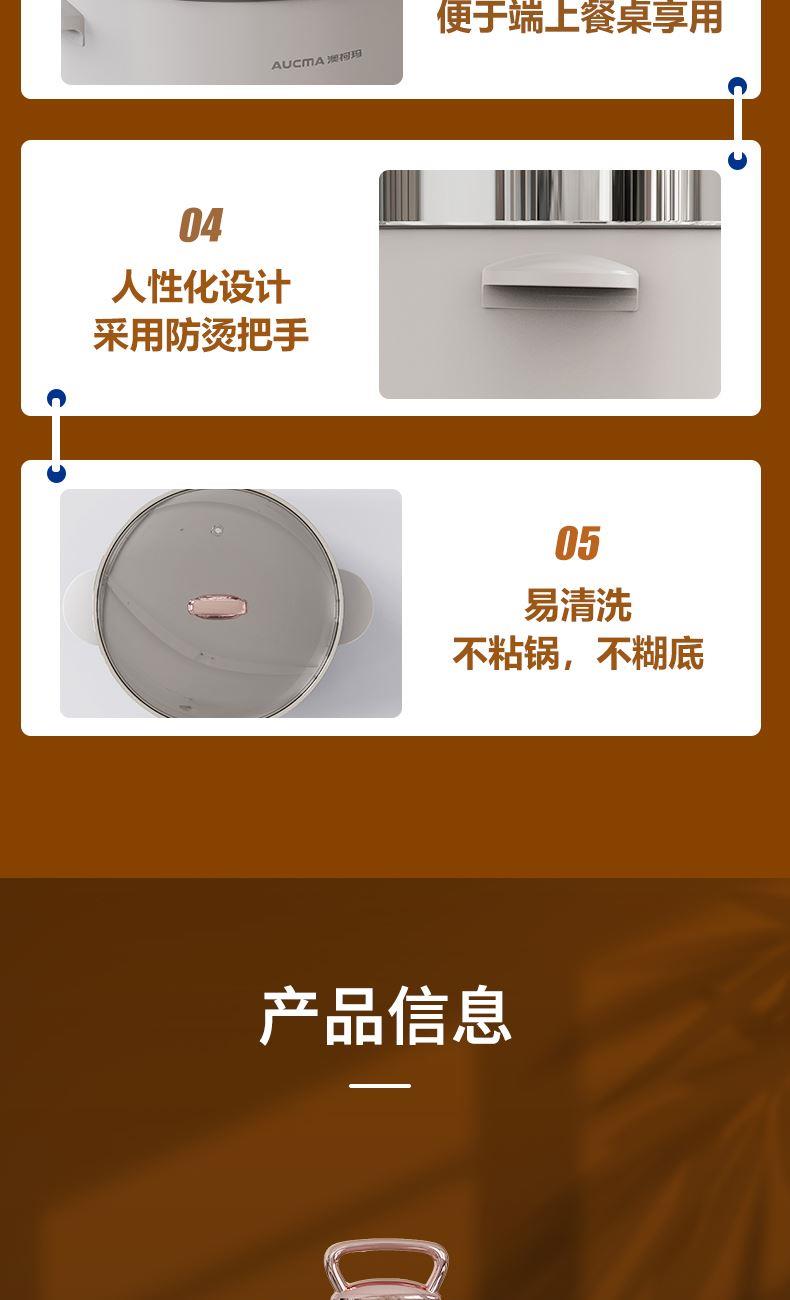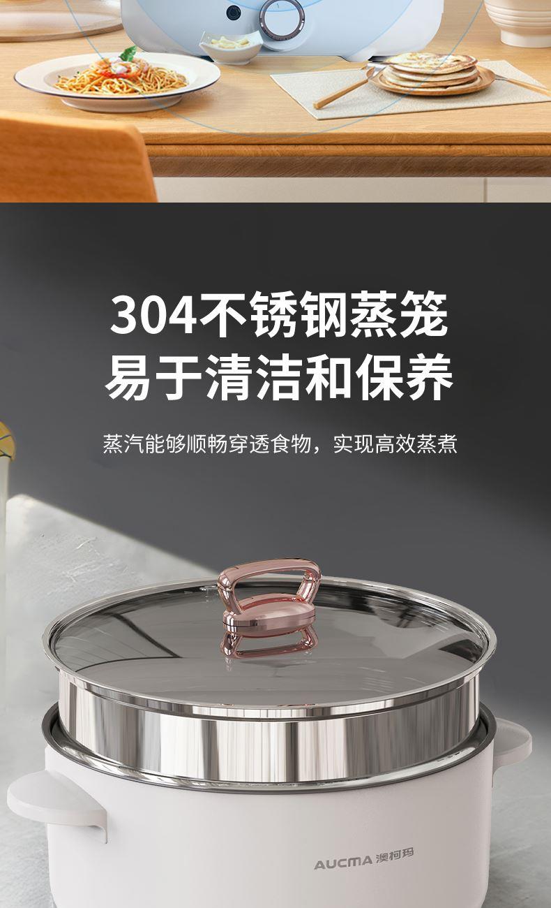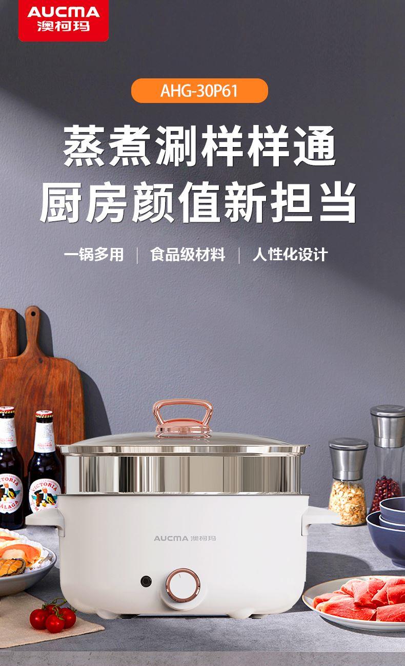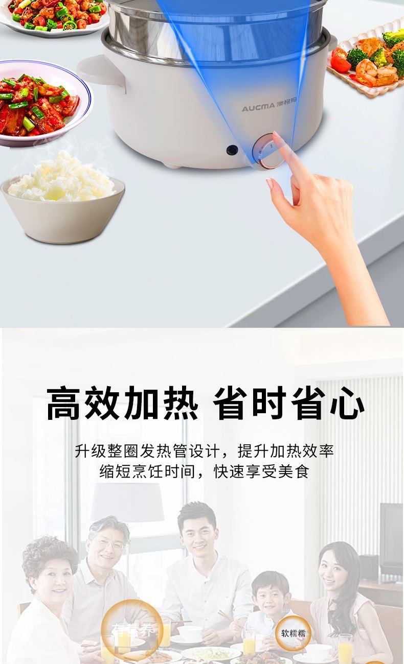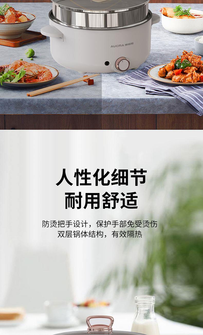 操控方式:旋钮式 额定功率:1000W 容量:3L 档位:2档 颜色:奶白色 内胆材质:特氟龙 一锅多用,产品蒸、煮、涮,轻食早餐,快手料理,美味同步 产品升级整圈发热管,效率高,加热更快 超温断电保护,控温多重防护 产品选用对人体健康安全食品级材料,轻油少烟,易清洗 产品采用防烫把手,操作快捷,双层锅体,隔热更耐用