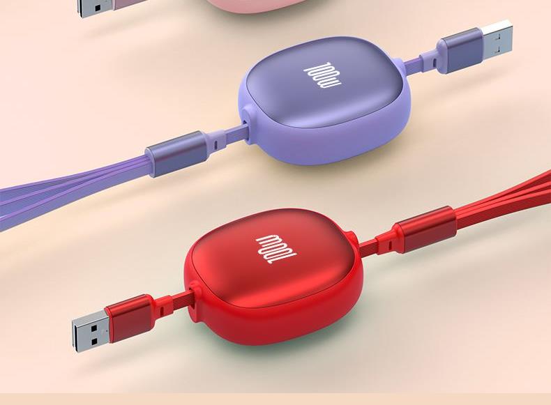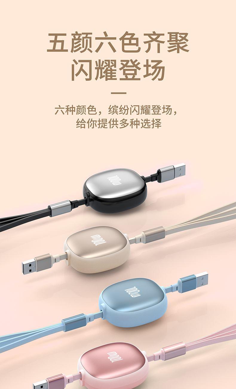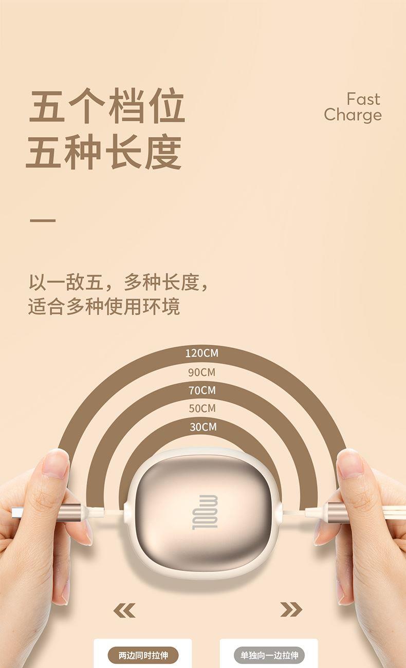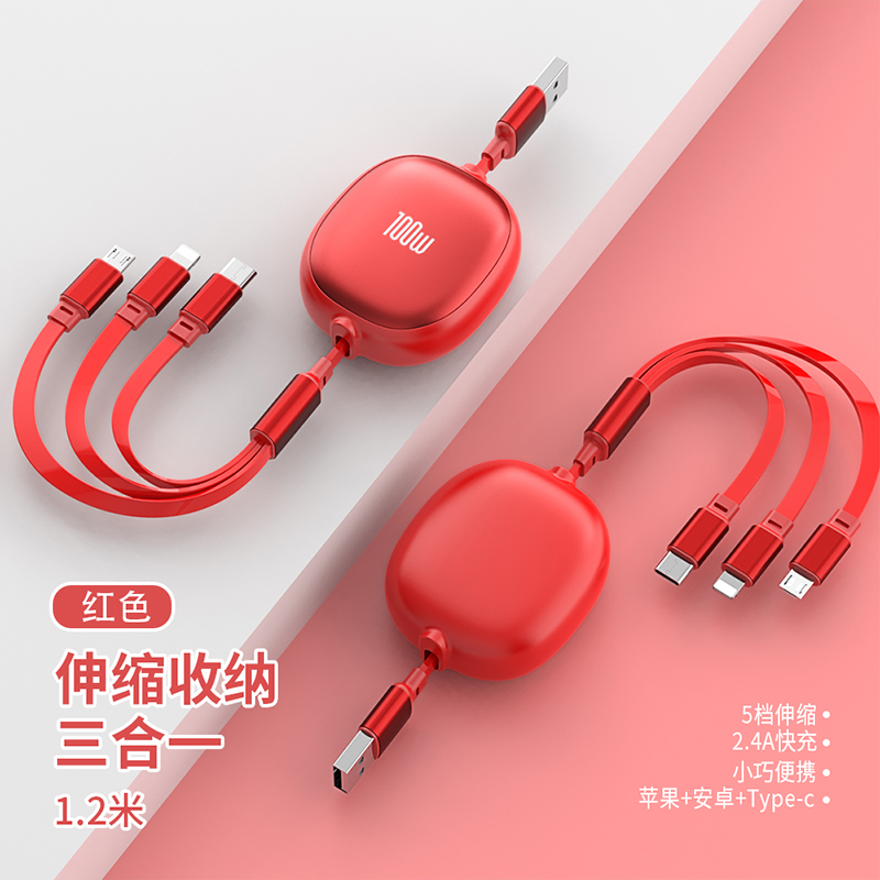 长 度:120cm 材 质:TPE面条线 颜 色:红色 蓝色 粉色 紫色 黑色 米色 接 口:苹果接口 安卓接口 Type-c接口 输出电流:5A 功 能:充电 数据传输 产品重量:52.5g 产品特点: 造型可爱 便于携带 一秒收纳 五档伸缩 更粗铜芯 充电提速 一线三用 兼容所有 支持苹果、安卓、Type-c同时充电