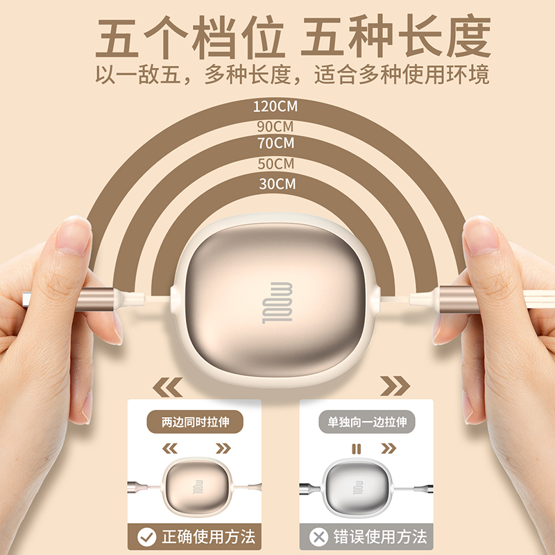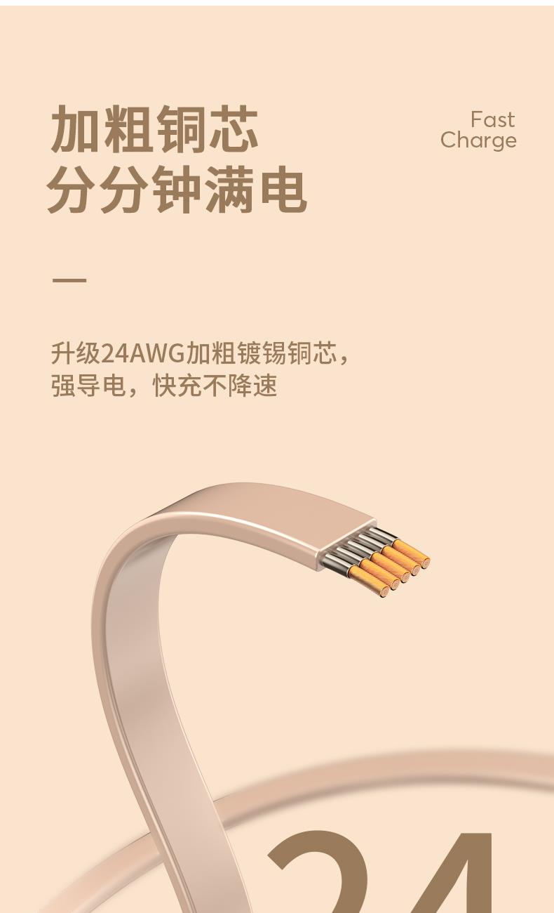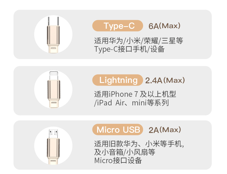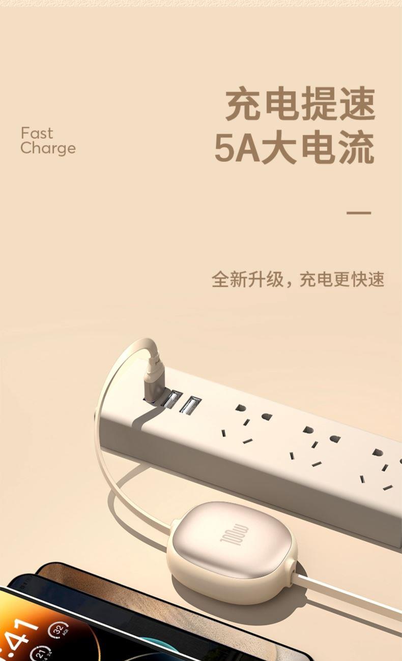长 度:120cm 材 质:TPE面条线 颜 色:红色 蓝色 粉色 紫色 黑色 米色 接 口:苹果接口 安卓接口 Type-c接口 输出电流:5A 功 能:充电 数据传输 产品重量:52.5g 产品特点: 造型可爱 便于携带 一秒收纳 五档伸缩 更粗铜芯 充电提速 一线三用 兼容所有 支持苹果、安卓、Type-c同时充电