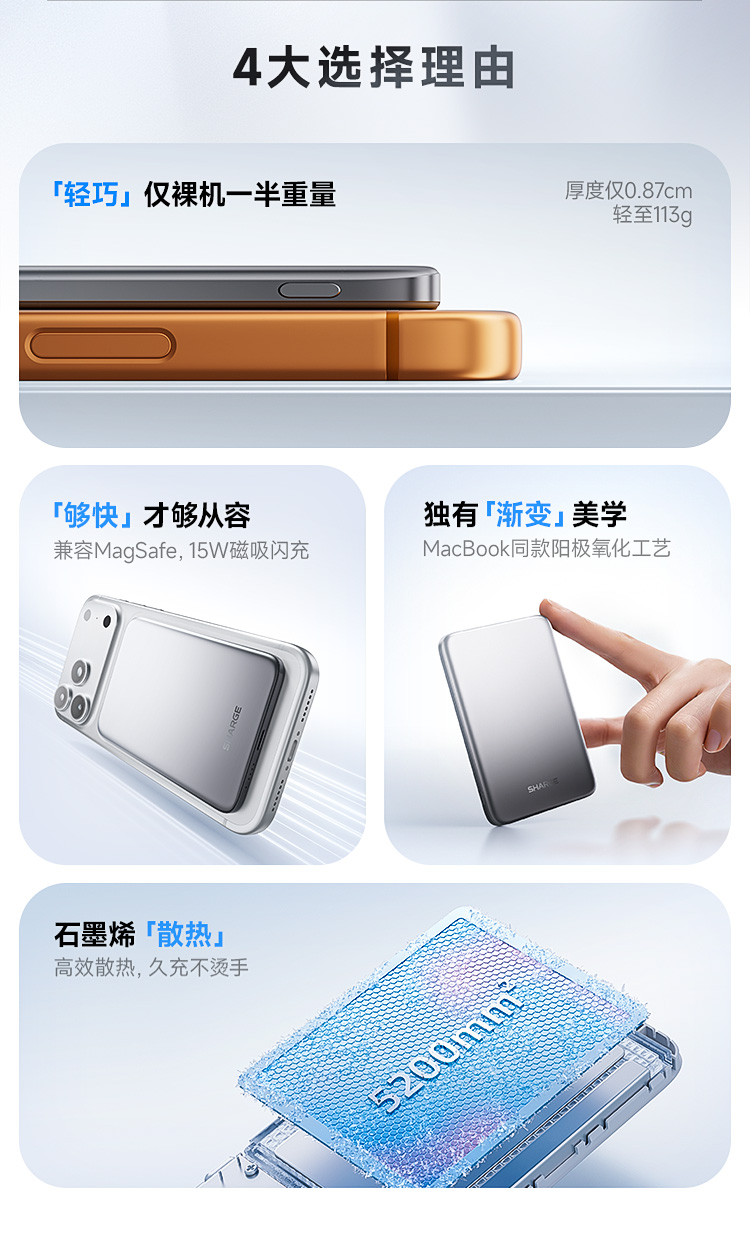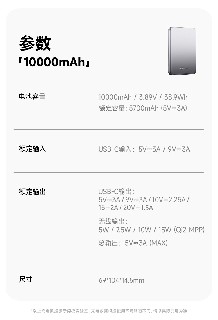 型号:M7 材质:铝合金+硅胶 容量:10000mAh 输出:USB-C:30W Max 总输出:5V⎓3A 无线输出:5W/7.5W/10W/15W Max (Qi2 MPP) 产品尺寸:6.9*10.4*1.45cm 包装尺寸:14*9.7*2cm 10000mAh,3C安全认证 Qi2真无线15W+有线30W,二合一快充 轻190g,手感亲肤细腻 独特渐变效果,金属阳极氧化工艺 兼容PD3.0/PPS/QC/FCP/SCP等快充协议