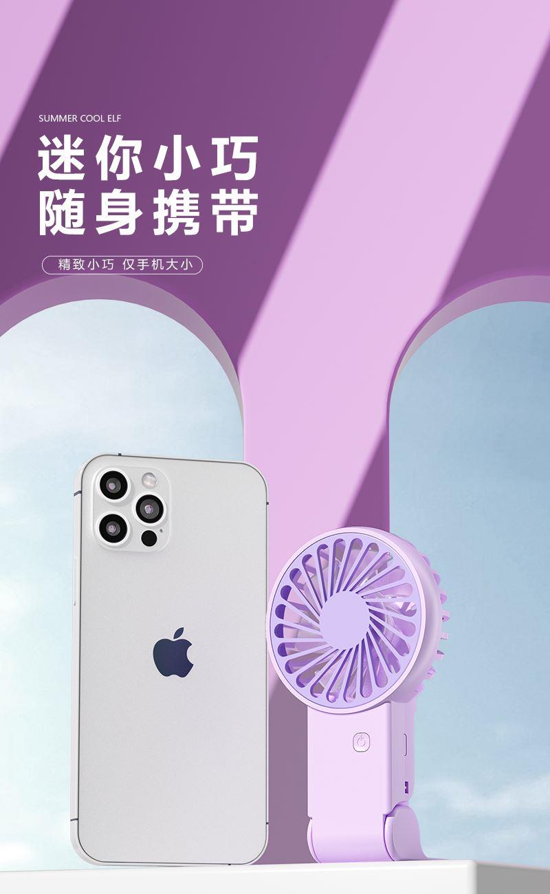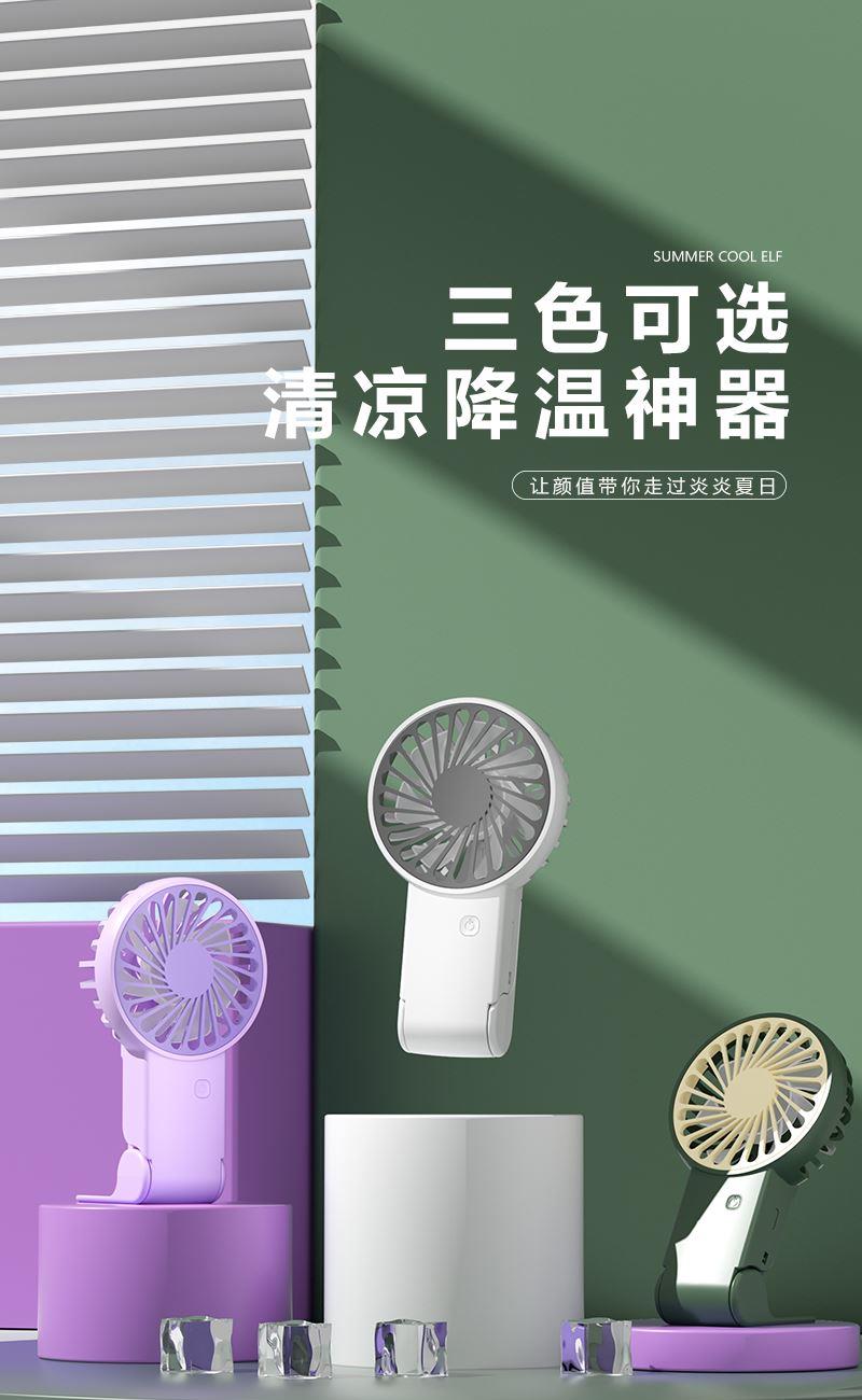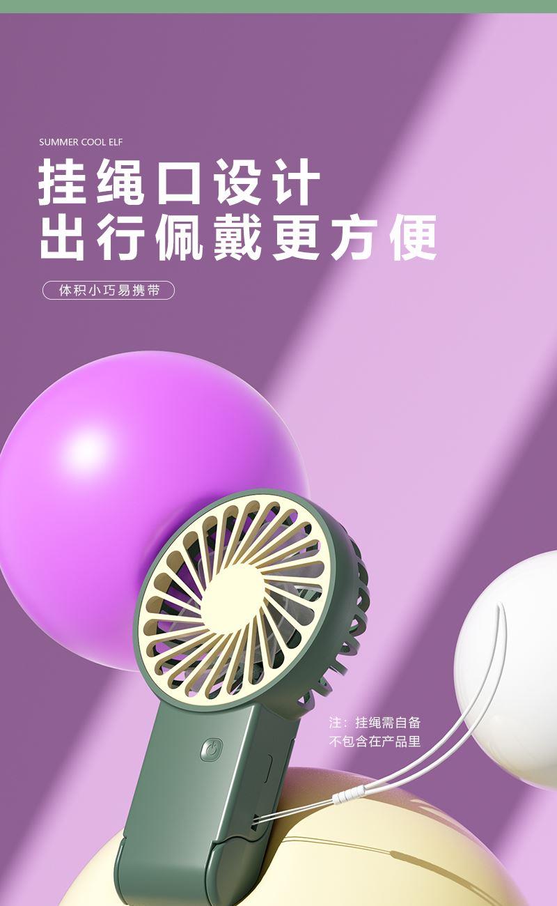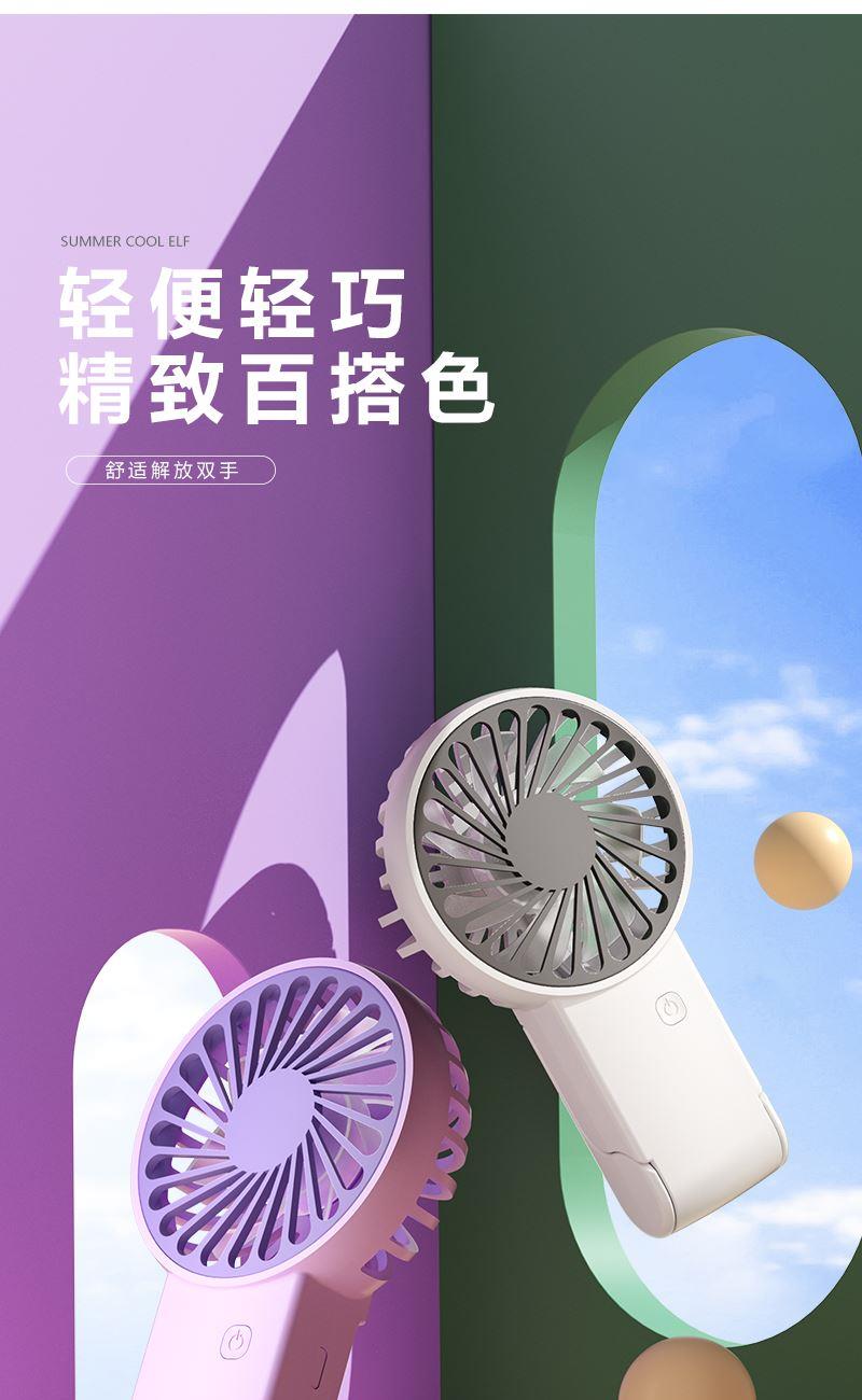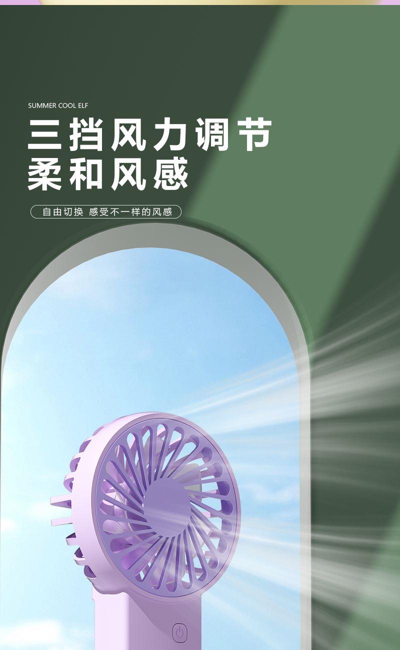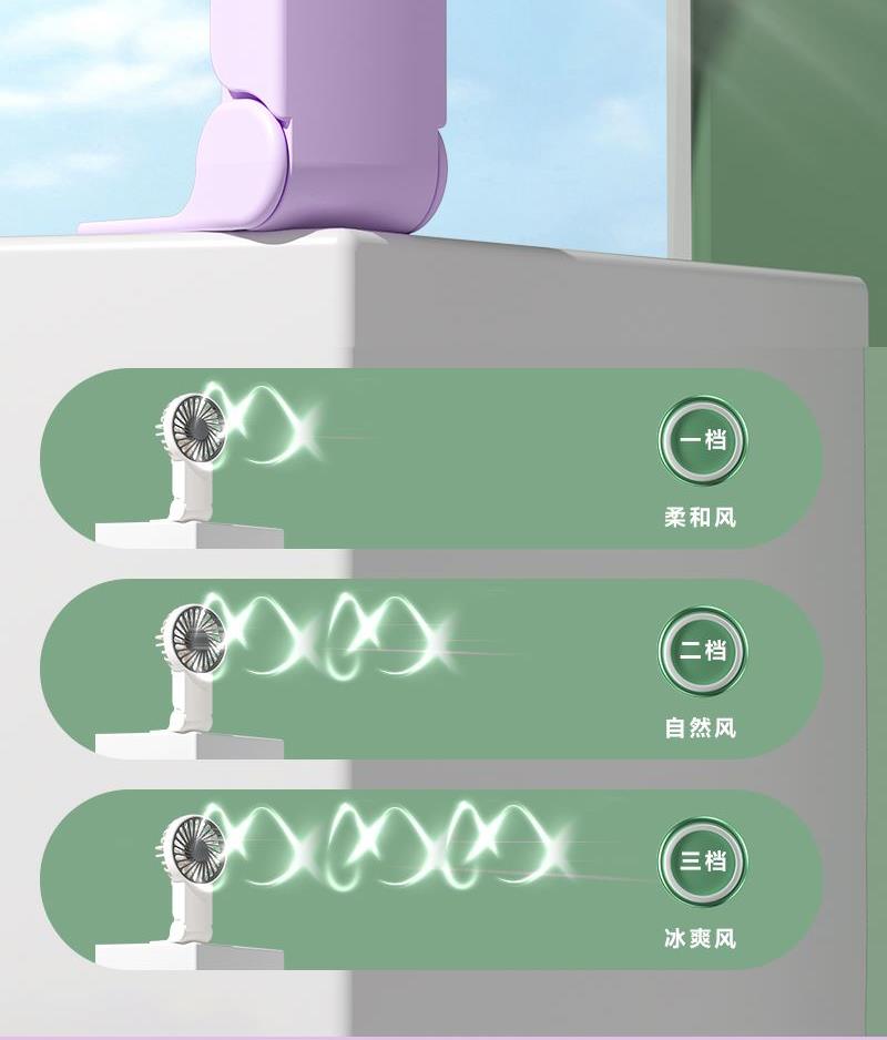 【推荐理由】: 精致小巧,方便携带 可户外手持,可立桌面 多场景 三档风速可调 底座90°翻转 颜色:绿色 白色 紫色 尺寸:144*82*30mm 容量:300mAh 包装:彩盒包装