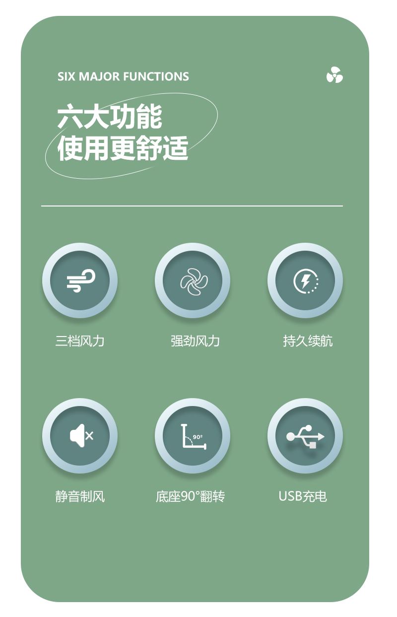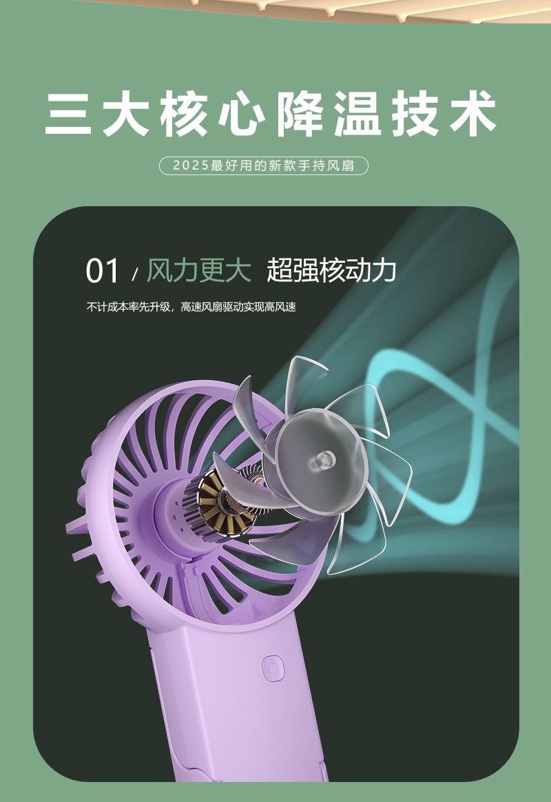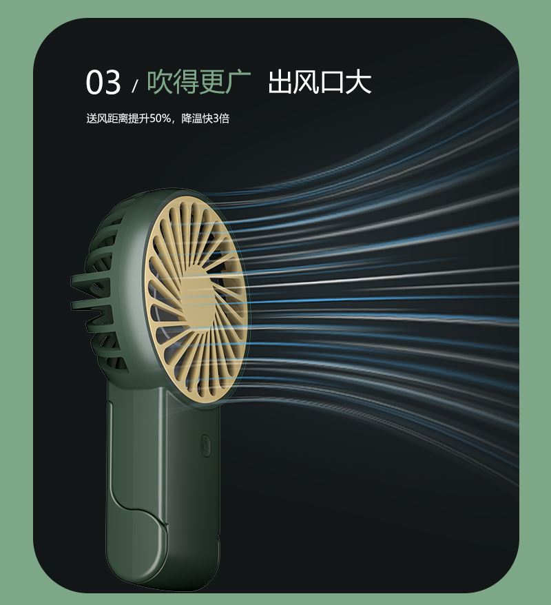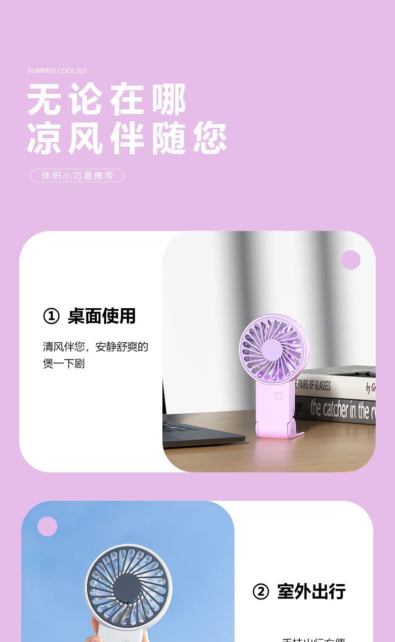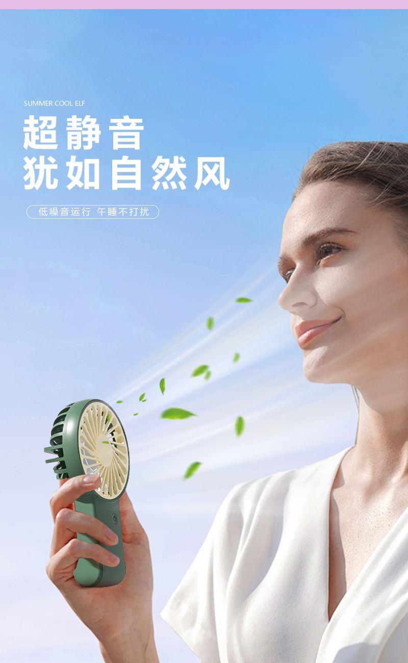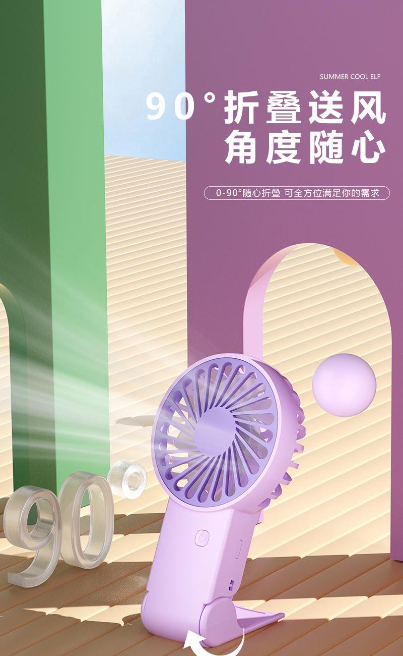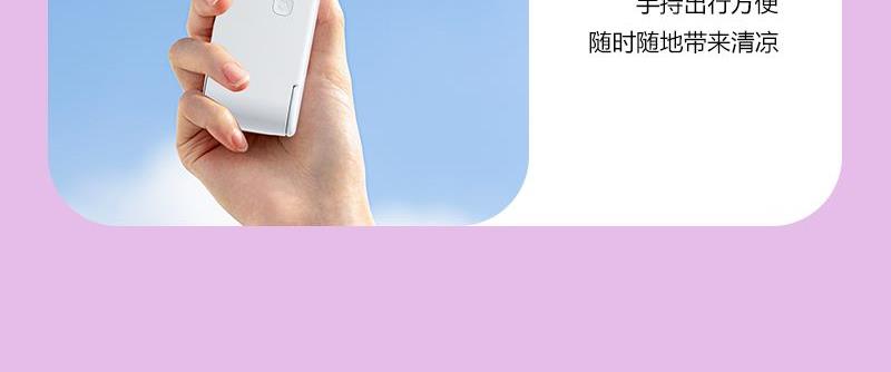 【推荐理由】: 精致小巧,方便携带 可户外手持,可立桌面 多场景 三档风速可调 底座90°翻转 颜色:绿色 白色 紫色 尺寸:144*82*30mm 容量:300mAh 包装:彩盒包装