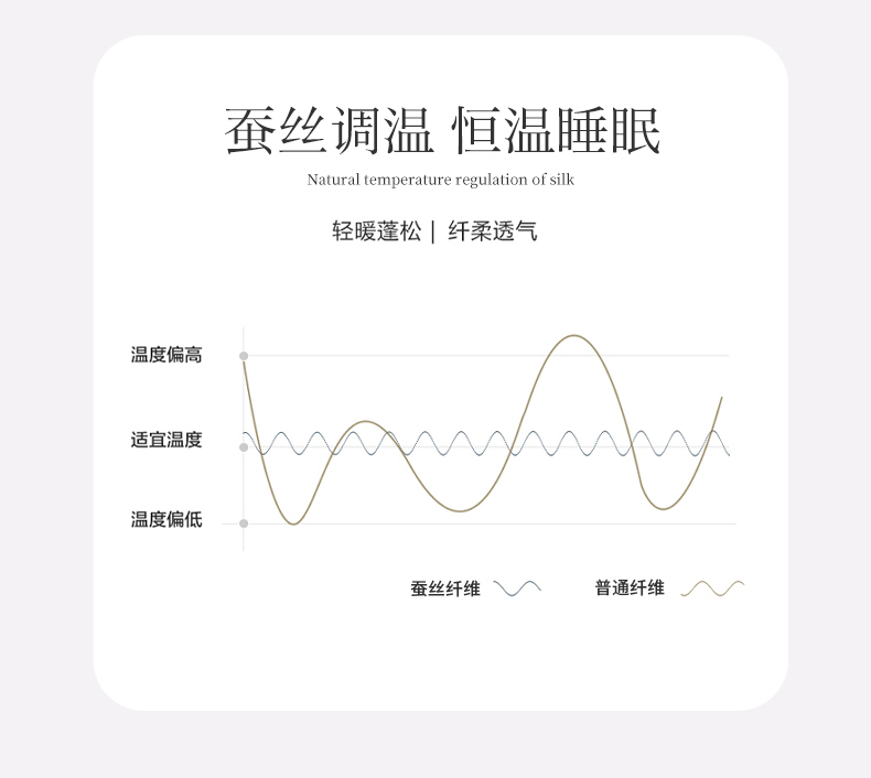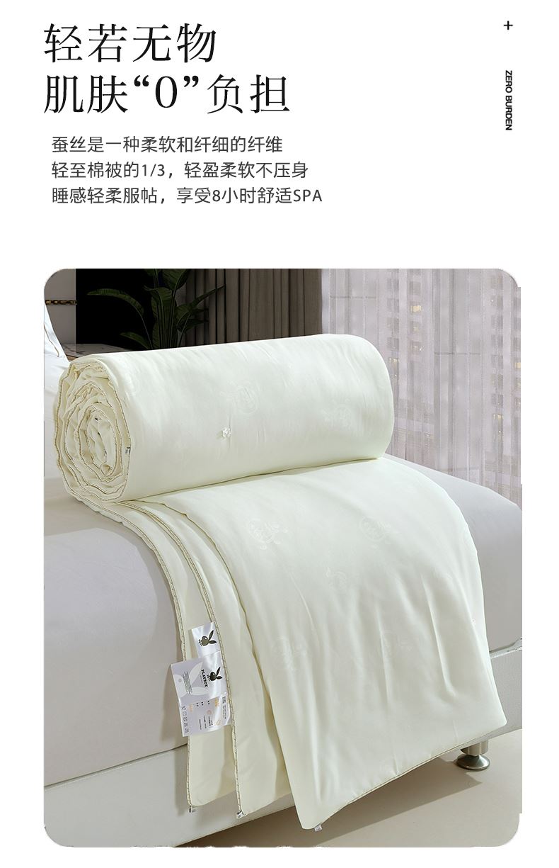 规格:200*230cm 面料:华夫格(聚酯纤维) 填充:蚕丝 重量:1500克 执行标准:GB/T22796-2021 安全类别:GB18401-2010 B类 1.蚕丝的多孔隙结构,自带呼吸感,能够使被芯内温度保持舒适,更适合东方人的睡眠环境。同时青桑有机蚕丝做成的被芯更蓬松,既保暖又不重这种平衡感,可以让人更好入睡,睡得更舒服。