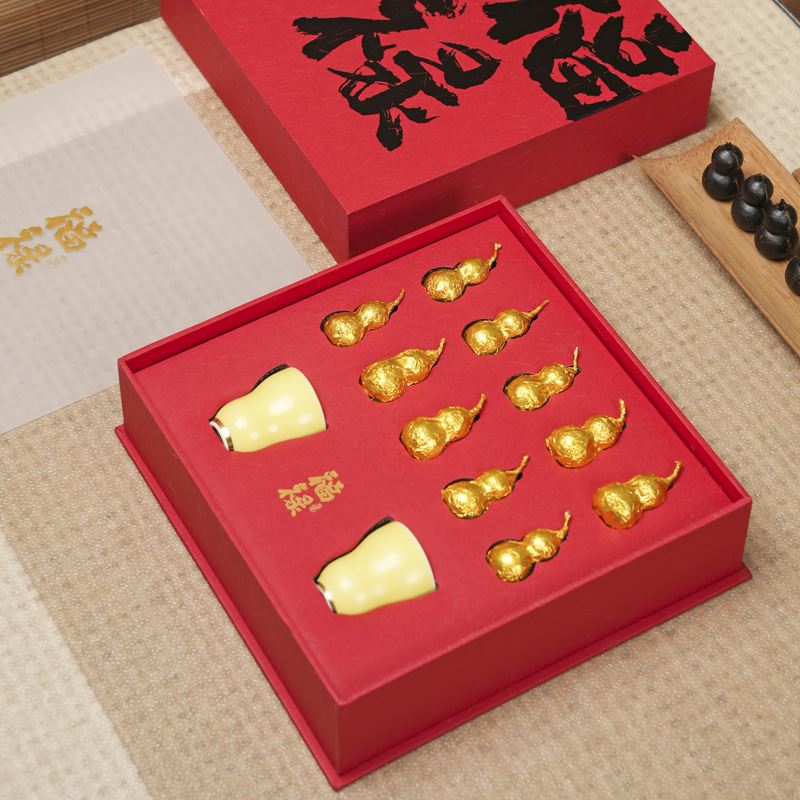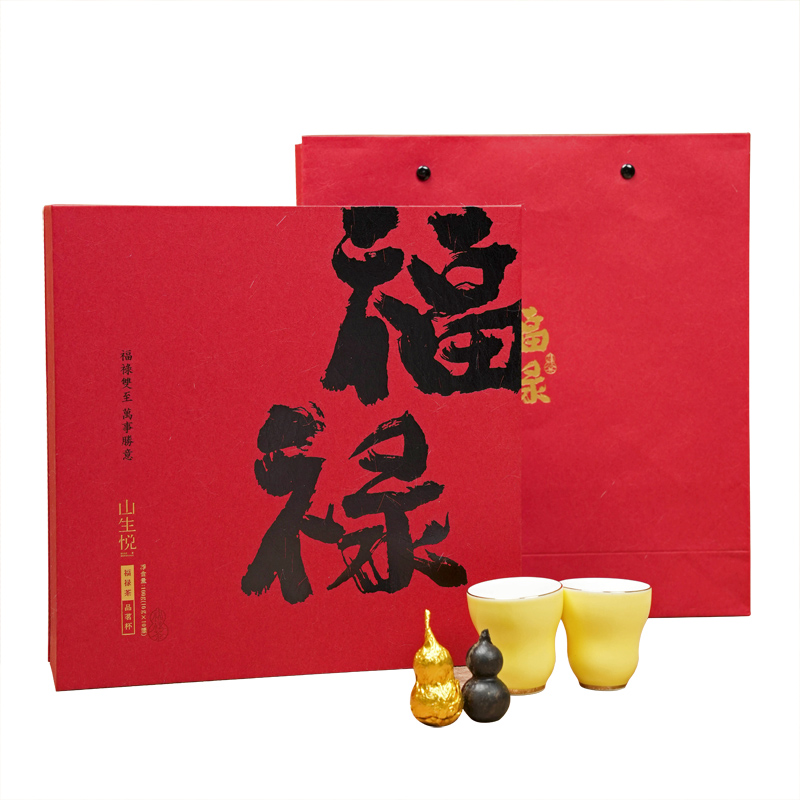 产品配置:福禄茶10颗 福禄茶杯2个 礼盒尺寸:220×220×60mm 净含量:100g 整个礼盒的设计以红色为主色调,搭配书法字体“福禄”,突出了传统文化的元素。礼盒内部放置八个葫芦茶,寓意着吉祥和祝福。礼盒整体设计简洁大方,既具有实用价值又有传统文化的内涵。