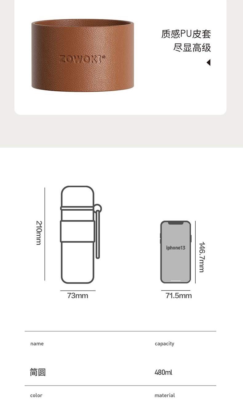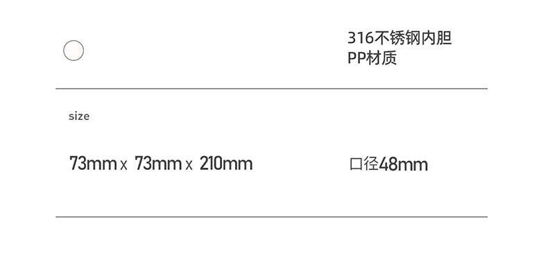 容量:480ml|净重:272g口径:48mm材质:316不锈钢(内胆) 304不锈钢(外壳)PP+不锈钢(杯盖)产品尺寸:73mm*210mm