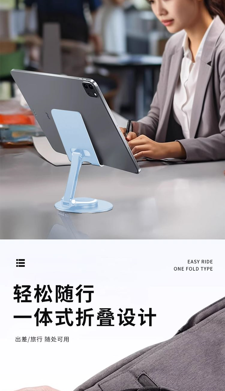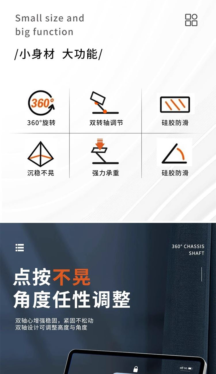 颜 色: 蓝色 材 质:碳素钢+硅胶 产品尺寸:177*105*40mm 包装尺寸:10.2*8.7*3.6cm 产品净重:215g 360度旋转,阻尼效果,大面积硅胶防滑,全金属,大尺寸-可兼容平板,多角度调节,一体折叠便携,底座高密度纯 铁冲压喷漆工艺,圆形设计,更稳固,定制方便