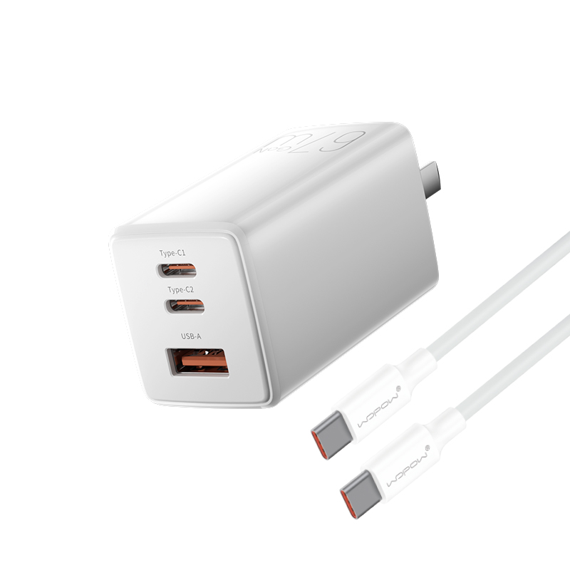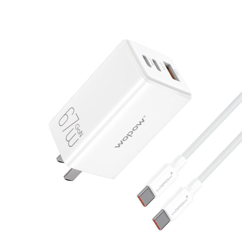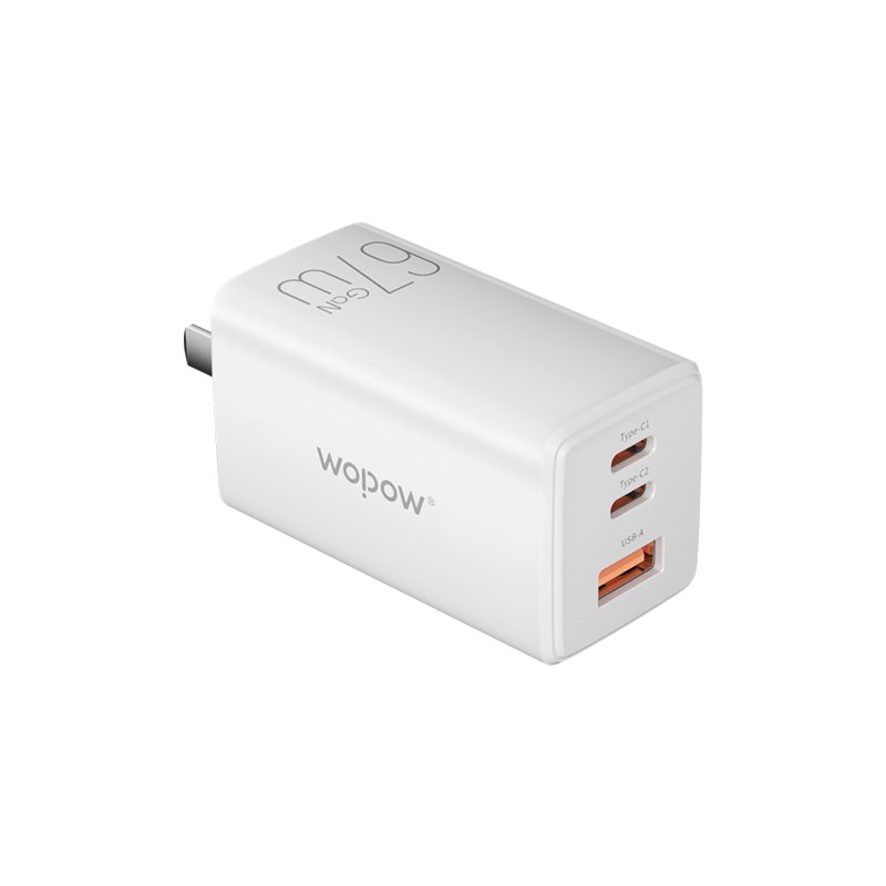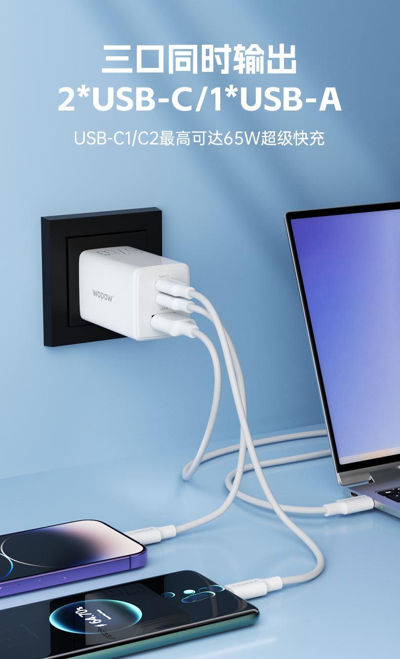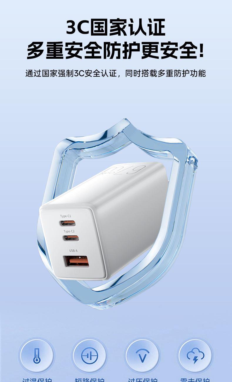 产品尺寸:31.9*37.1*64.2 mm 包装尺寸:90*45*140mm 产品重量:113g 输入:100-240V~50/60Hz 输出USB-C1/C2:5V 3A,9V 3A,12V 3A,15V 3A,20V 3.25A (67Wmax) 输出(USB-A): 5V 3A,9V 2A,12V 1.5A,10V 2.25A (22.5WMax) 输出USB-C1+USB-A:45W+18W (63Wmax) 输出USB-C1+USB-C2:45W+20W (65Wmax) 输出USB-C2+USB-A:7.5W+7.5W (15Wmax) 输出USB-C1+USB-C2+USB-A:45W+7.5W+7.5W (60Wmax) 颜色:白 材质:ABS+PC 配LC970数据线