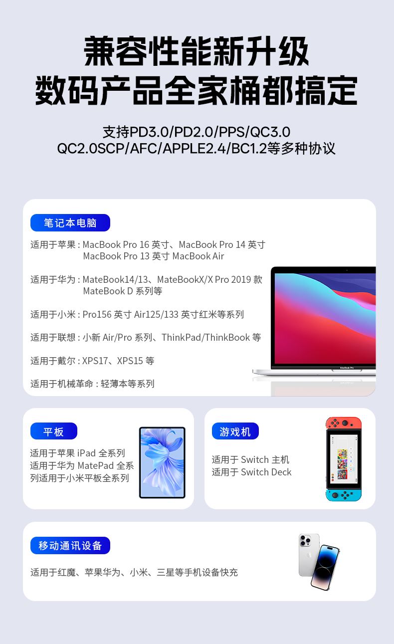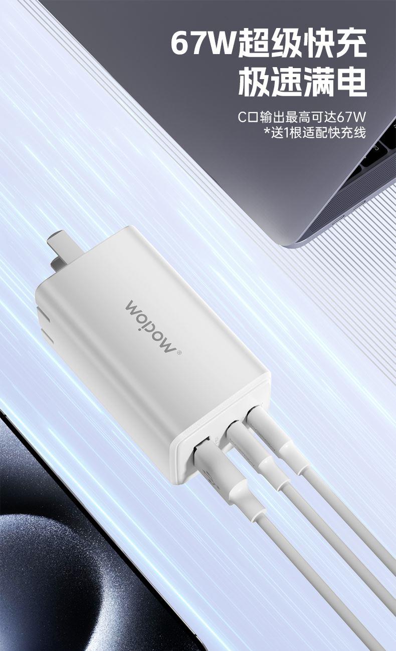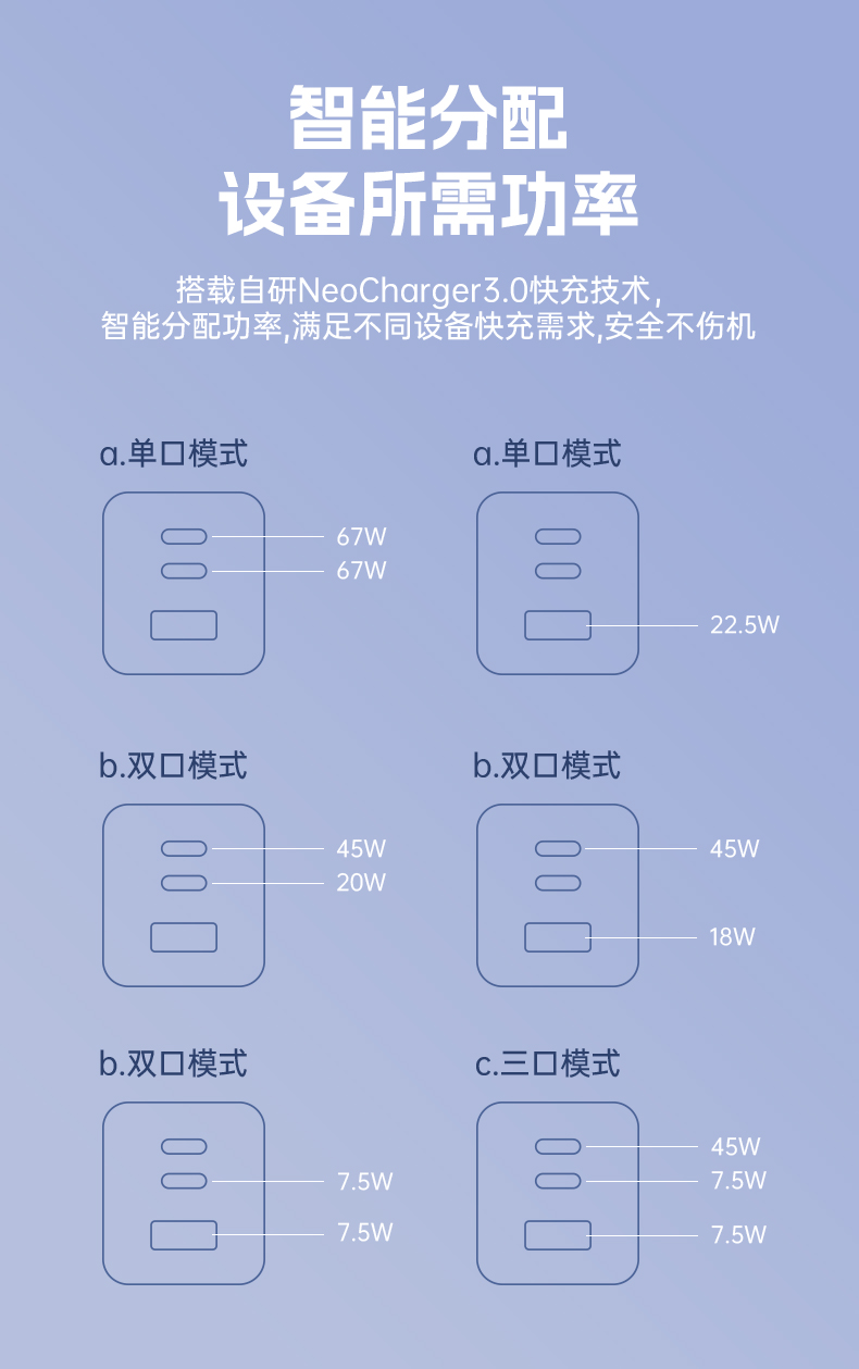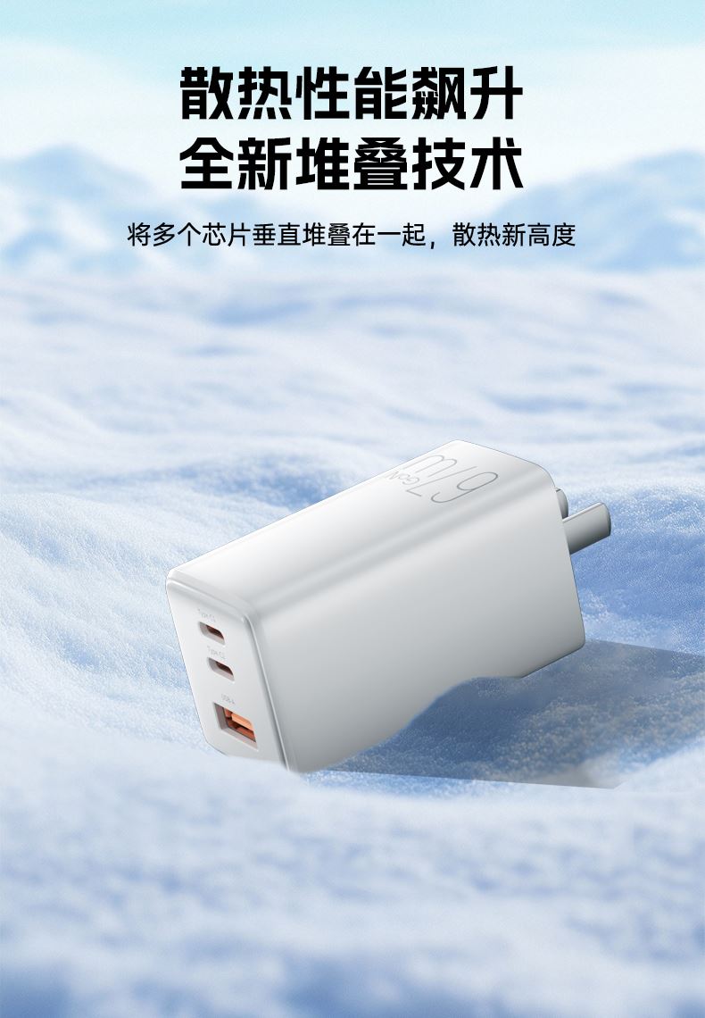 产品尺寸:31.9*37.1*64.2 mm 包装尺寸:90*45*140mm 产品重量:113g 输入:100-240V~50/60Hz 输出USB-C1/C2:5V 3A,9V 3A,12V 3A,15V 3A,20V 3.25A (67Wmax) 输出(USB-A): 5V 3A,9V 2A,12V 1.5A,10V 2.25A (22.5WMax) 输出USB-C1+USB-A:45W+18W (63Wmax) 输出USB-C1+USB-C2:45W+20W (65Wmax) 输出USB-C2+USB-A:7.5W+7.5W (15Wmax) 输出USB-C1+USB-C2+USB-A:45W+7.5W+7.5W (60Wmax) 颜色:白 材质:ABS+PC 配LC970数据线