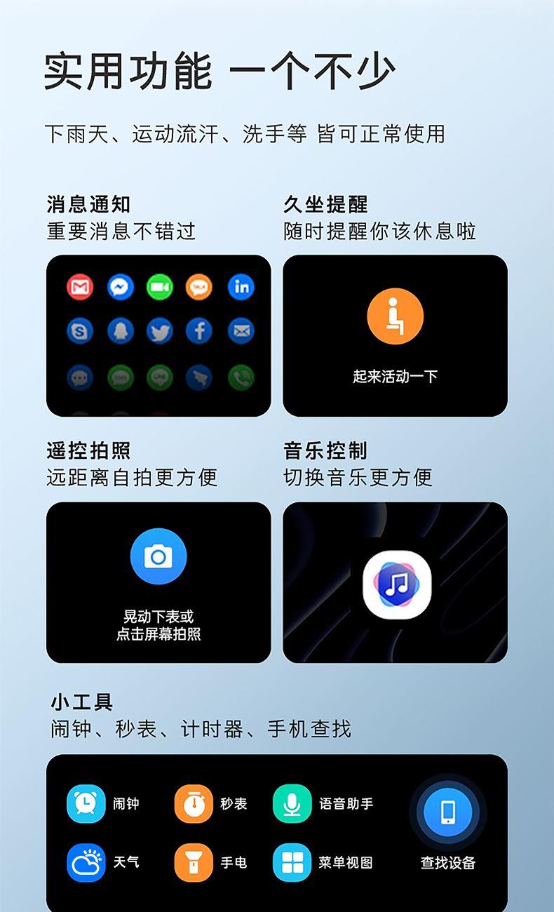 1.83英寸TFT高清屏,240*284分辨率、电池230mAh、健康提醒、心率/血氧/血压监测、蓝牙通话、蓝牙音乐、睡眠监测、来电接听、短信提醒、社交APP消息提醒(支持微信,QQ)、闹钟提醒、久坐提醒、多种种运动、翻腕亮屏、女性健康、寻找手环、远程拍照、勿扰模式、表盘自定义、云端后台海量表盘、本地语音功能控制、支付宝、NFC、音乐控制、天气等;
