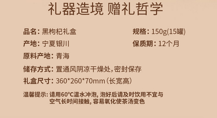 品 名:黑枸杞礼盒 产地:宁夏银川 规格:150g(15罐) 保质期:12个月 原料产地:青海 储存方式:置通风阴凉干燥处,密封保存 礼盒尺寸:360*260*70mm(长宽高) 温馨提示:请用60°C温水冲泡,泡好后请及时饮用不宜与 空气长时间接触,容易氧化使茶汤变色