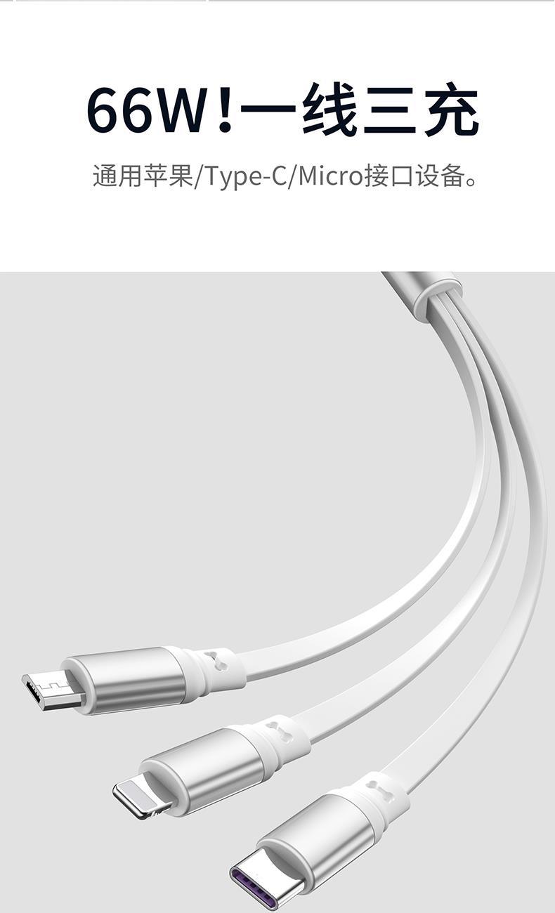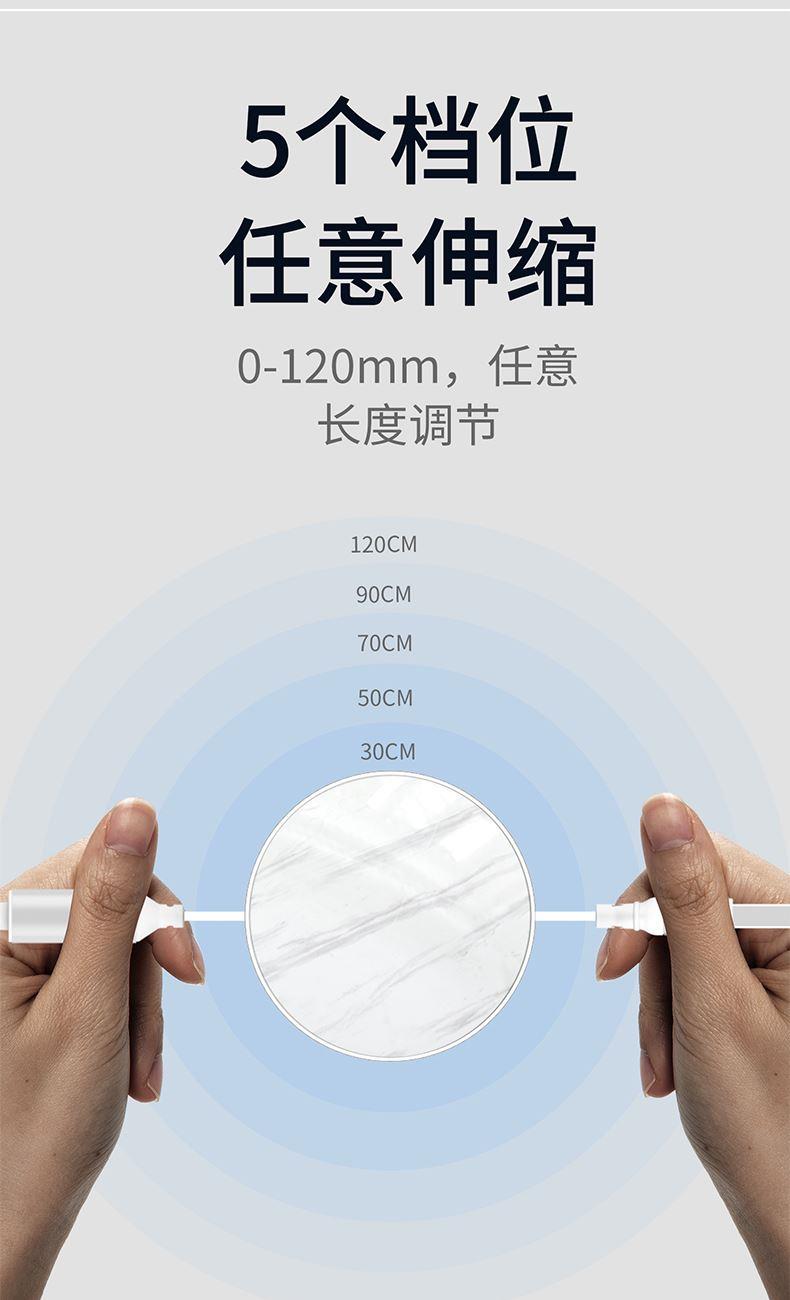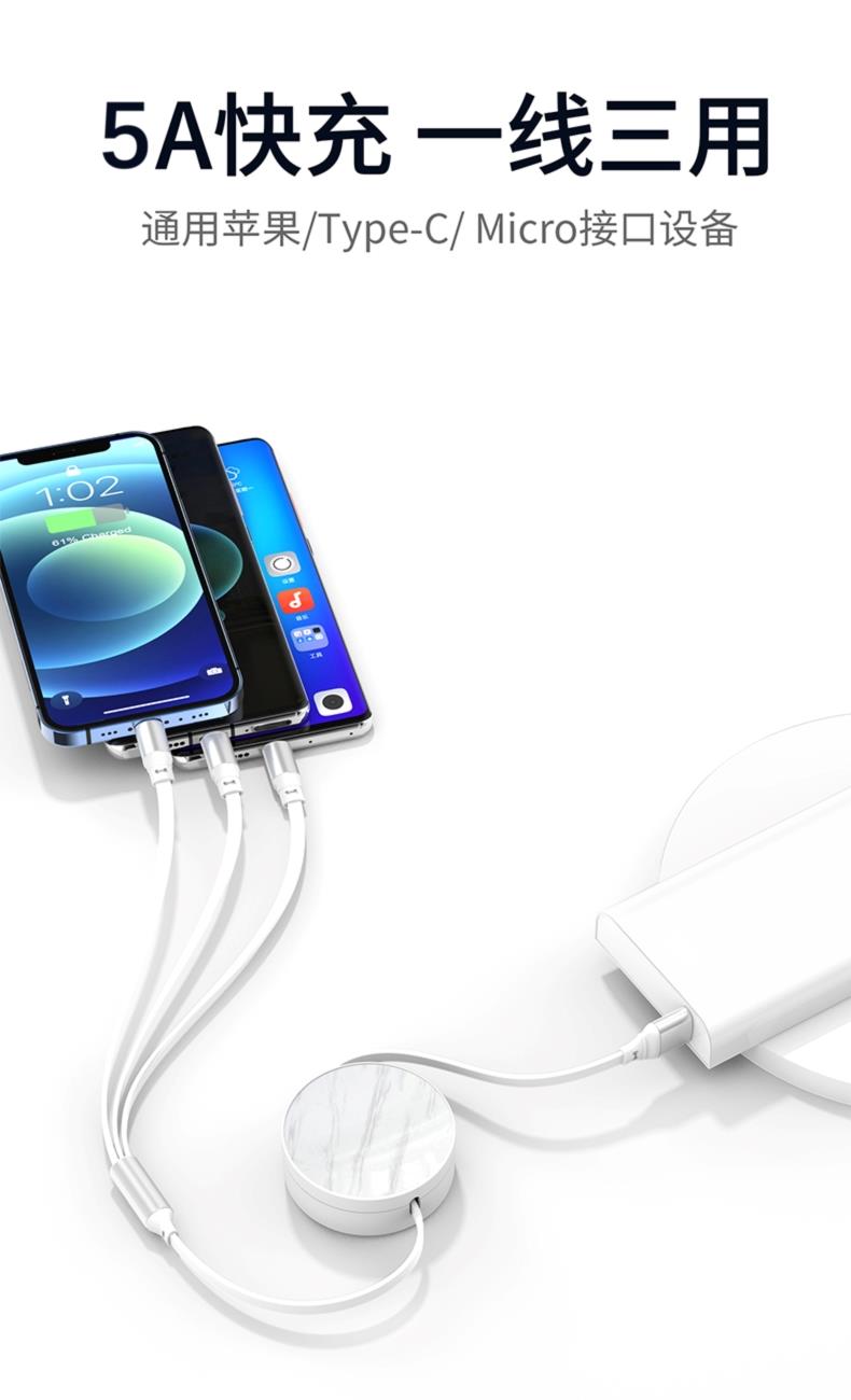 长 度:120cm 材 质:TPE面条线 颜 色:白色 黄色 蓝色 粉色 绿色 接 口:苹果接口 安卓接口 Type-c接口 输出电流:5A 功 能:充电 产品净重:54g 产品特点: 五档伸缩 线长随意调节 智能5A快速充电 更安全 加粗低阻铜丝 安全提速充电 支持苹果、安卓、Type-c同时充电
