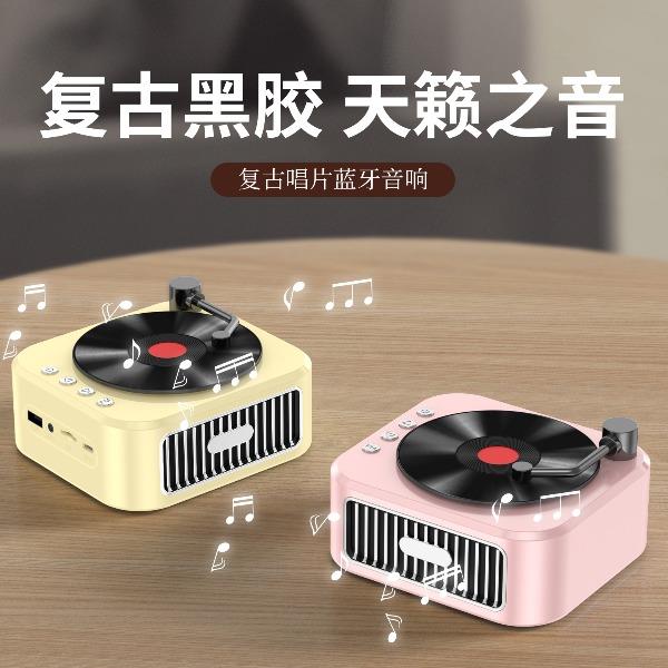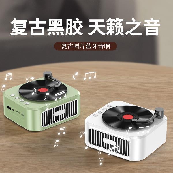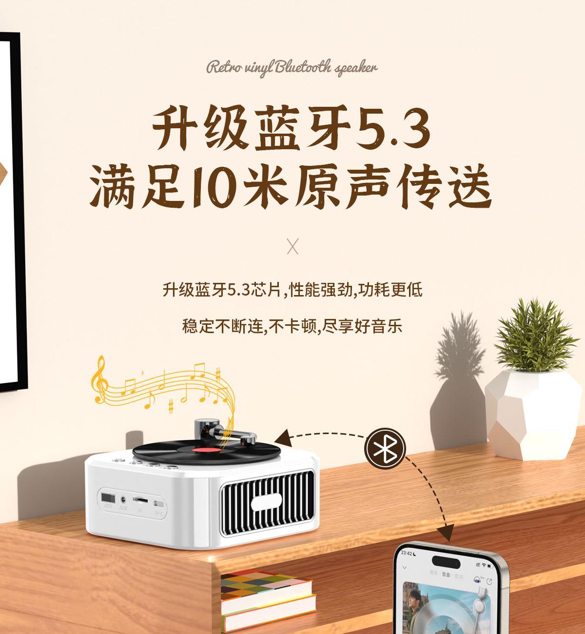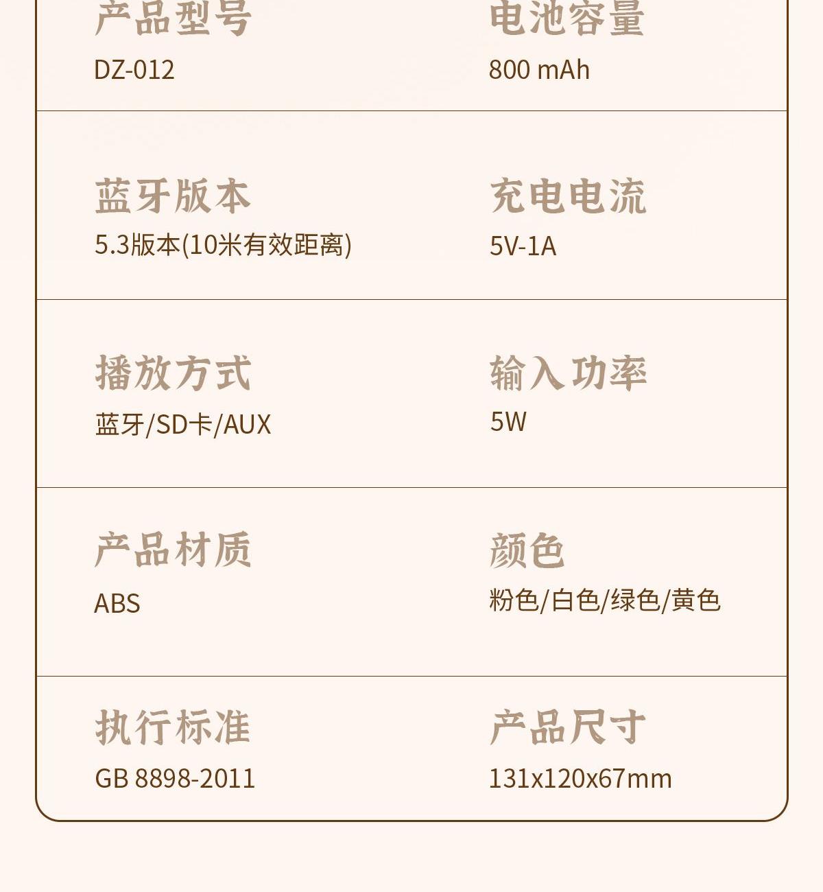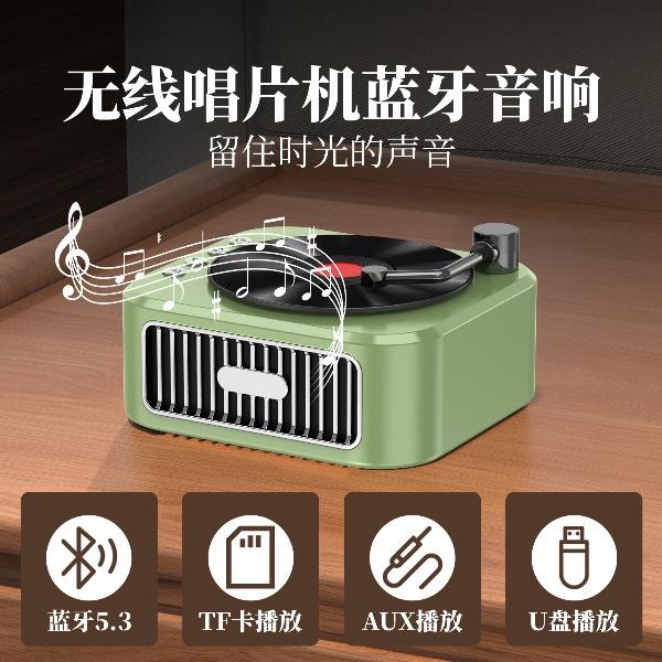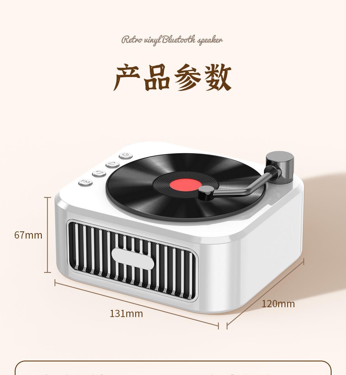 产品材质:ABS 蓝牙版本:5.3 喇叭功率:5w 传输范围:10米 充电电压:5V/1A 使用时间:4-6h 电池容量:800mAh 产品颜色:白色、粉色、绿色 、黄色 产品尺寸:131*120*67mm 产品重量: 385g 产品包装尺寸:135*126*72mm (瓦楞纸盒) 产品卖点:复古唱片悠然转动,蓝牙5.3版本,音响锂电池800mAh,连接一次后蓝牙有记忆功能开机即连,音响正常可播放4-6小时,充电5V-1A,带氛围灯功能,带FM收音机功能,充电有指示灯。
