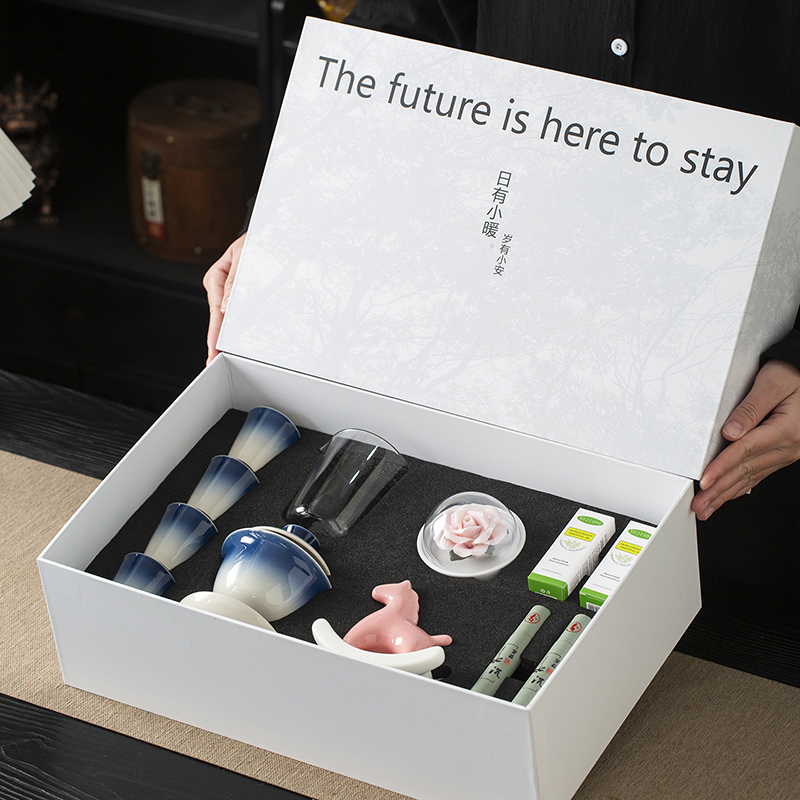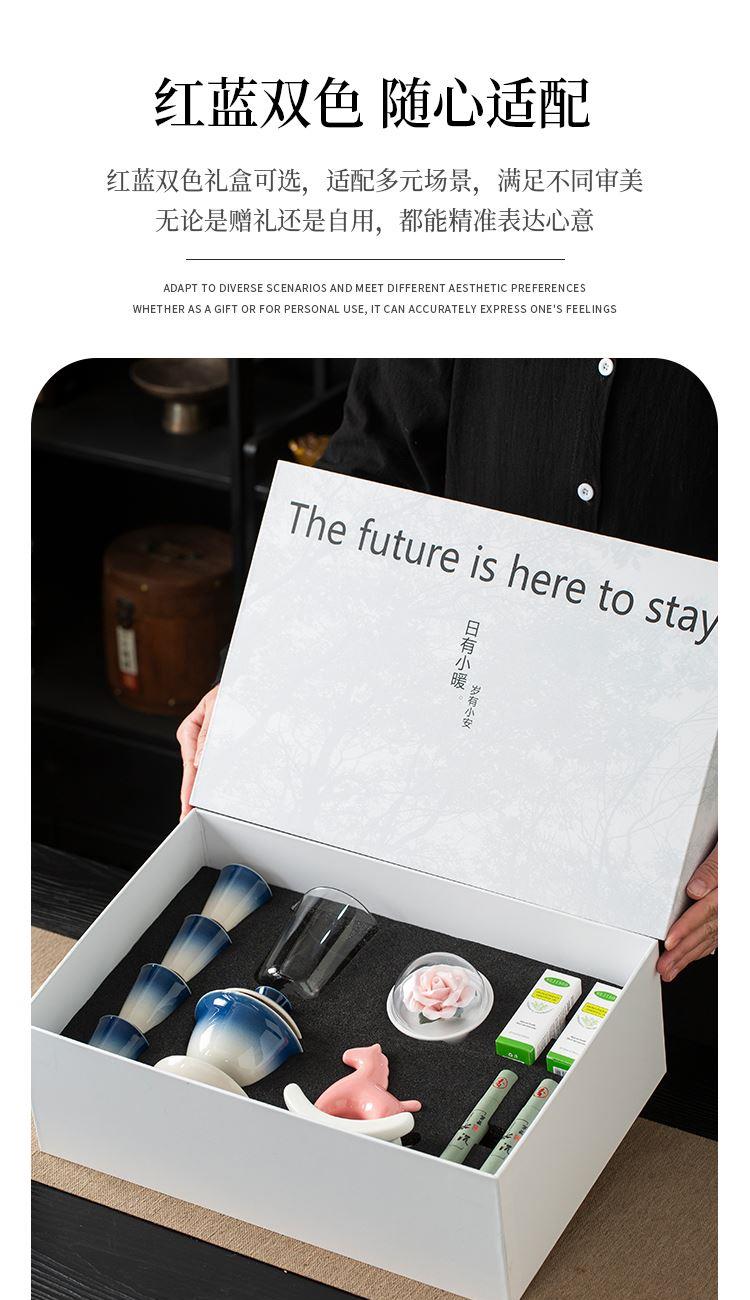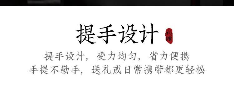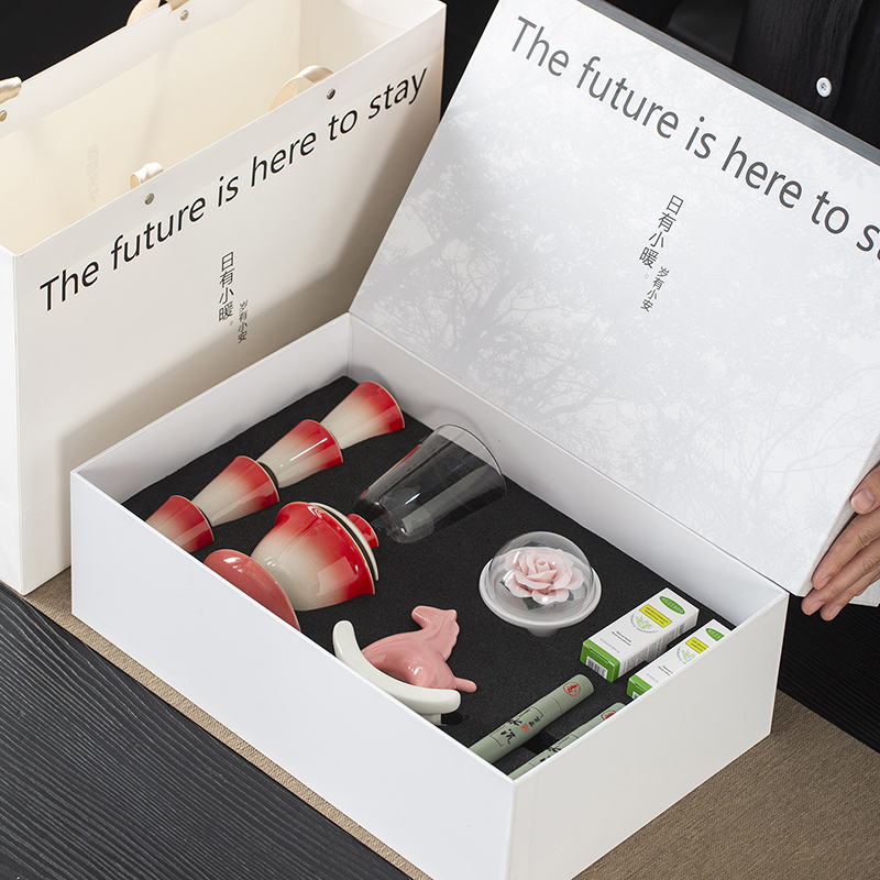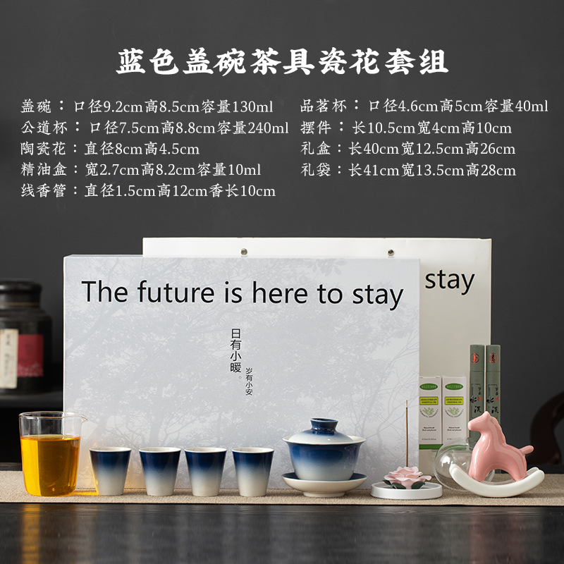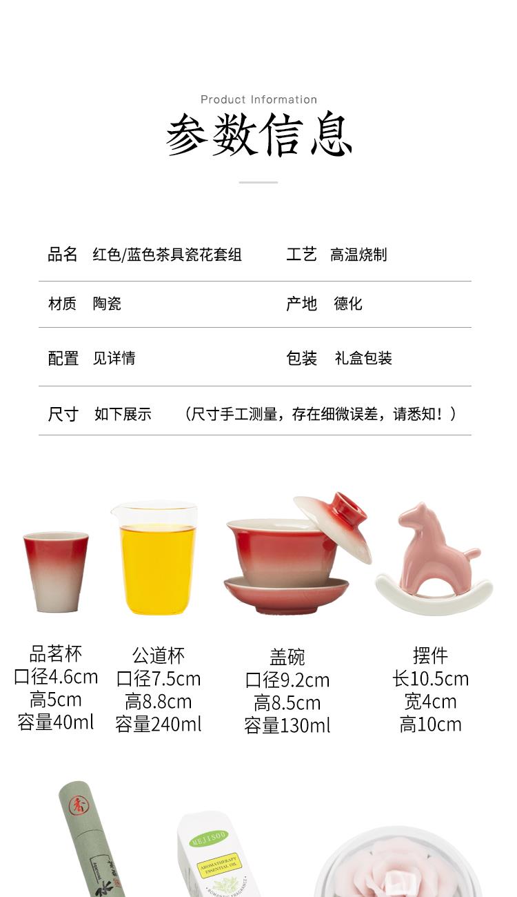 配置:三才盖碗*1 茶杯*4 玻璃公道杯*1 陶瓷摇摇马*1 手捏陶瓷花*1 香薰精油*2 线香*2 礼盒*1 手提袋*1 材质:高白瓷 礼盒尺寸:39cm*13.5cm*26cm 产品尺寸:茶杯: 容量:40ml 盖碗: 容量:130ml 公杯:容量:240ml 陶瓷花:直径5cm 精油容量:10ml 线香长度10cm 摇摇马尺寸:10.5cm*4cm*10cm