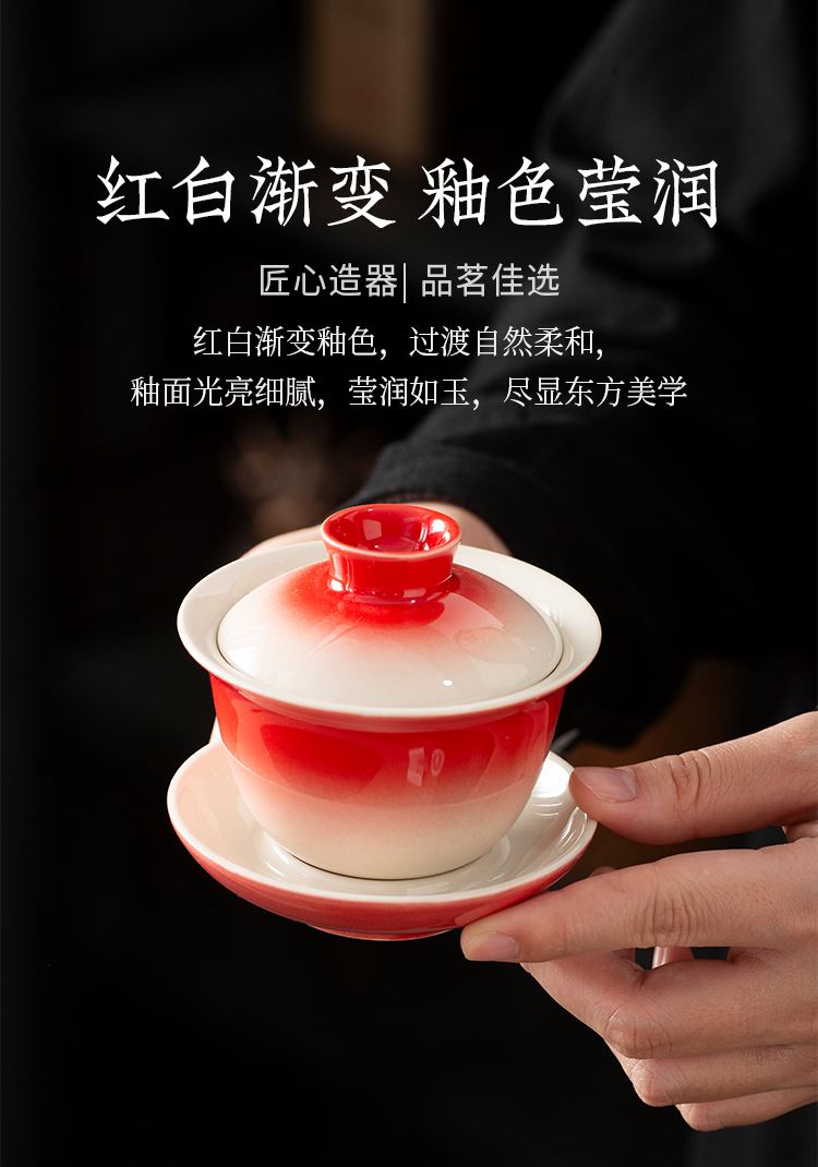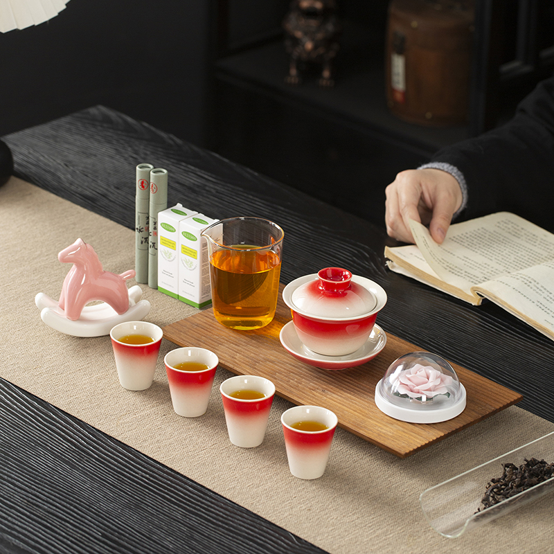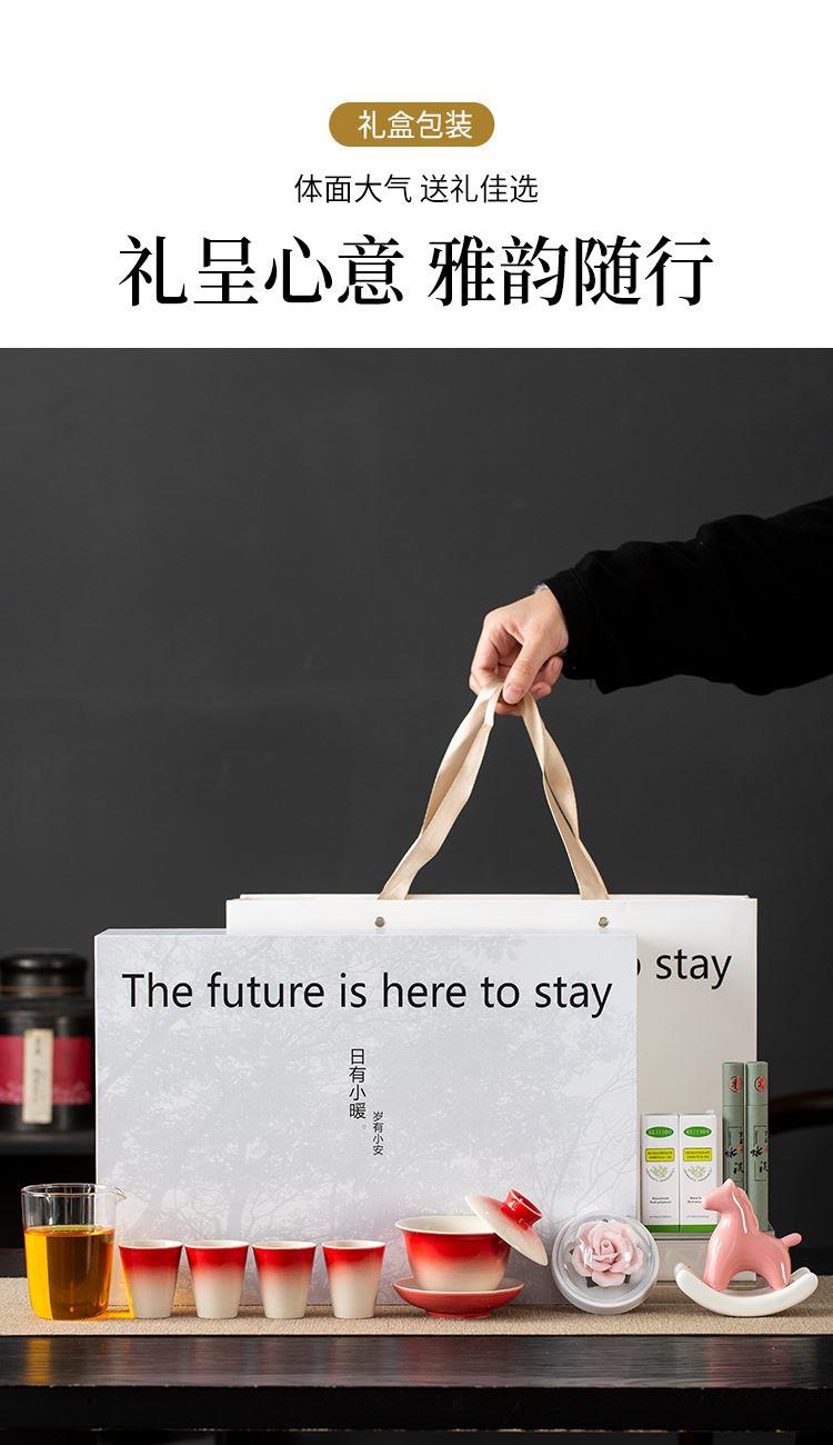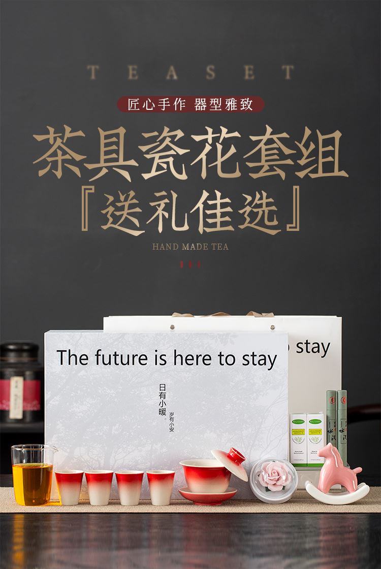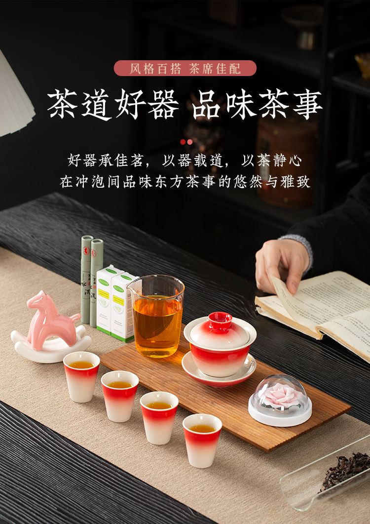 配置:三才盖碗*1 茶杯*4 玻璃公道杯*1 陶瓷摇摇马*1 手捏陶瓷花*1 香薰精油*2 线香*2 礼盒*1 手提袋*1 材质:高白瓷 礼盒尺寸:39cm*13.5cm*26cm 产品尺寸:茶杯: 容量:40ml 盖碗: 容量:130ml 公杯:容量:240ml 陶瓷花:直径5cm 精油容量:10ml 线香长度10cm 摇摇马尺寸:10.5cm*4cm*10cm