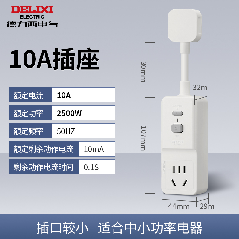 德力西电气柔性漏电保护插座 一位五孔 10A 产品型号:DE-LBZS 额定电流:10A 额定功率:2500W 额定电压:250V 额定频率:50HZ 额定剩余动作电流:10mA 剩余动作电流时间:0.1S 工作温度范围:-5℃~40℃ 插座尺寸:44*107*32/29 产品线长:30mm 执行标准:GB/T 20044