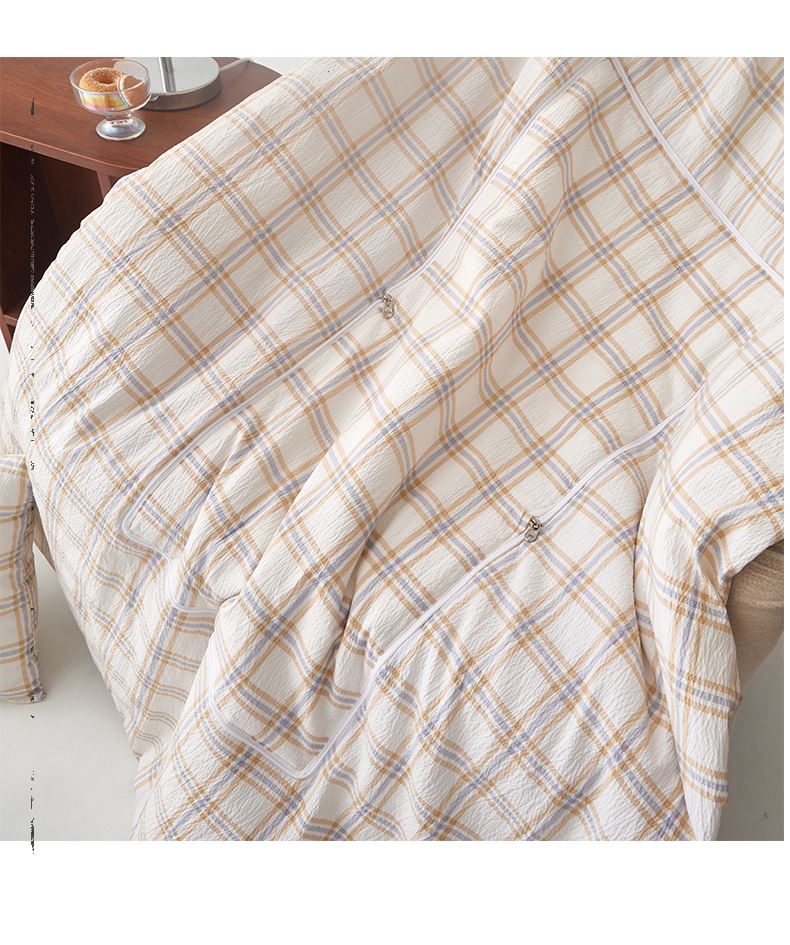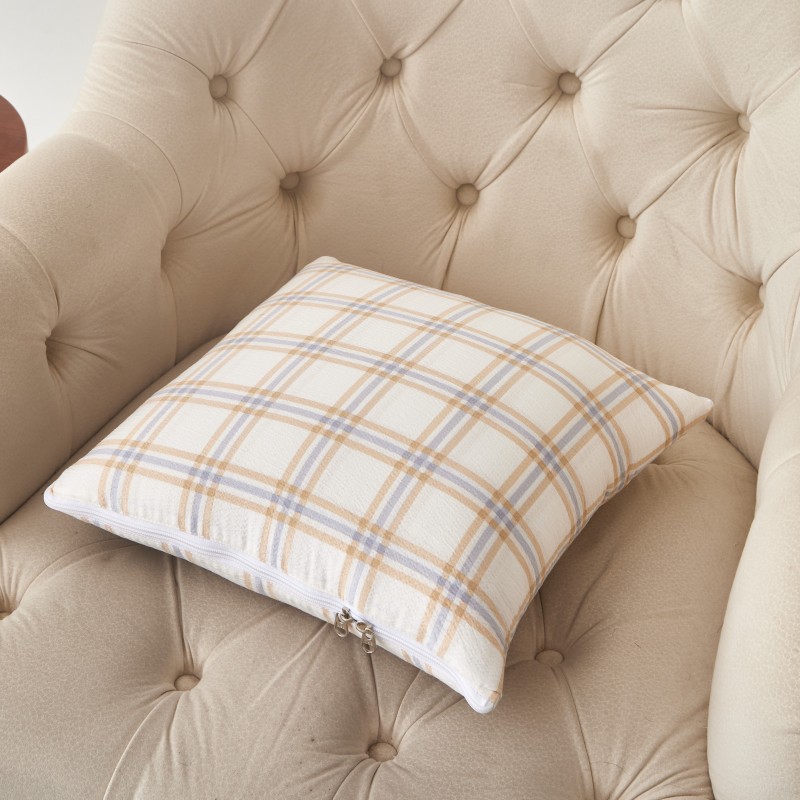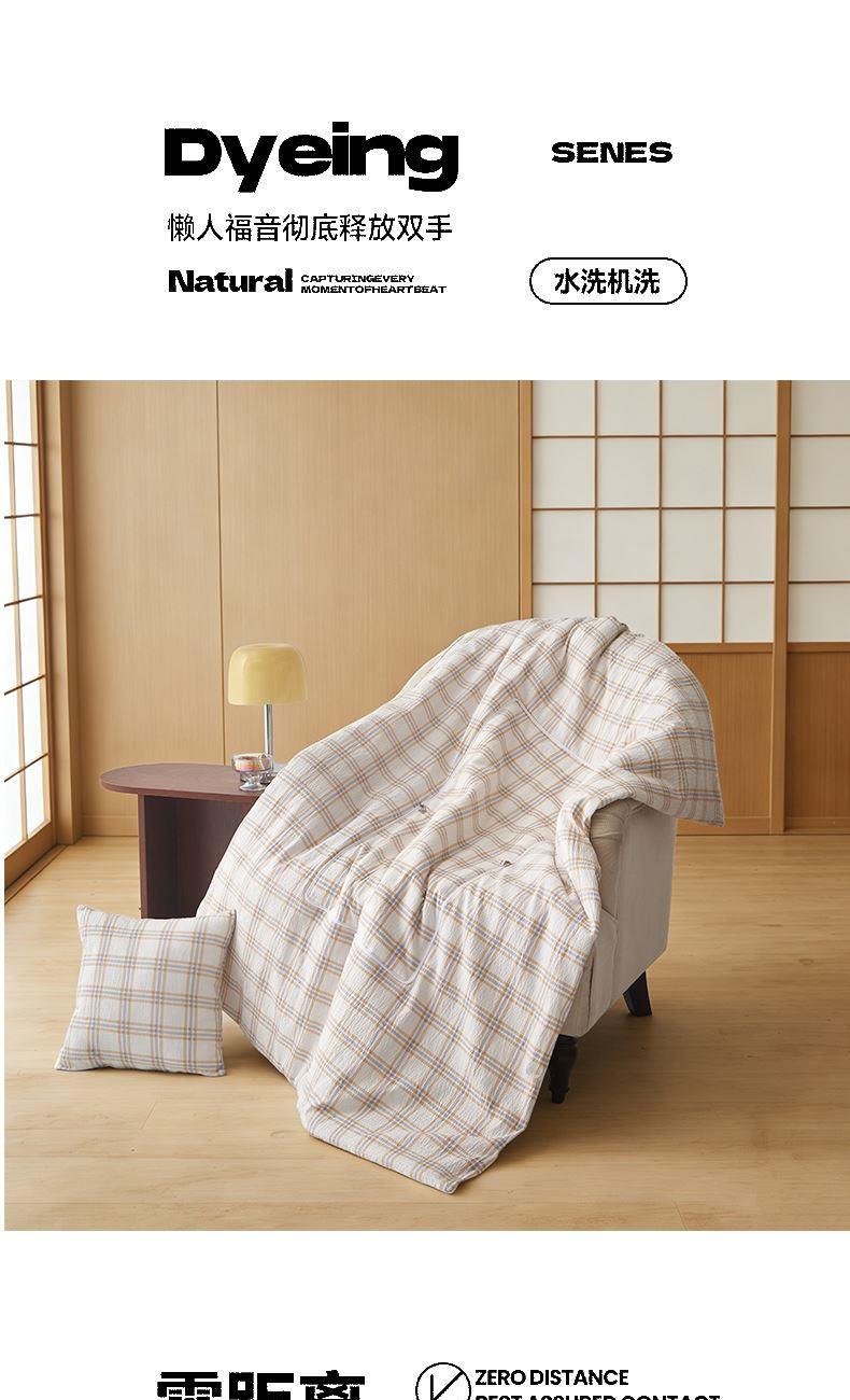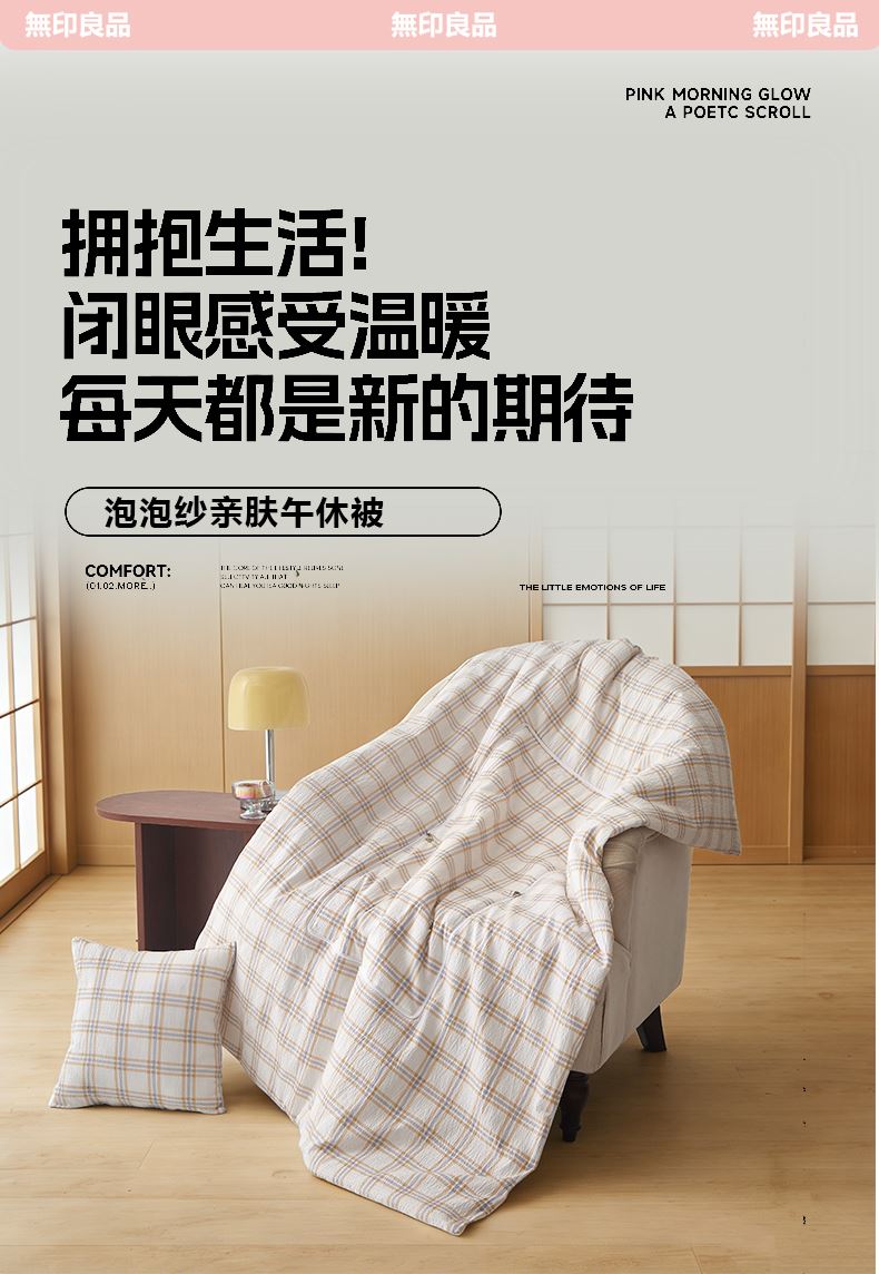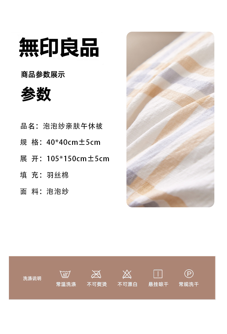 规格:40*40cm±5cm 展开:105*150cm±5cm 面料:泡泡纱 填充: 羽丝棉 执行标准:GB/T22796-2021 安全类别:GB18401-2010 B类 1.甄选亲肤泡泡纱面料 ,贴身舒适,填充选用无甲醛优质2.整张羽丝棉,轻盈蓬松,柔软舒适; 整个产品倾心朴实设计, 抱枕、被子、披肩等多功能使用,所有功能百变搭配,随心所用; 3.产品可以给你和家更体贴的温暖,宅家追剧,办公室午休,出差旅行,有此宝贝不再烦忧!