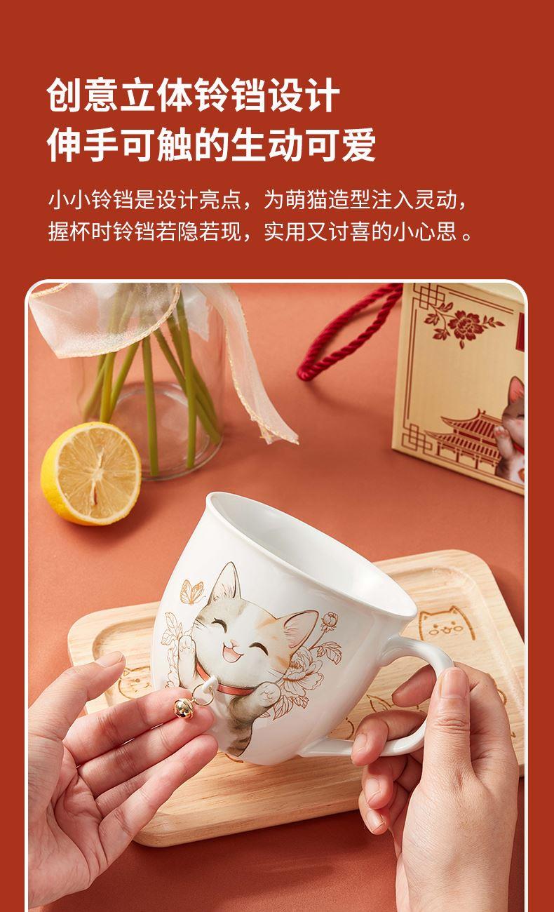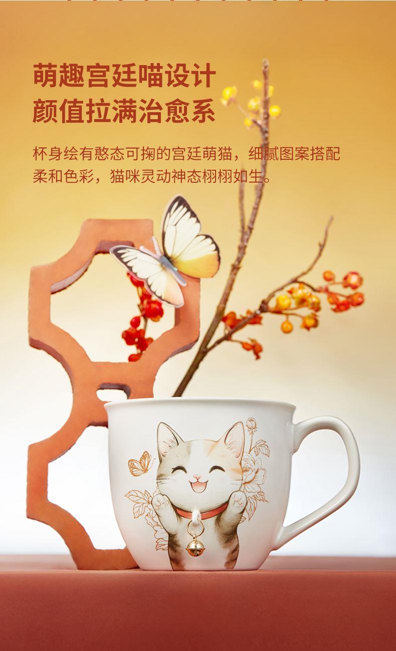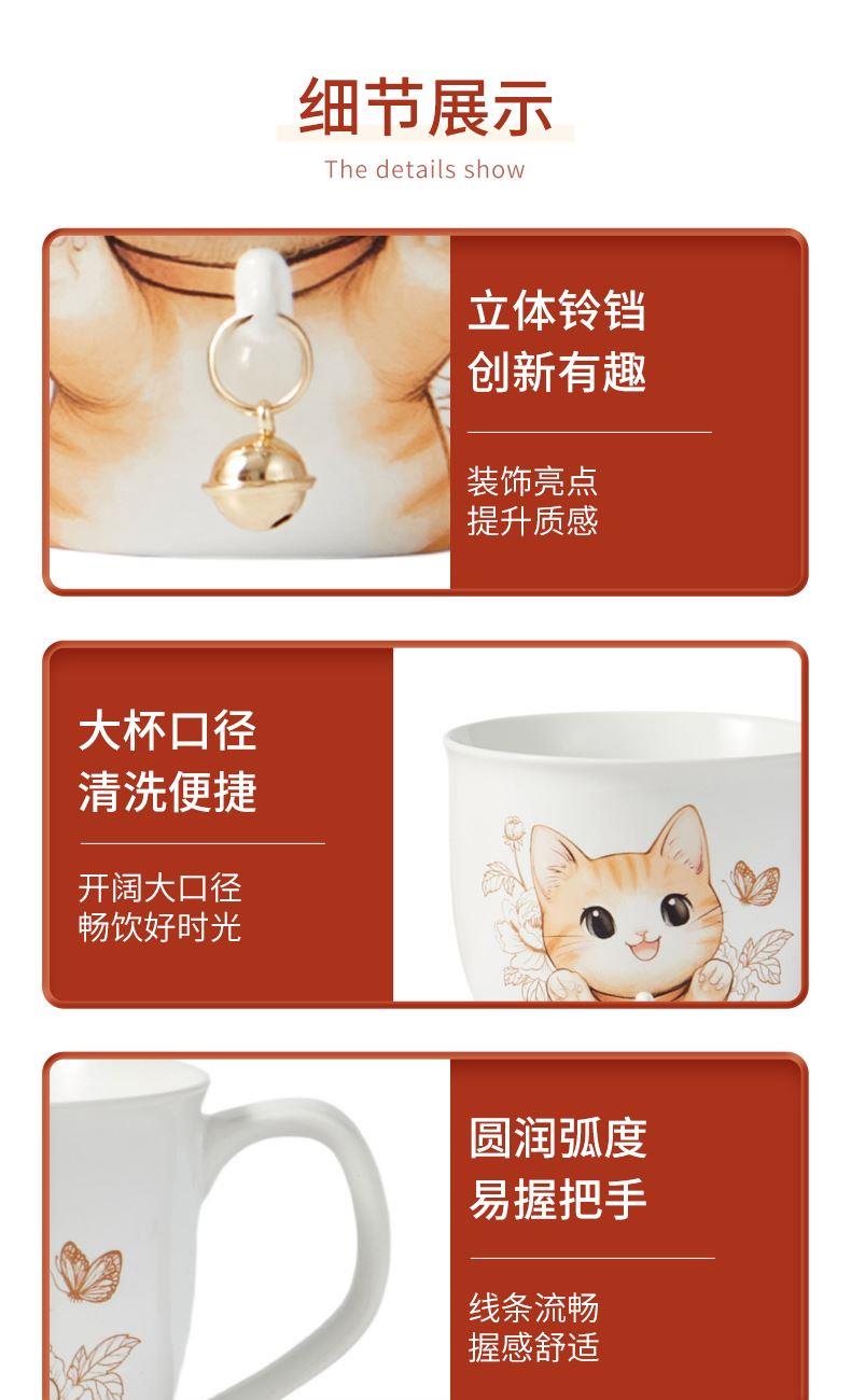 产品卖点 ① 杯身绘有憨态可掬的宫廷萌猫,细腻图案搭配柔和色彩,猫咪灵动神态栩栩如生 ② 选用优质高岭土高温烧制而成,高温白瓷材质坚硬但轻量不厚重,釉面光洁好清洗 ③ 创意立体铃铛设计,伸手可触的生动可爱 ④ 500ML大容量设计,满足多元喝水需求