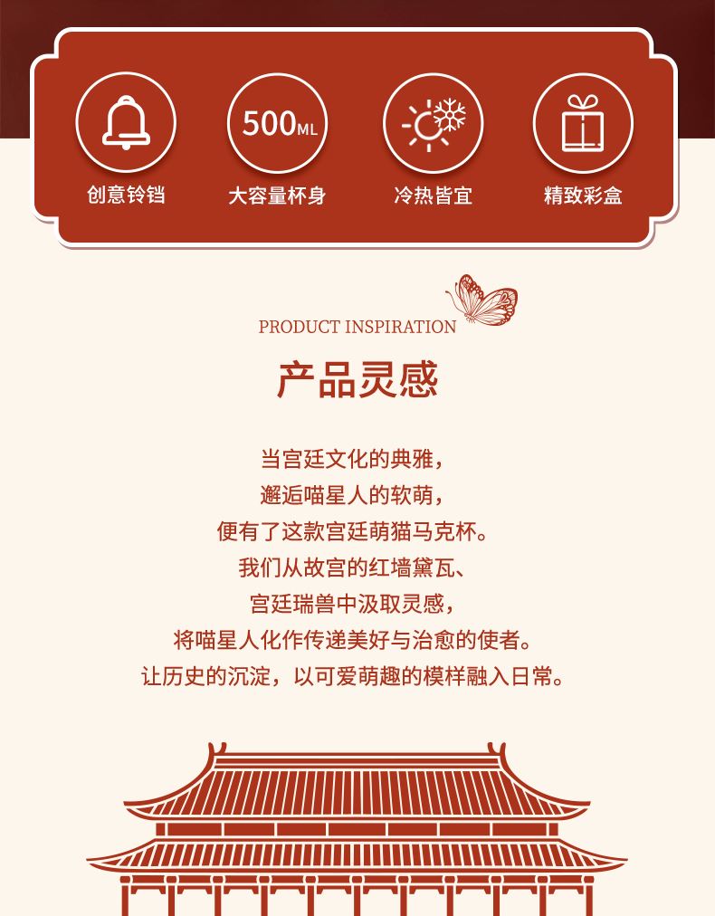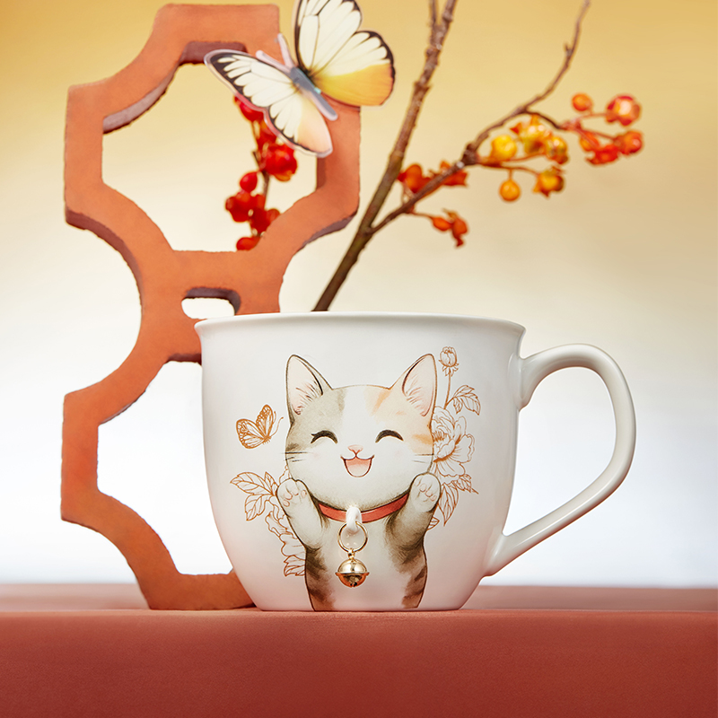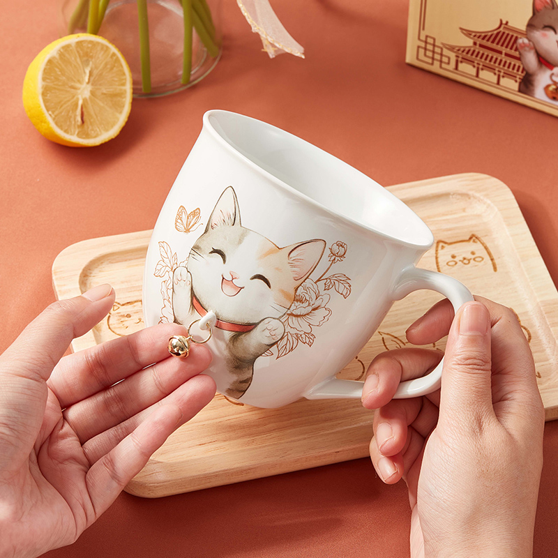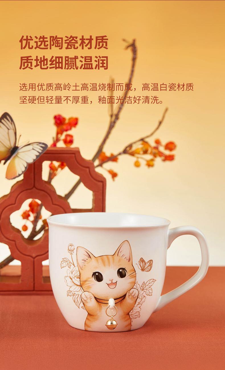 产品卖点 ① 杯身绘有憨态可掬的宫廷萌猫,细腻图案搭配柔和色彩,猫咪灵动神态栩栩如生 ② 选用优质高岭土高温烧制而成,高温白瓷材质坚硬但轻量不厚重,釉面光洁好清洗 ③ 创意立体铃铛设计,伸手可触的生动可爱 ④ 500ML大容量设计,满足多元喝水需求