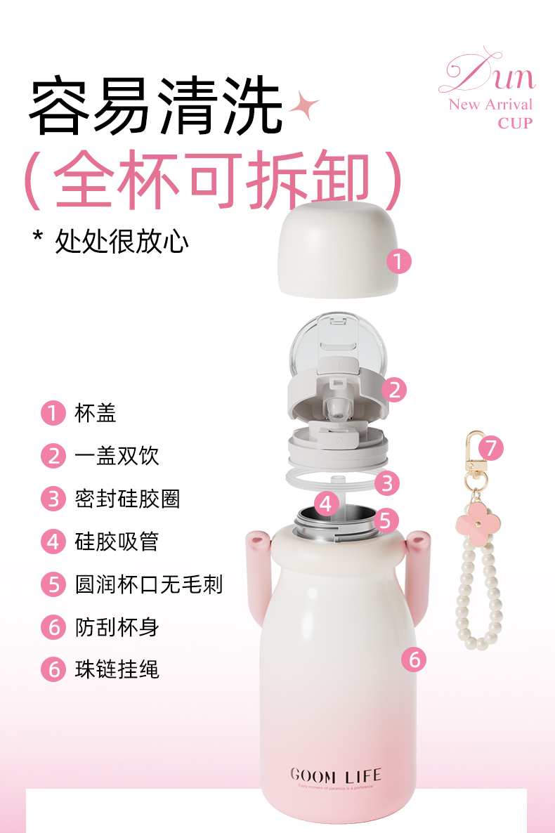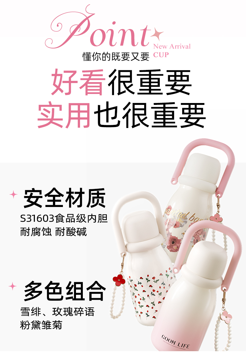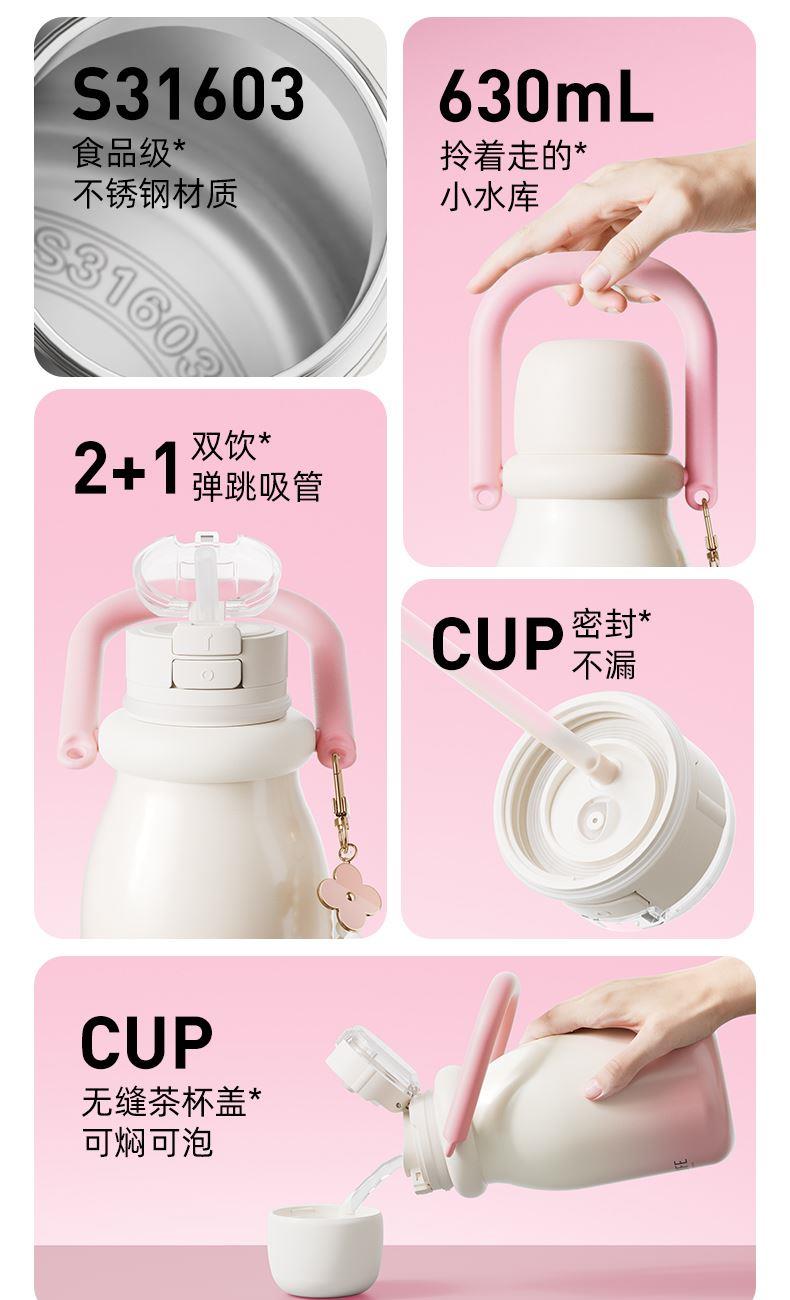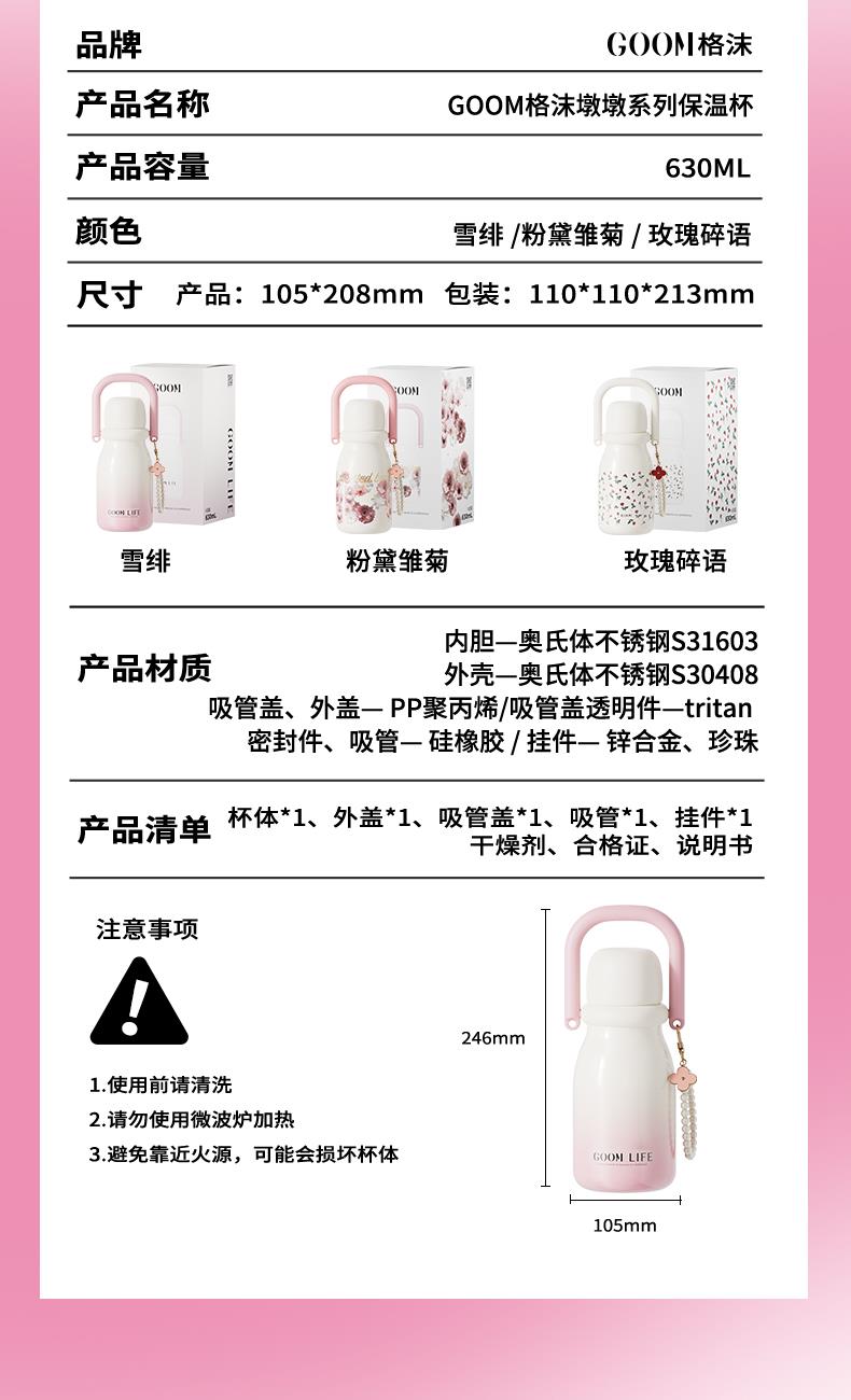 型 号:GM-25AW-B16 颜 色:雪绯/粉黛雏菊/玫瑰碎语 材 质:内胆—奥氏体不锈钢S31603(022Cr17Ni12Mo2),外壳—奥氏体不锈钢S30408(06Cr19Ni10),吸管盖、外盖—PP聚丙烯(丙烯与乙烯的聚合物),吸管盖透明件—tritan,密封件、吸管-硅橡胶,挂件-锌合金、珍珠 单杯尺寸:105*208mm(不带提手)/105*246mm(带提手) 外箱尺寸:555*225*430mm