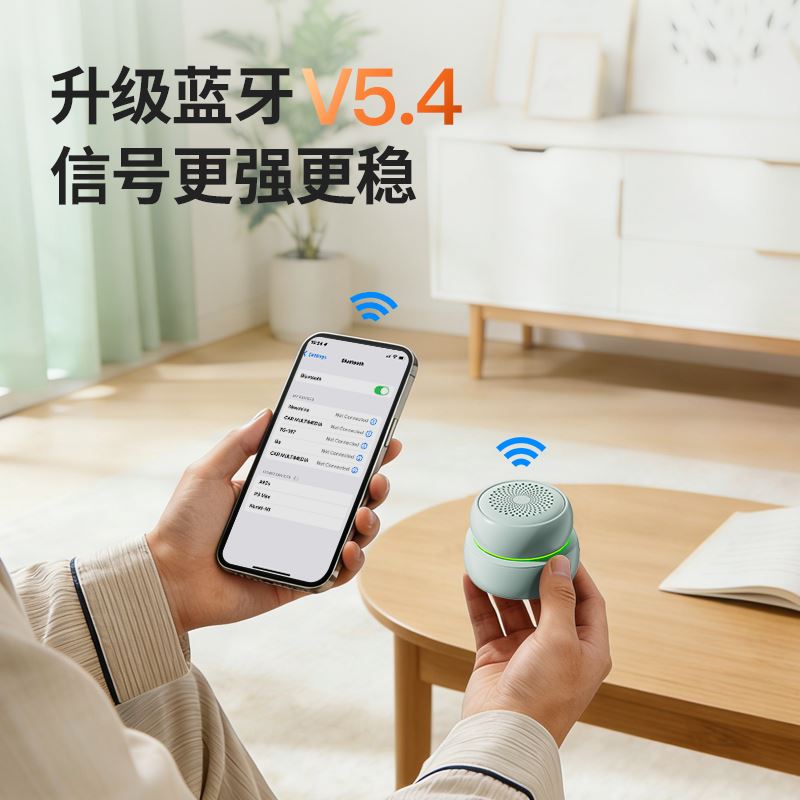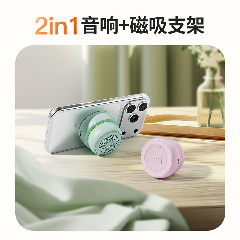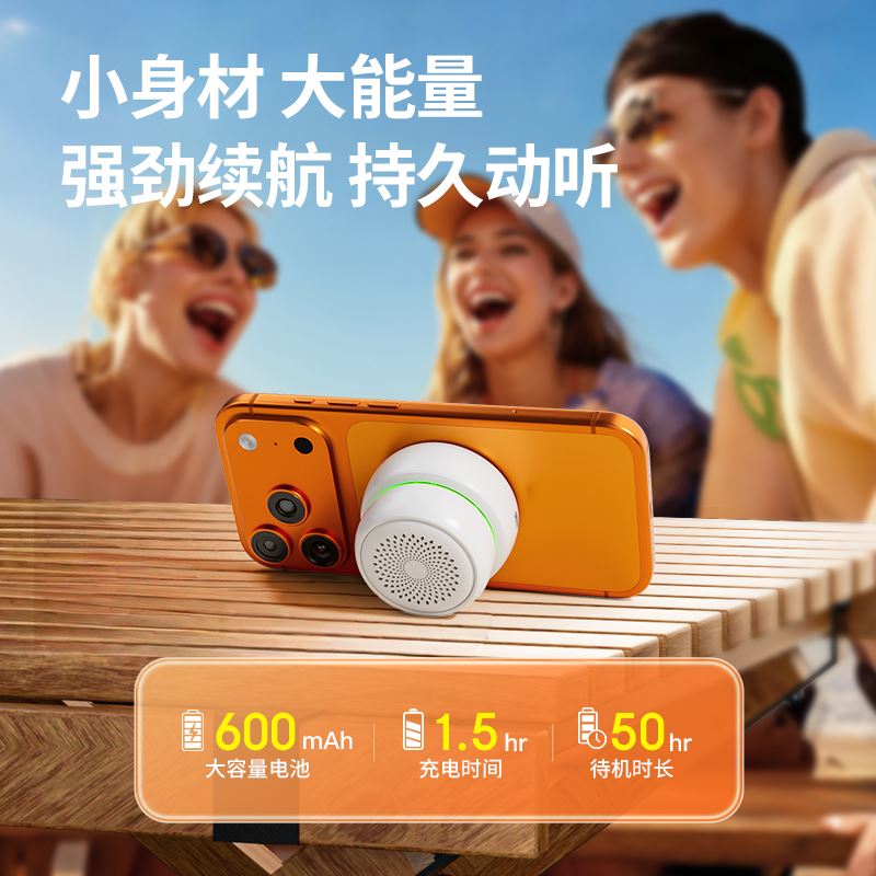 福禄娃,迷你磁吸蓝牙音响。支持TWS互联,大喇叭声音大音质好。 蓝牙:V5.4, 传输距离:10米 喇叭规格:Ф40mm 频响范围:140 – 20kHz 电池容量:600mAh 音乐时长:约4小时(80%音量) 充电时长“约1.5h,待机时间:约50h 产品尺寸:60*60*40mm 产品重量:约90g