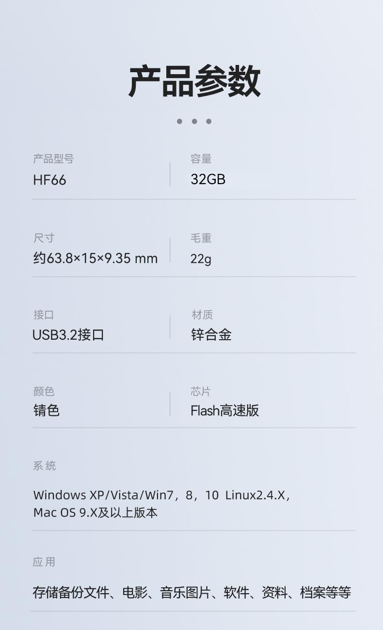 接口采用USB3.2, 高速接口协议传输文件高效稳定 Flash 芯片高速版 360°旋转保护安全堡垒 锖色电镀金属效果,坚固耐用 产品尺寸:63.8x15x9.35 mm 单品重量:22g