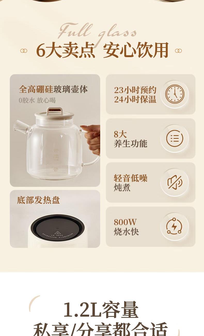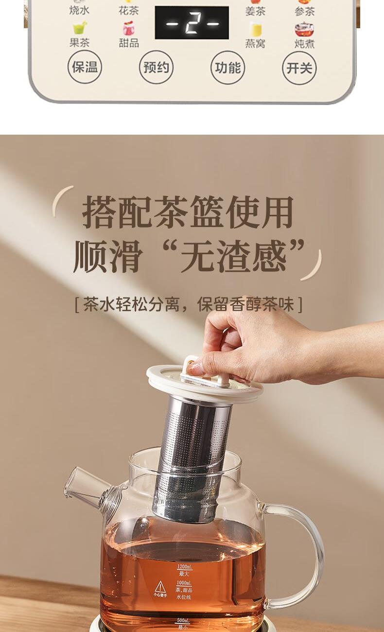 额定电压:220V~ 额定功率:800W 额定频率:50Hz 额定容量:1.2L 材 质:壶体:高硼硅玻璃,底座:PP,滤网:不锈钢304 0胶水0涂层0金属全玻璃花茶壶 智能触屏操作,八大菜单选择 23H预约,默认12H保温,可选24H保温 1.2L精致容量,独享共饮都合适 304不锈钢茶漏,煮茶泡茶随心所欲