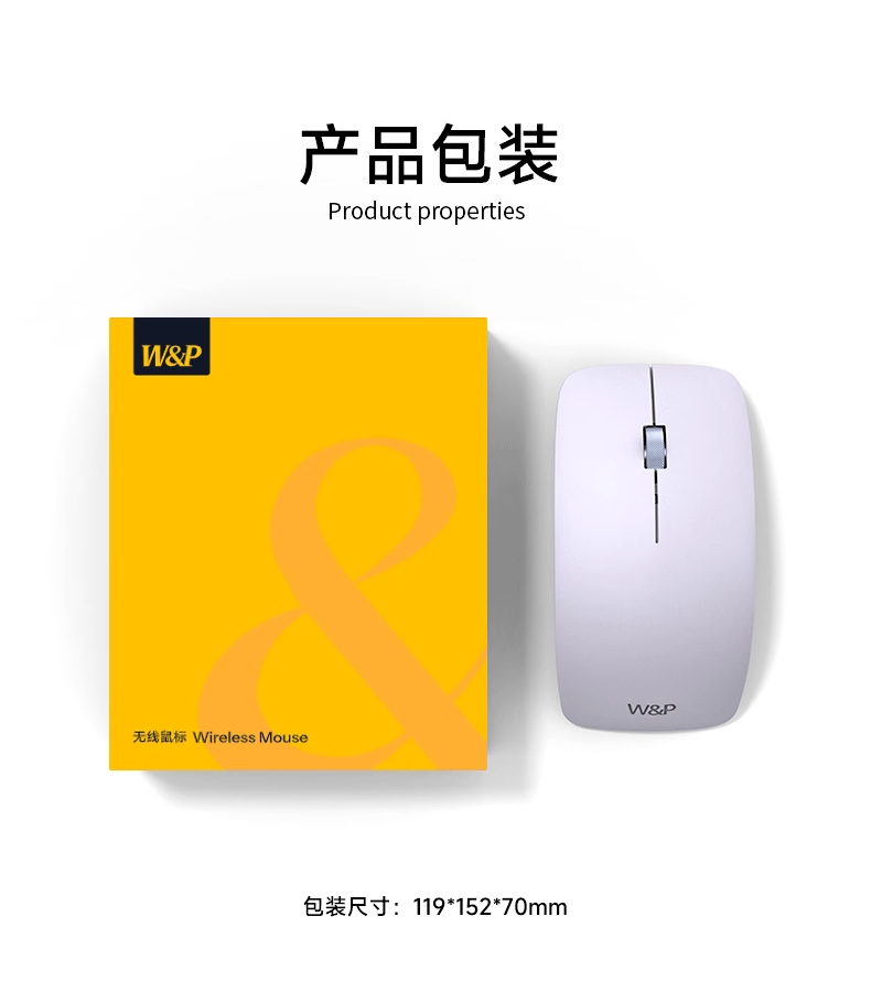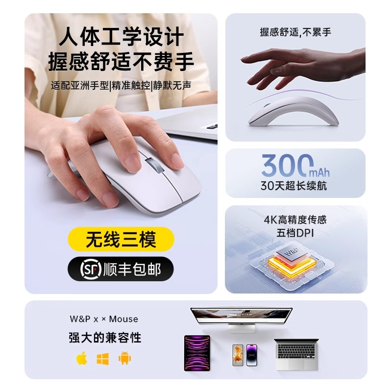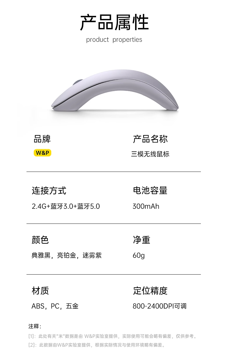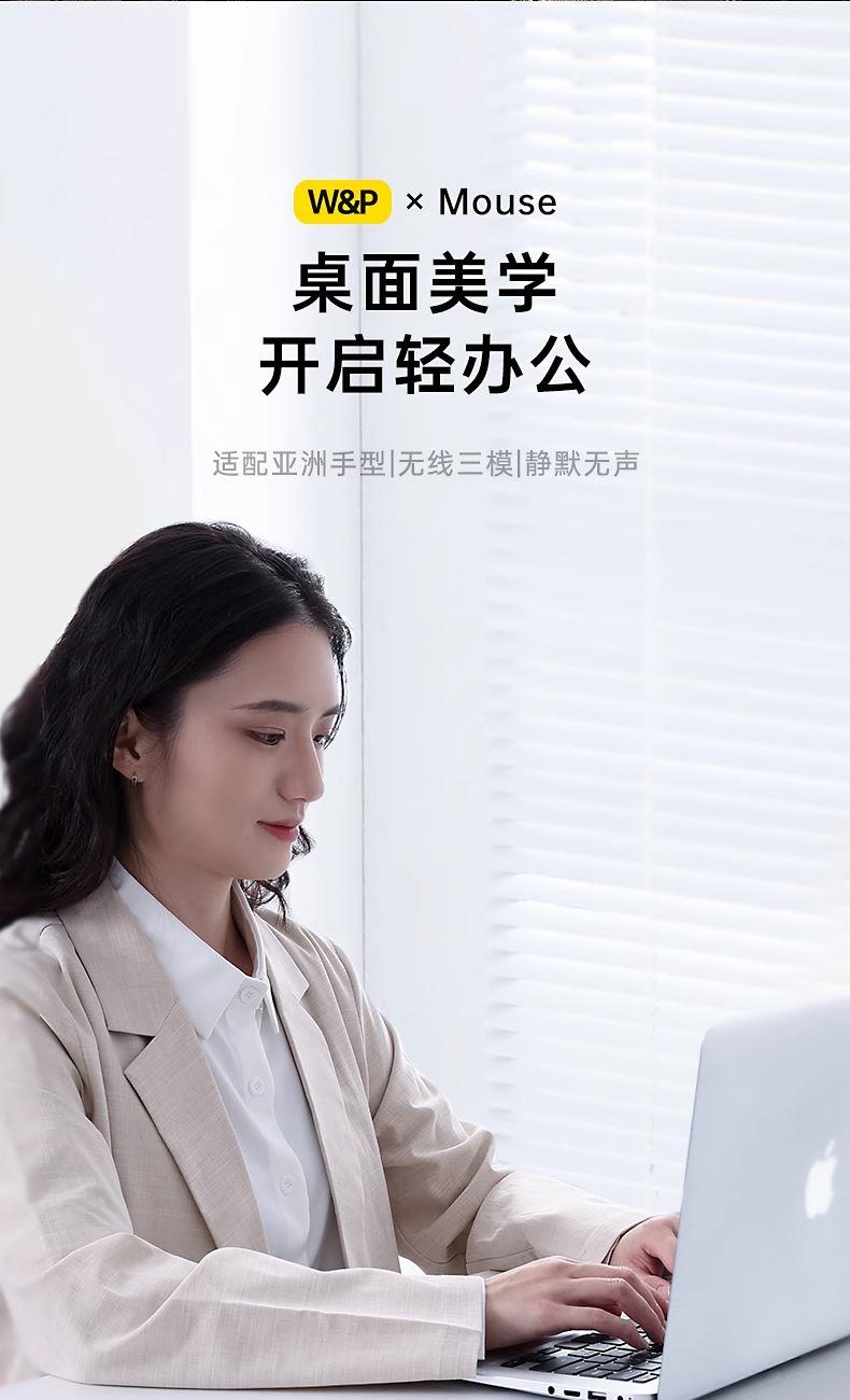产品型号:M-WB1 电池容量:300mAh 产品重量:约60g W&P三模无线鼠标,科技赋能移动生活; 2.4G+蓝牙3.0+蓝牙5.0三模链接,更方便; UV肤感涂层,给手部做个SPA; 4K瞬息追踪芯片,捕捉每一次细微移动; 300mAh可充电池,持久续航30天。; 专为亚洲手型定制,弧线形设计符合人体; 采用消声轴体,按键快速回弹,静默办公。