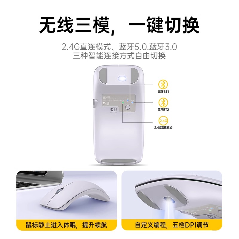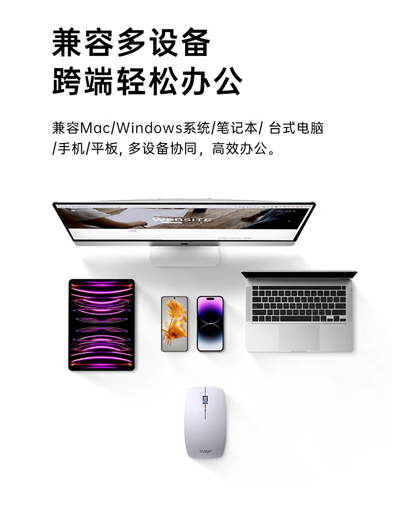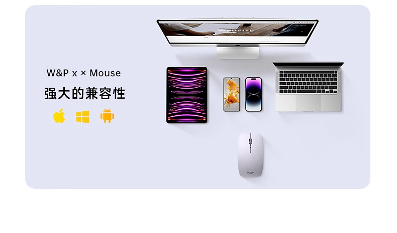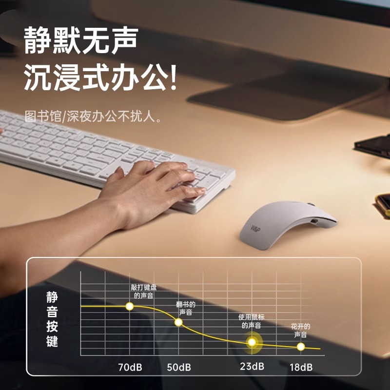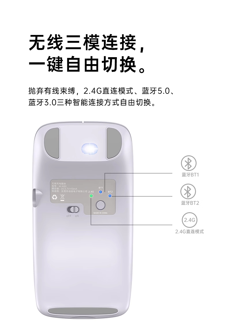 产品型号:M-WB1 电池容量:300mAh 产品重量:约60g W&P三模无线鼠标,科技赋能移动生活; 2.4G+蓝牙3.0+蓝牙5.0三模链接,更方便; UV肤感涂层,给手部做个SPA; 4K瞬息追踪芯片,捕捉每一次细微移动; 300mAh可充电池,持久续航30天。; 专为亚洲手型定制,弧线形设计符合人体; 采用消声轴体,按键快速回弹,静默办公。