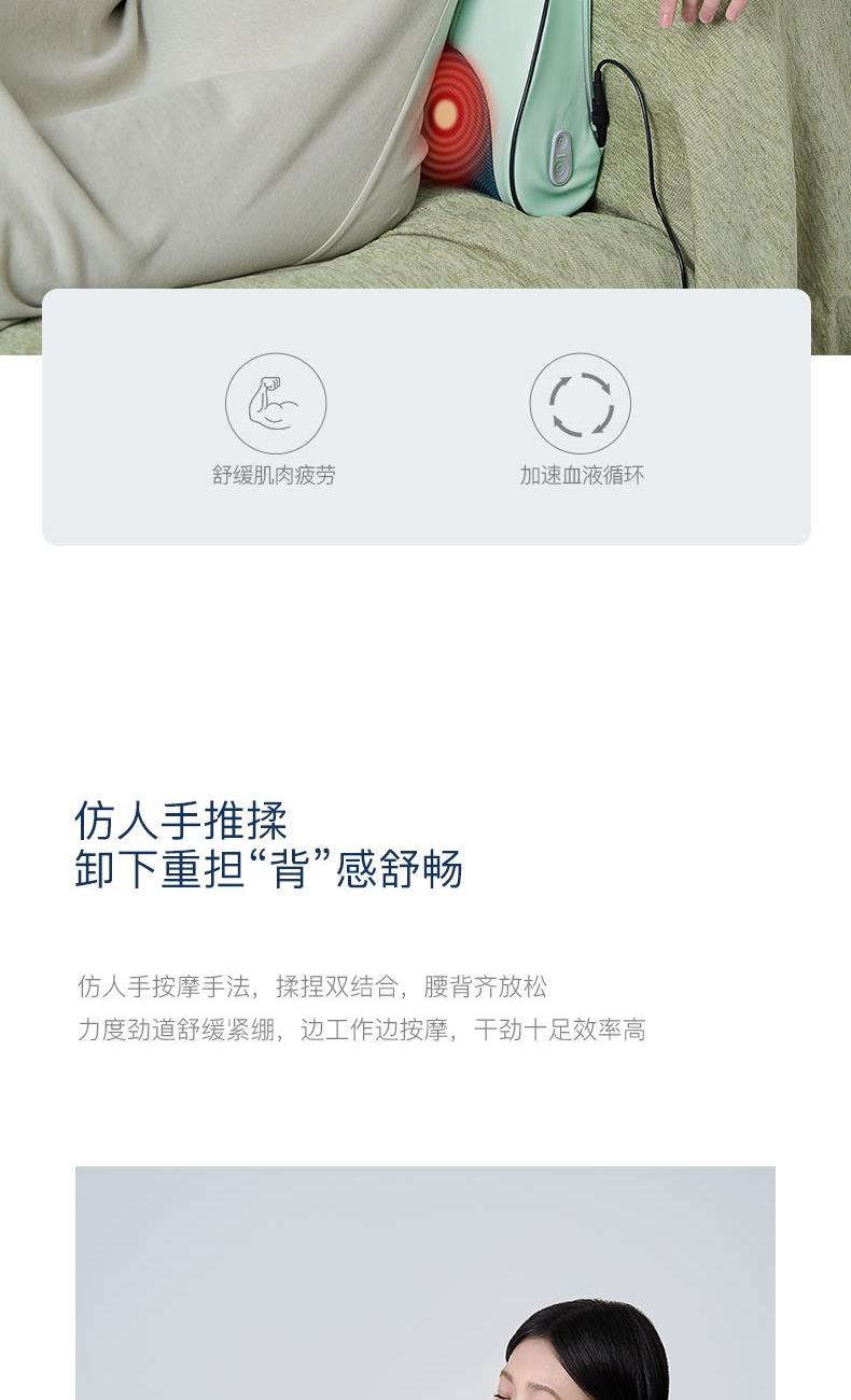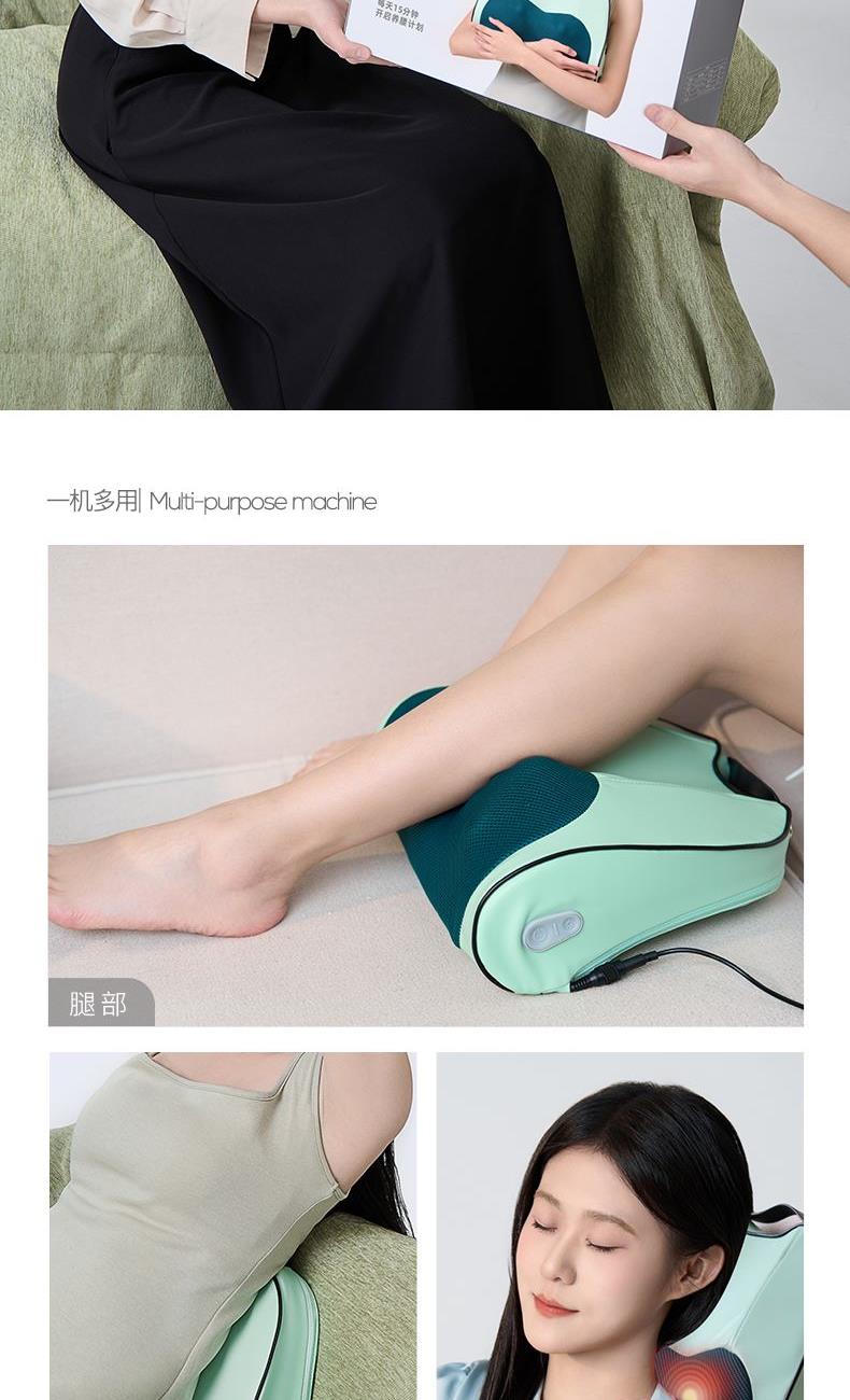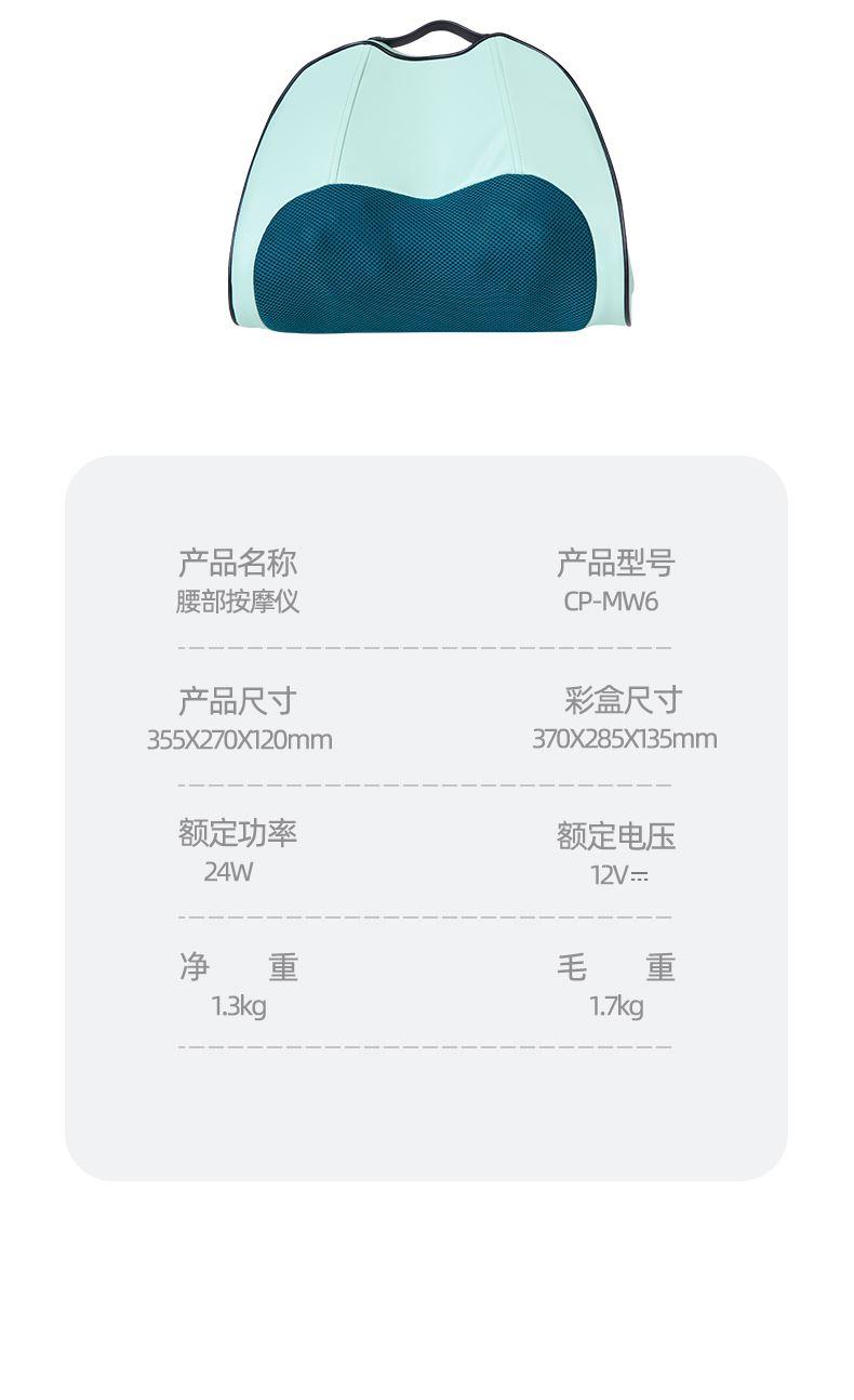 产品型号:CP-MW6 额定电压 : 12V⎓ 额定功率:24W 智能定时:15分钟 商品条码 : 6972831860846 产品毛重 : 1.53kg 产品尺寸:355X270X120mm 包装尺寸:370X285X135mm 包装清单:主机X1、电源线X1、说明书X1, 核心卖点: 1. 温感热敷,深层渗透 温暖呵护 2、仿人手推揉,力度劲道舒缓紧绷 3、一键操控,按摩热敷一键解决,老人也可以使用 4、智能定时,享受15分钟惬意放松