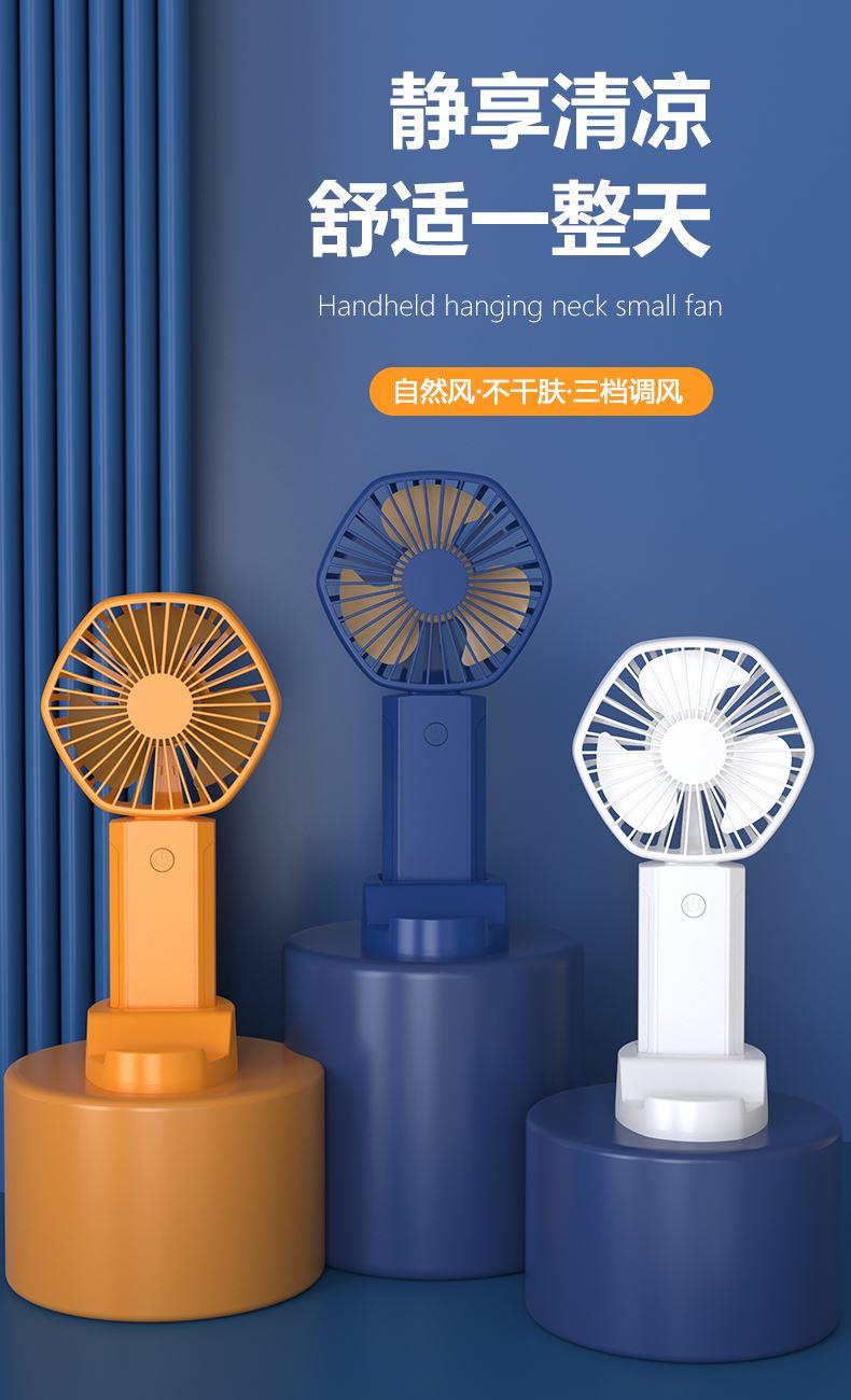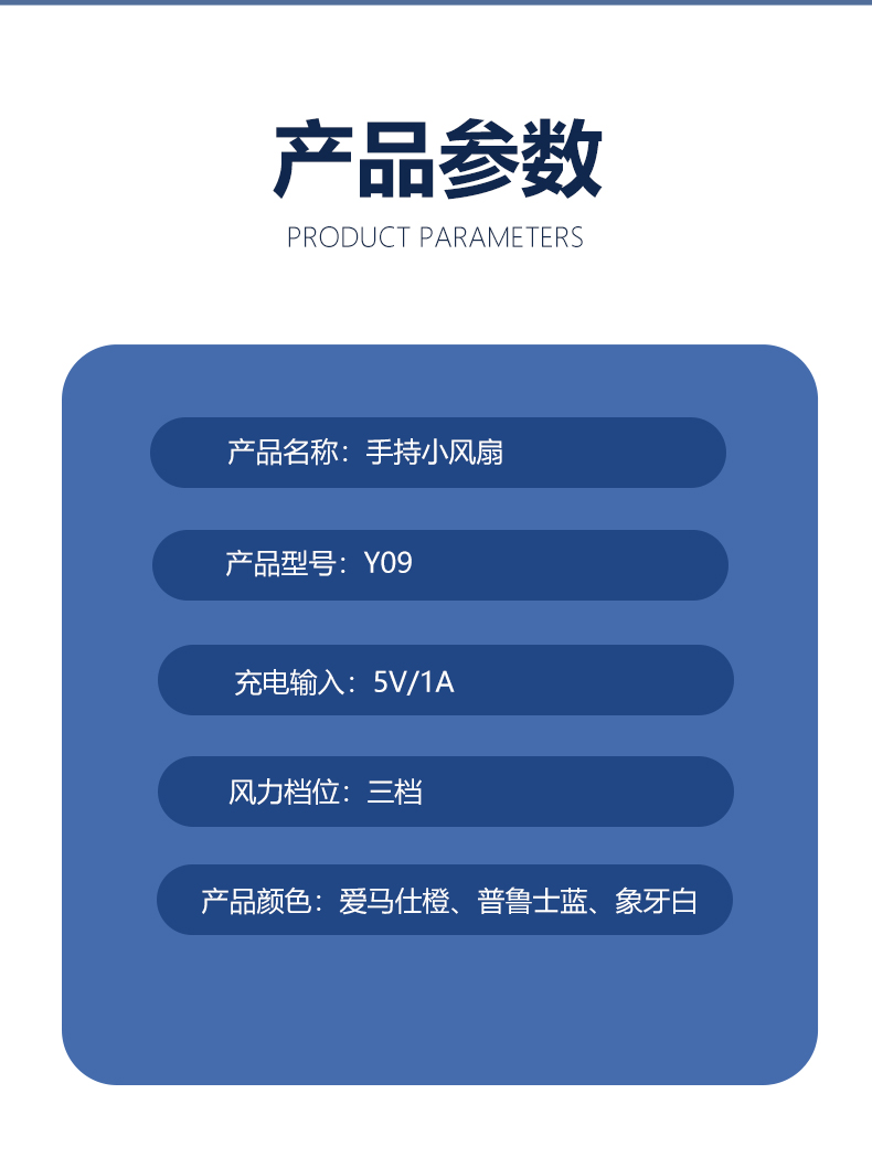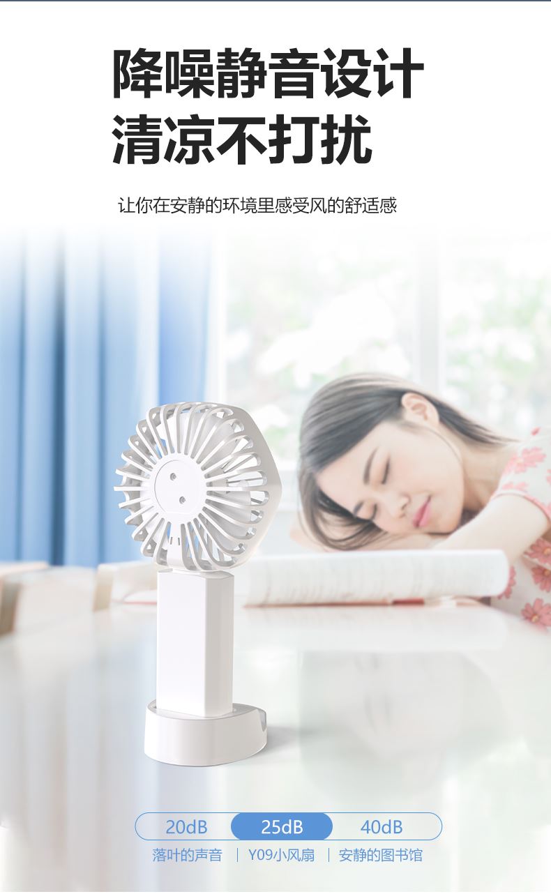 手持桌面小风扇Y09 颜色:白色 黄色 蓝色 材质:ABS 尺寸:180*90*27mm 容量:800mAh 包装:彩盒包装 推荐理由 精致小巧,方便携带 三档风速可调 桌面/手持 多种使用方法