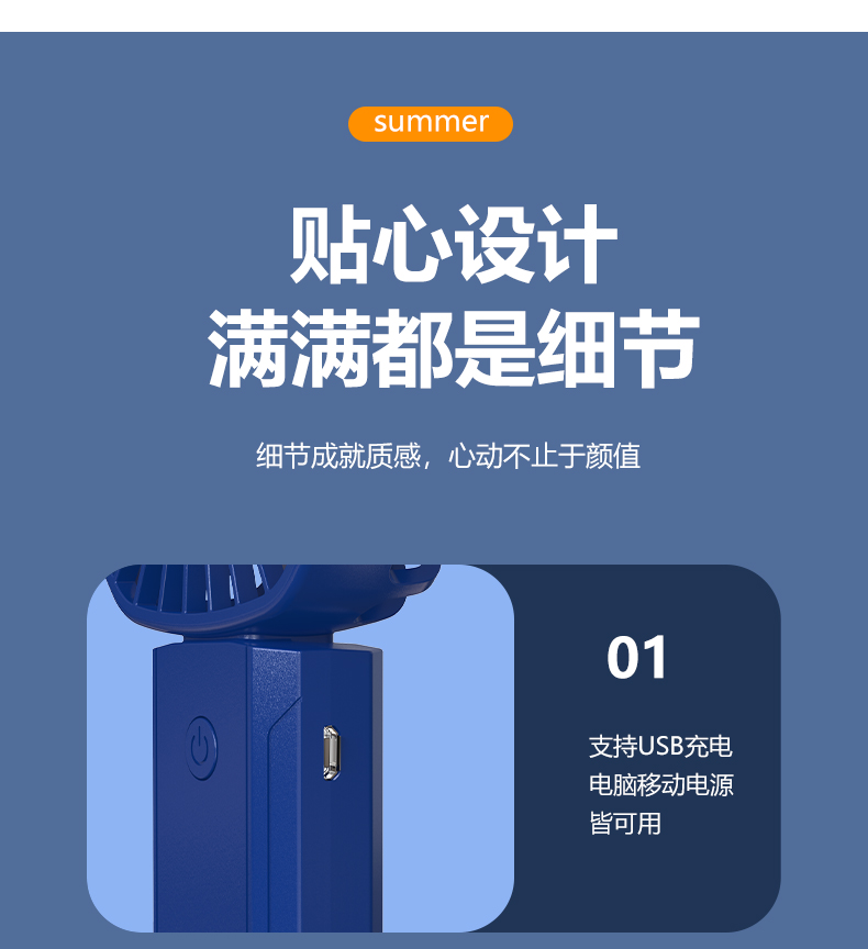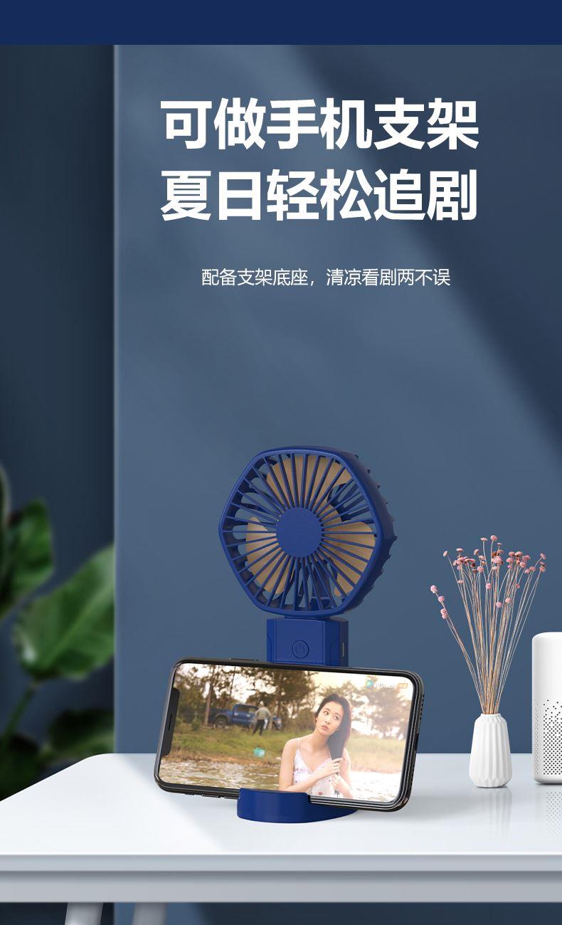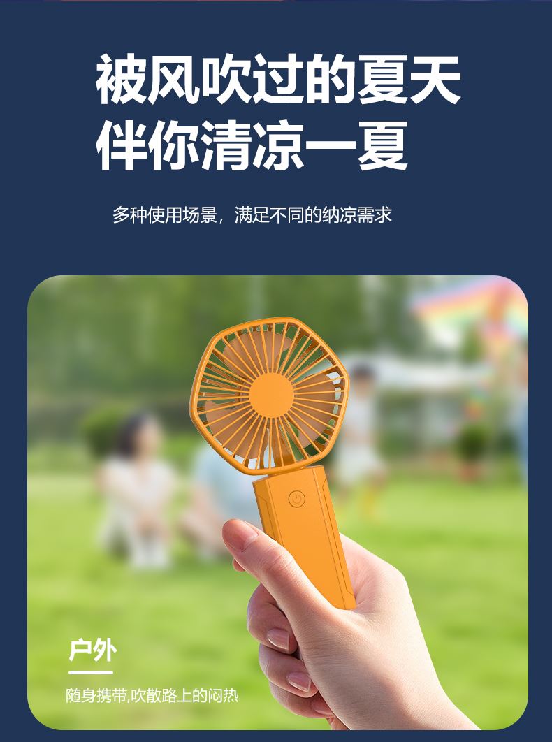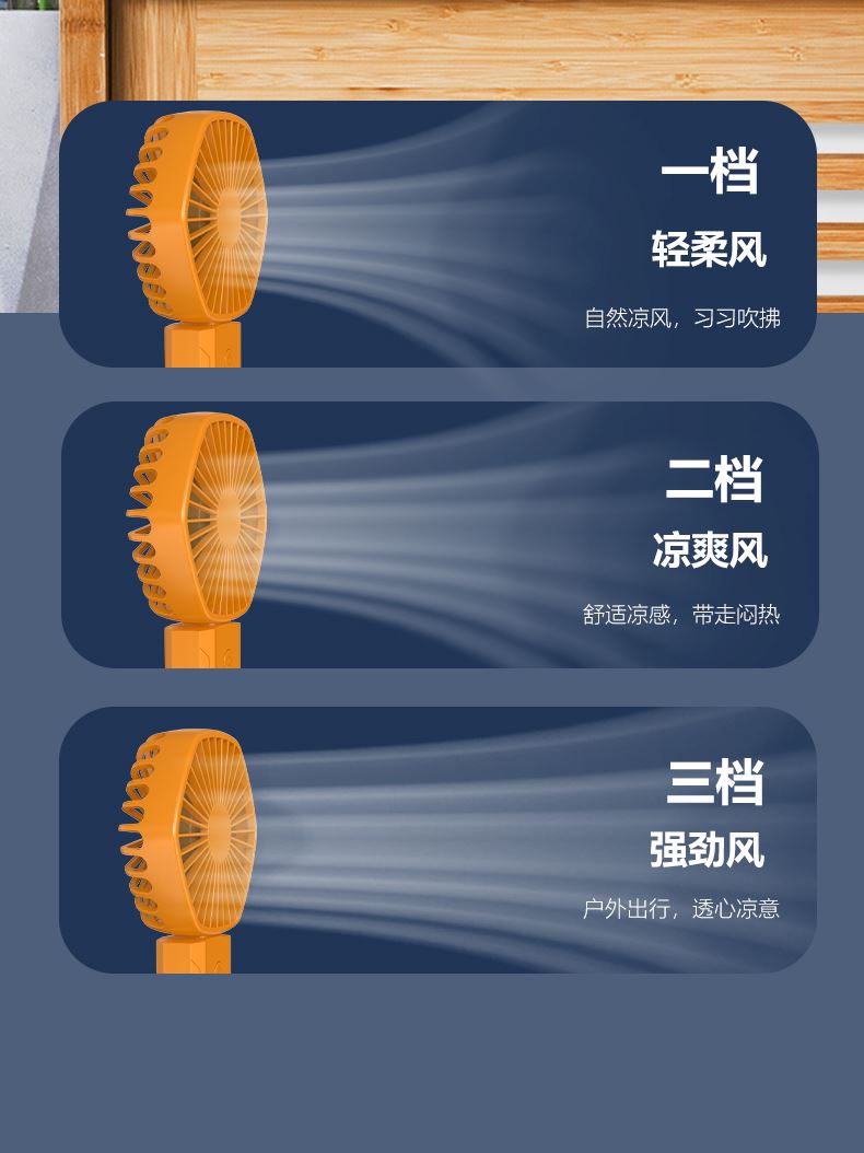 手持桌面小风扇Y09 颜色:白色 黄色 蓝色 材质:ABS 尺寸:180*90*27mm 容量:800mAh 包装:彩盒包装 推荐理由 精致小巧,方便携带 三档风速可调 桌面/手持 多种使用方法