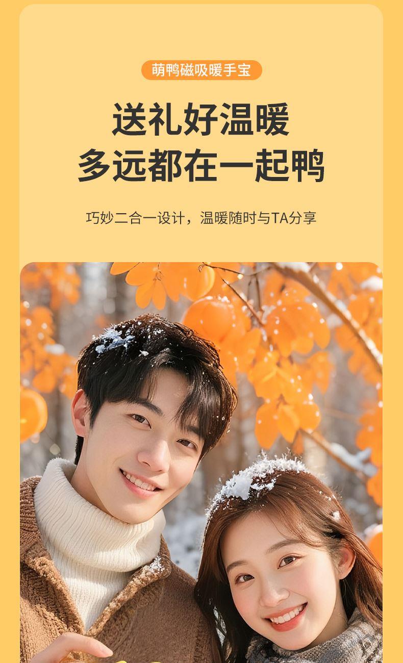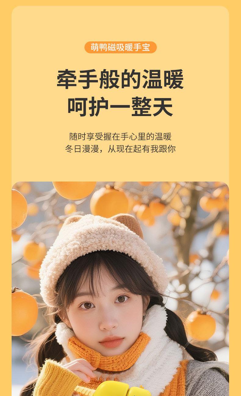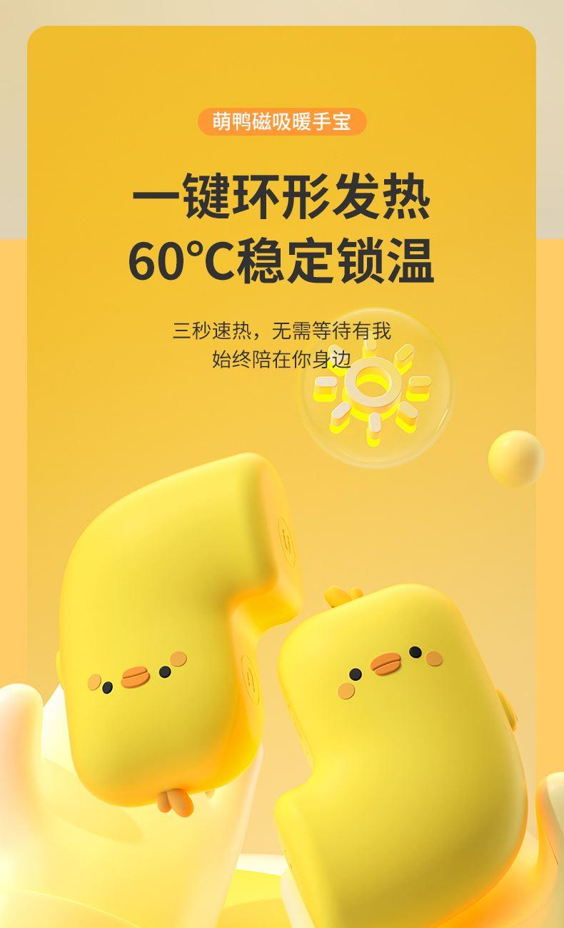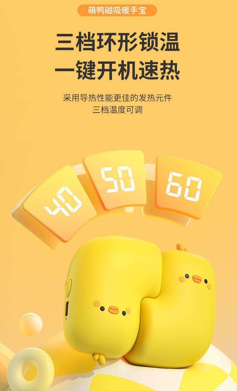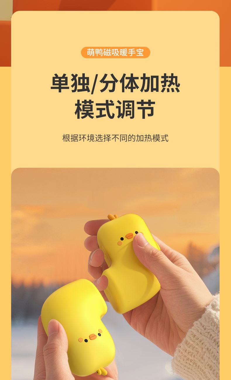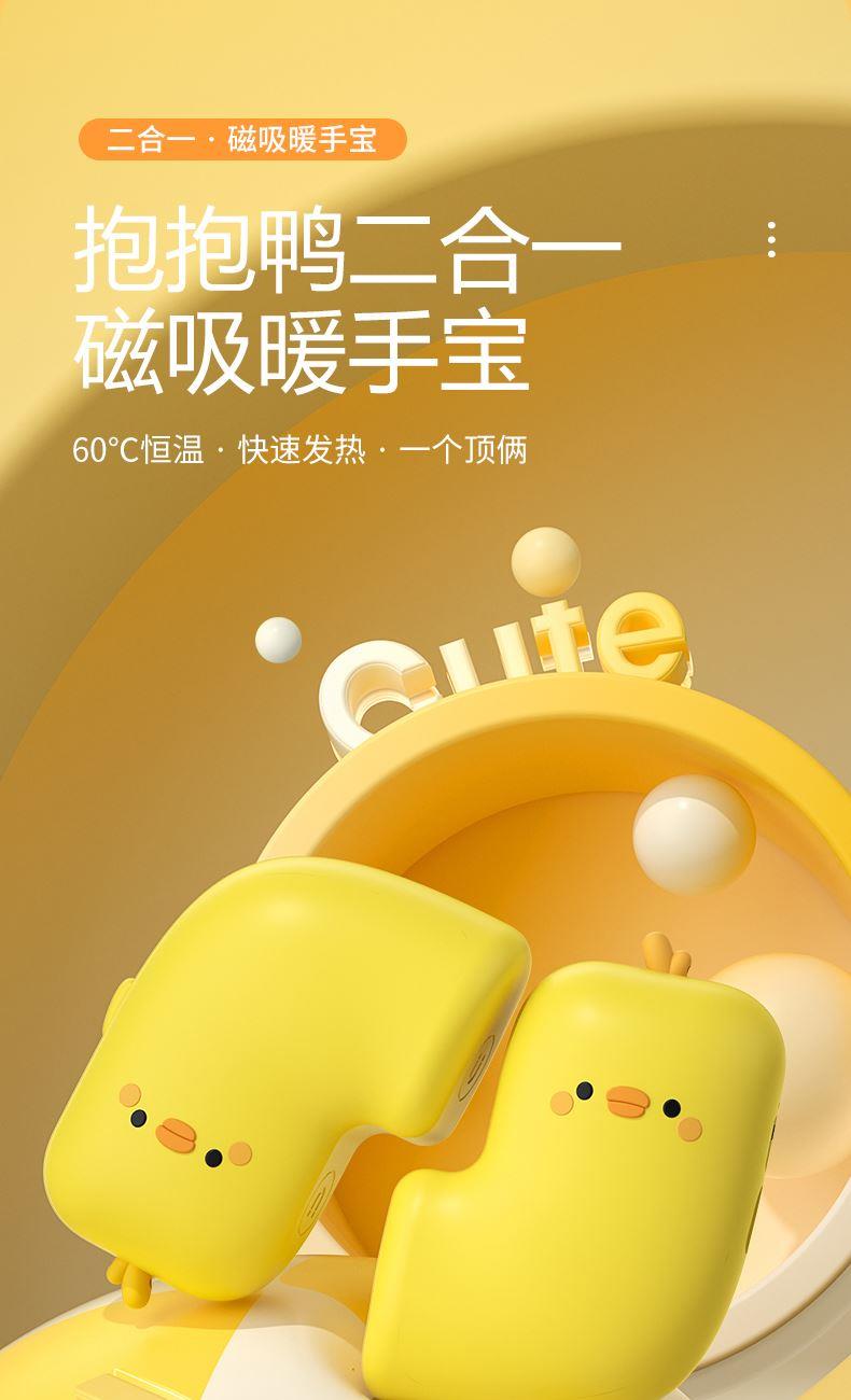 磁吸二合一暖手宝 3600毫安,单体1800毫安 60°恒温发热,360°温暖 三档温控调节,一键速热 抱抱鸭可爱造型,手感温润舒适