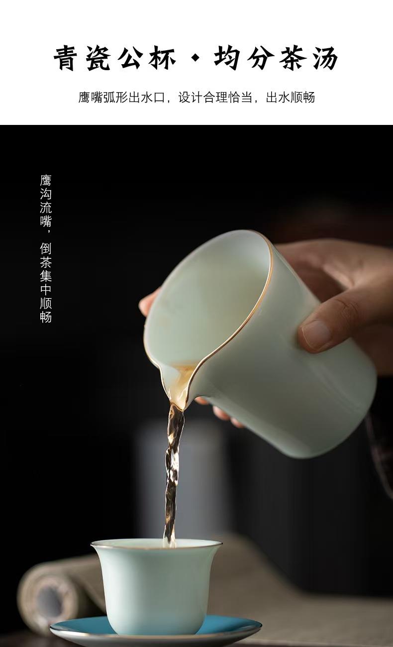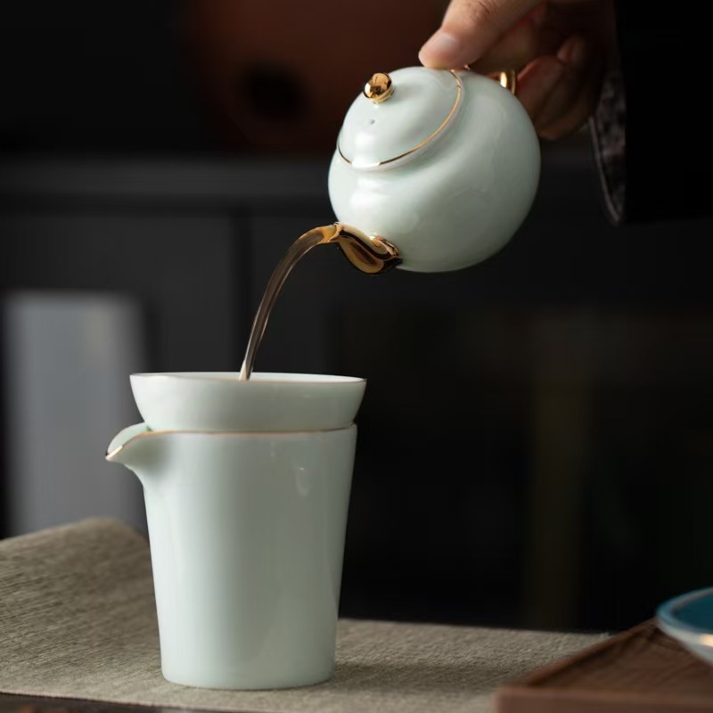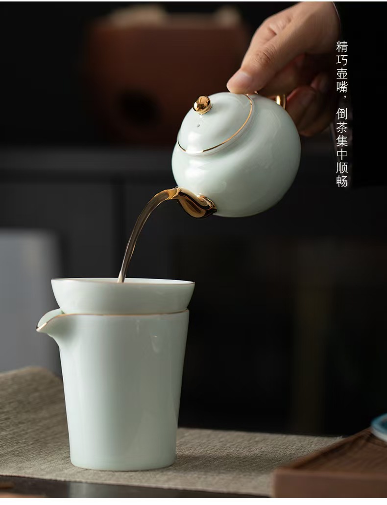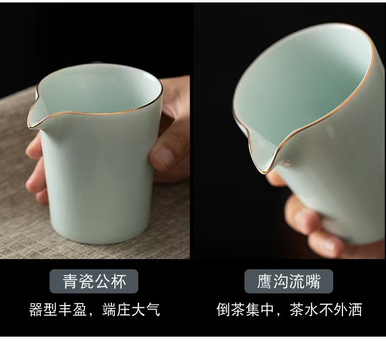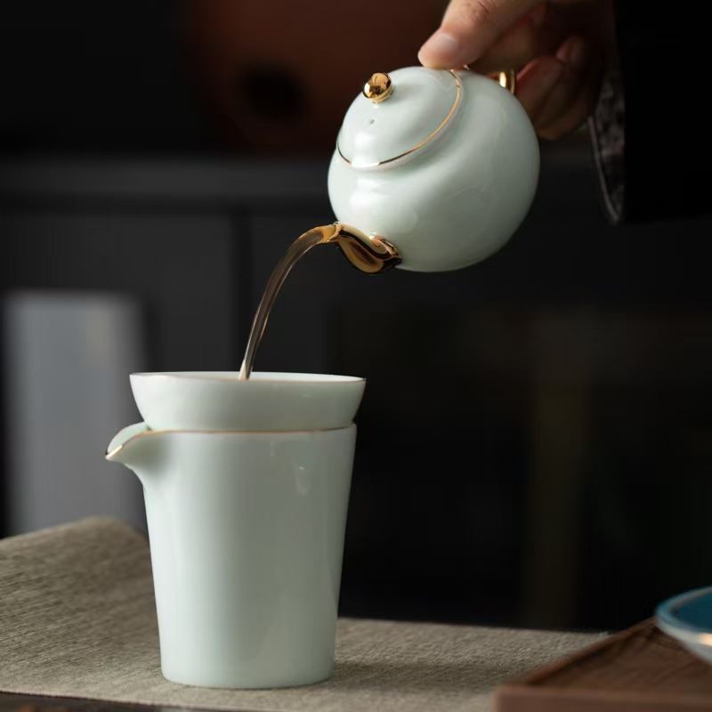 配制:1壶 6杯 1公道杯1茶托1茶漏 1锦盒 规格:壶:12*8cm 公道杯:9.2*9.1cm 茶杯:6cm*5cm 手提锦盒:39*27*13cm 材质:青山玉 24K真金 推荐说明:青山玉是青瓷新品,以瓷质细腻,线条明快流畅,色泽纯洁而斑斓著称。青如玉,明如镜,声如磬,描24K真金奢华装饰,被称为瓷器之花。