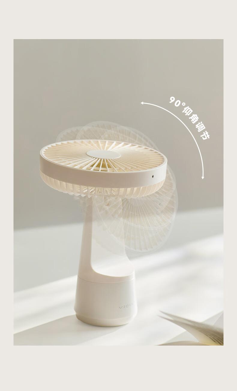 颜色:陶白色 电池容量:3000mAh 额定功率:5W 毛重:0.7kg 包装尺寸:275*190*110mm 条码:6977735714141 1. 立体大广角出风,上下90°,左右100° 2. 3档风速快速消暑,风感细腻 3. 3000mAh大容量,充插两用 4. 轻音低噪轻风,直流电机
