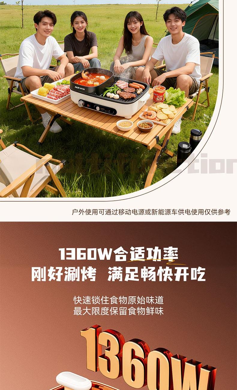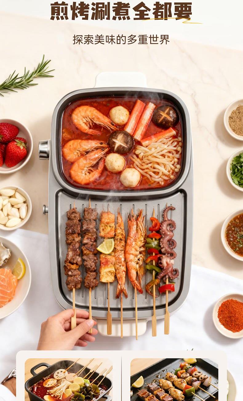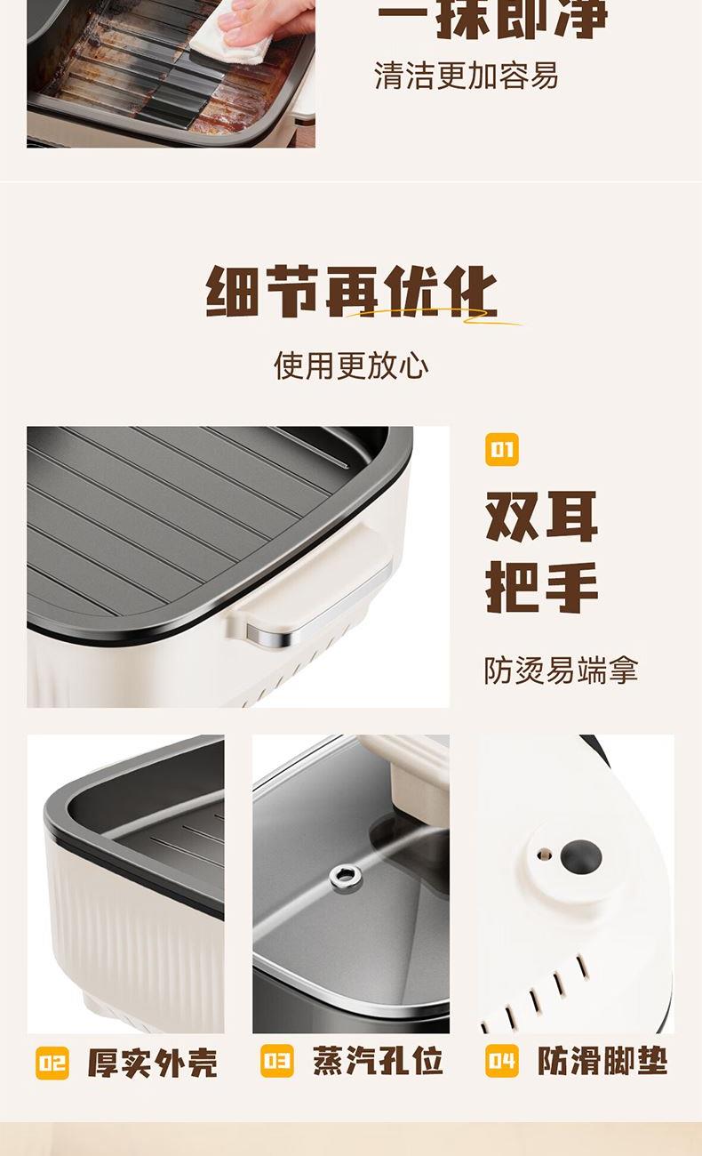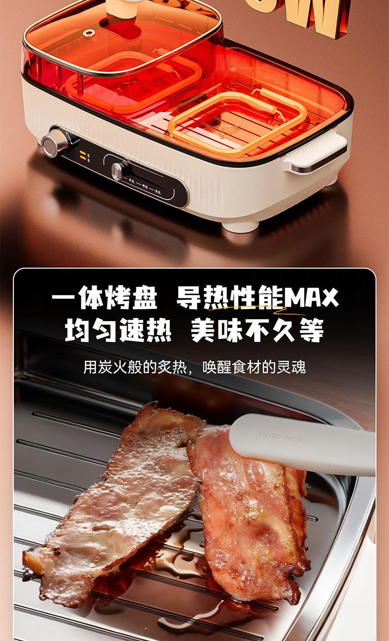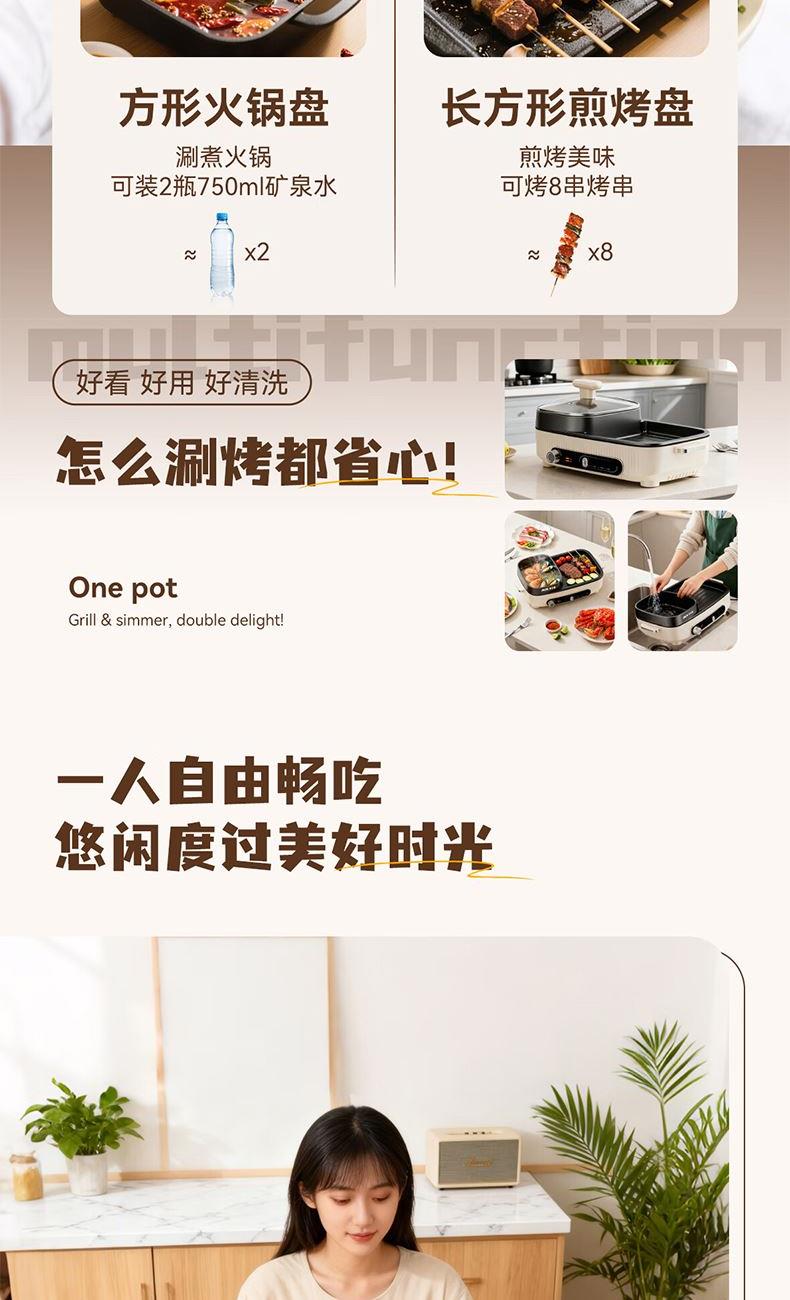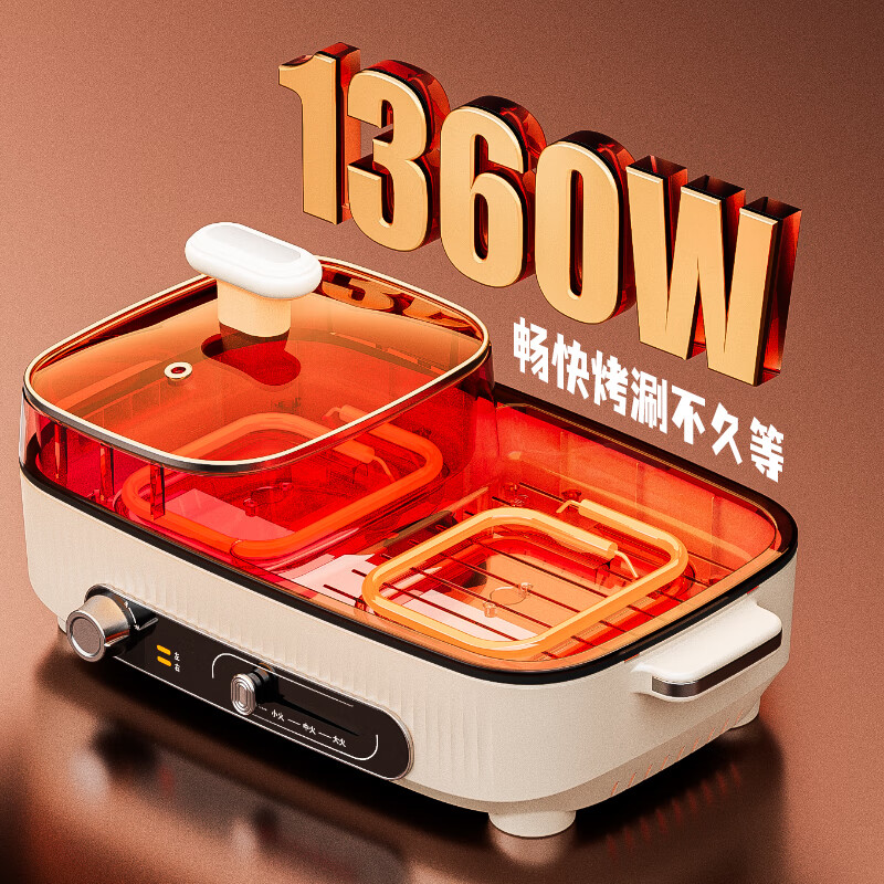 额定电压:220V~ 额定功率:1360W 额定频率:50Hz 额定容量:1L 材 质:锅盖:钢化玻璃,锅体:ADC-12铝合金,本体:PP,涂层:双层水性 方形加大深容量,尽兴涮烤 涮煎烤烙,一机多用,样样精通 分区控温,左控火锅右调烤肉,简单便捷 1360W大功率,速热聚能 > 可视化玻璃盖,涮烤一体,满足多人口味