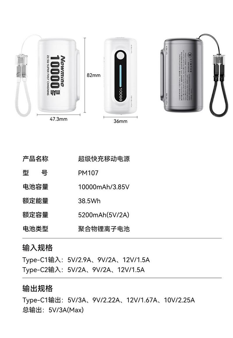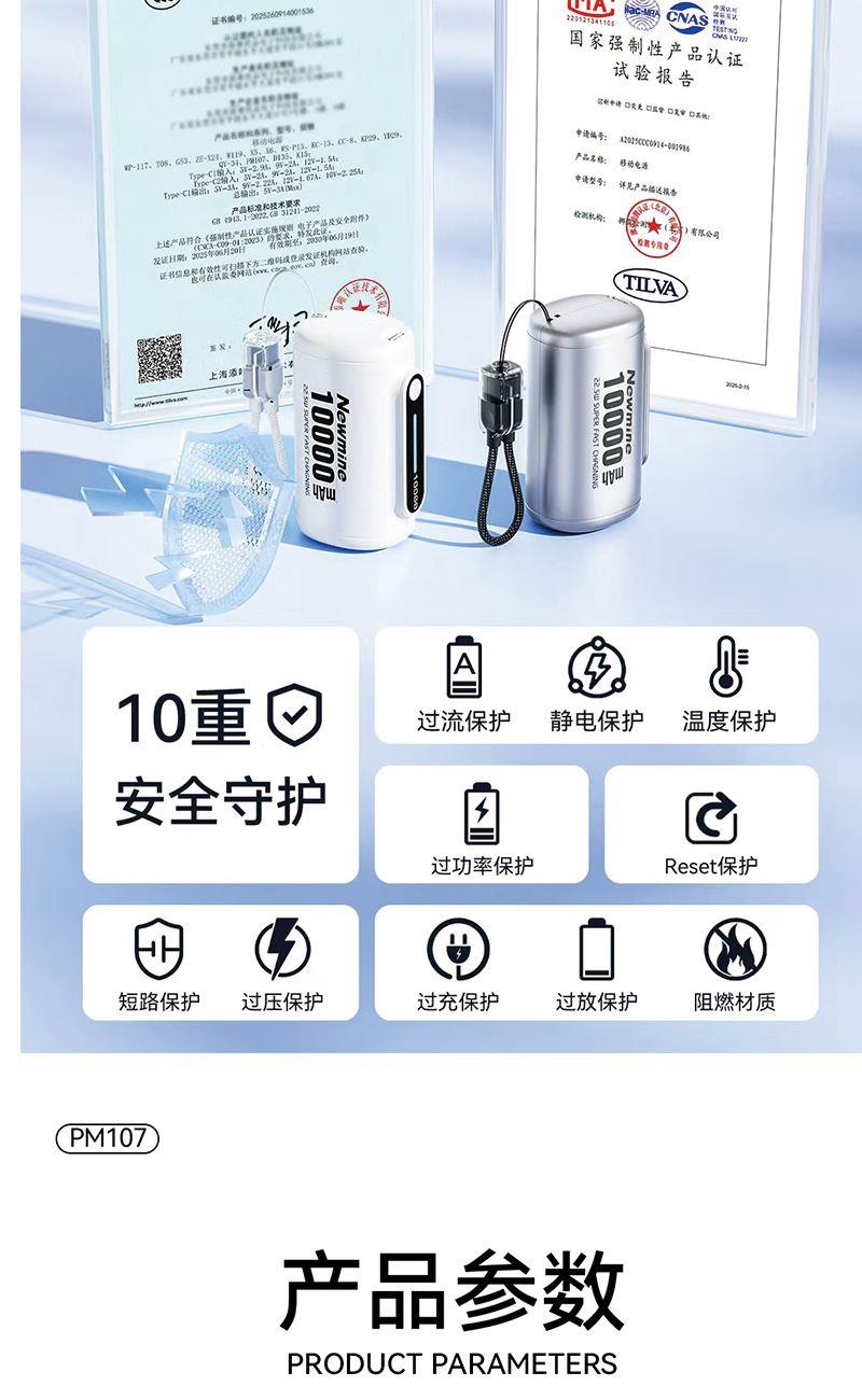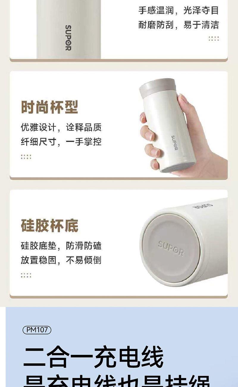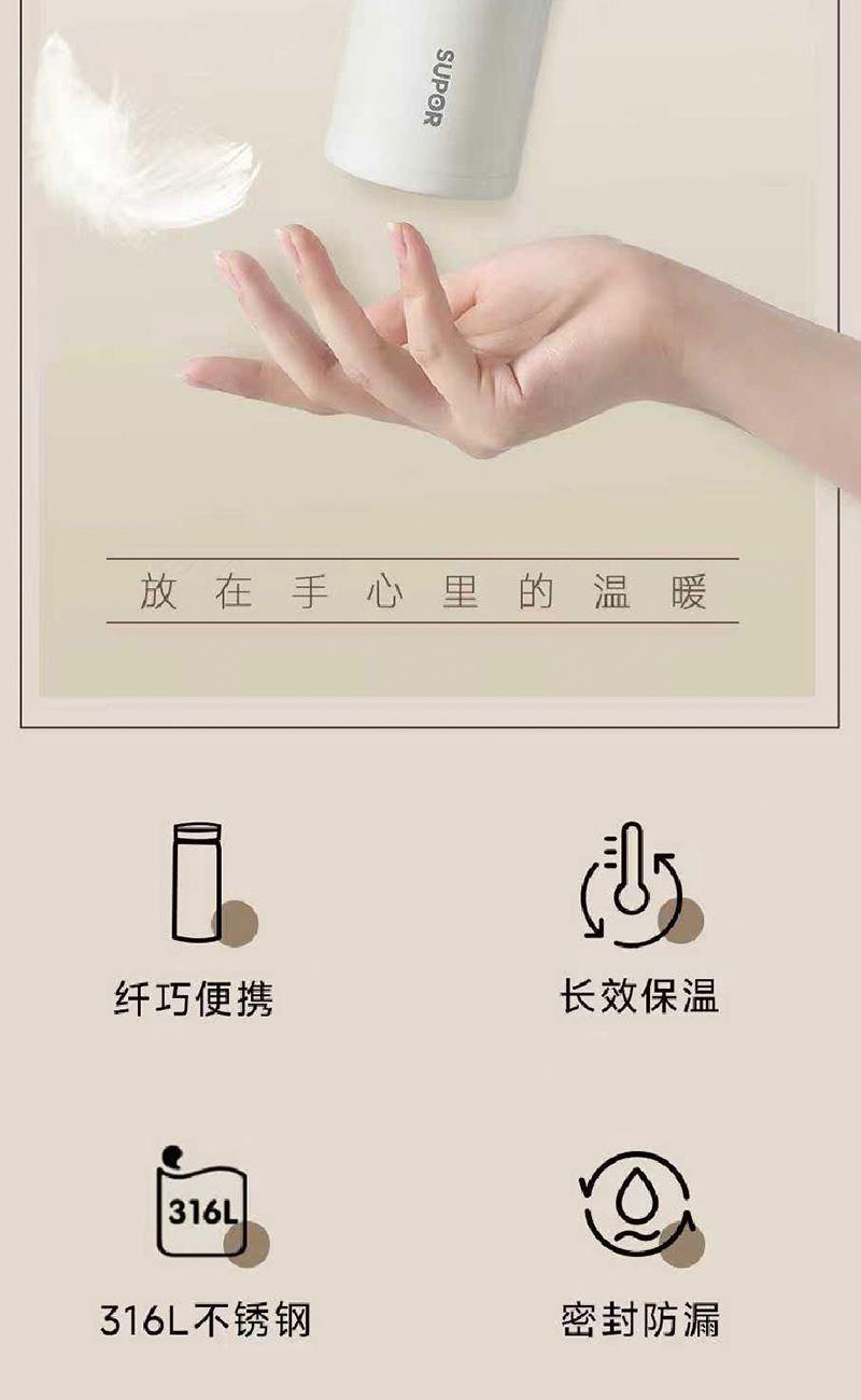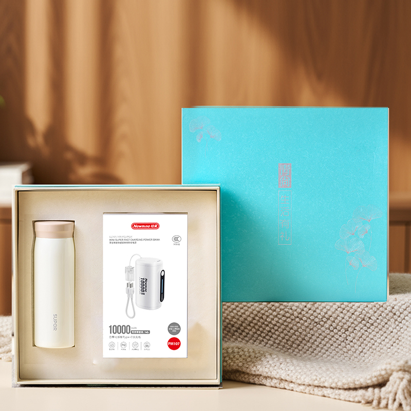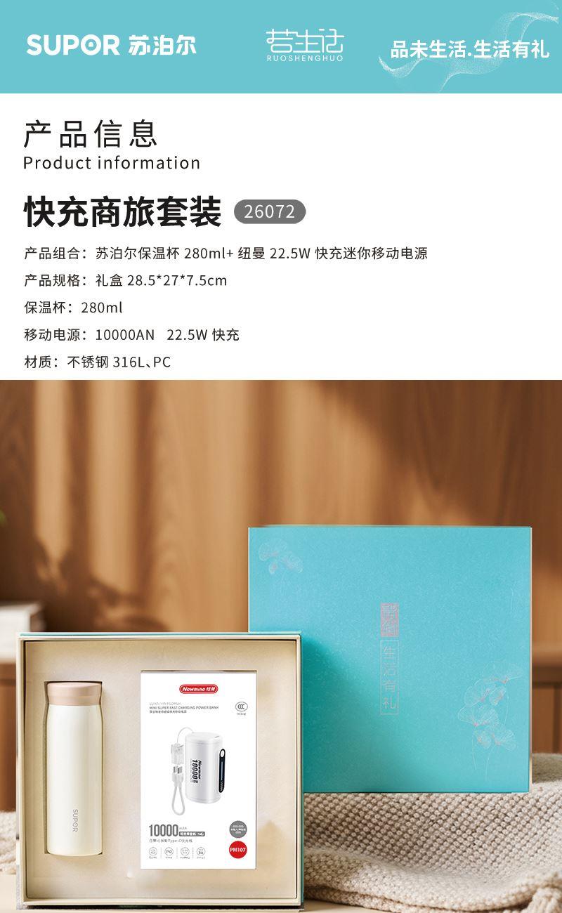 产品型号:26072 产品组合:苏泊尔保温杯280ml+纽曼22.5W快充迷你移动电源 保温杯:280ml 移动电源:10000AN 22.5W快充 材质:不锈钢316L、PC 包装:精装礼盒