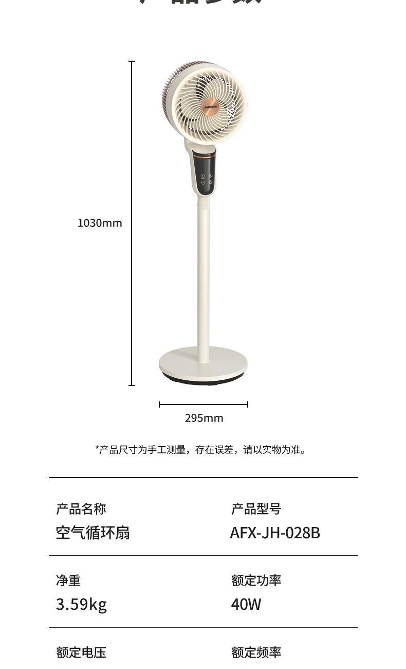 额定电压:220V~ 额定功率:40W 额定频率:50Hz 电源线长:150cm 材 质:前网、后网、风叶、底座:PP,立柱管:ABS > 智能语音操作,遥控器操作,无需走动,解放双腿 > 8档风速调节,满足全家使用 > 12h智能定时,到点即停,不怕着凉 > 高度随心可调,台立两用,上下左右自动摇头 > 贴心设计香薰盒,可放置防 蚊虫香薰,驱赶蚊虫