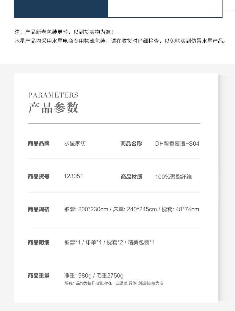 材质:聚酯纤维 规格:1.5m床:被套:200*230cm、床单:240*245cm、枕套:48*74cm*2 产品重量:净重约1.98kg,毛重约2.75kg