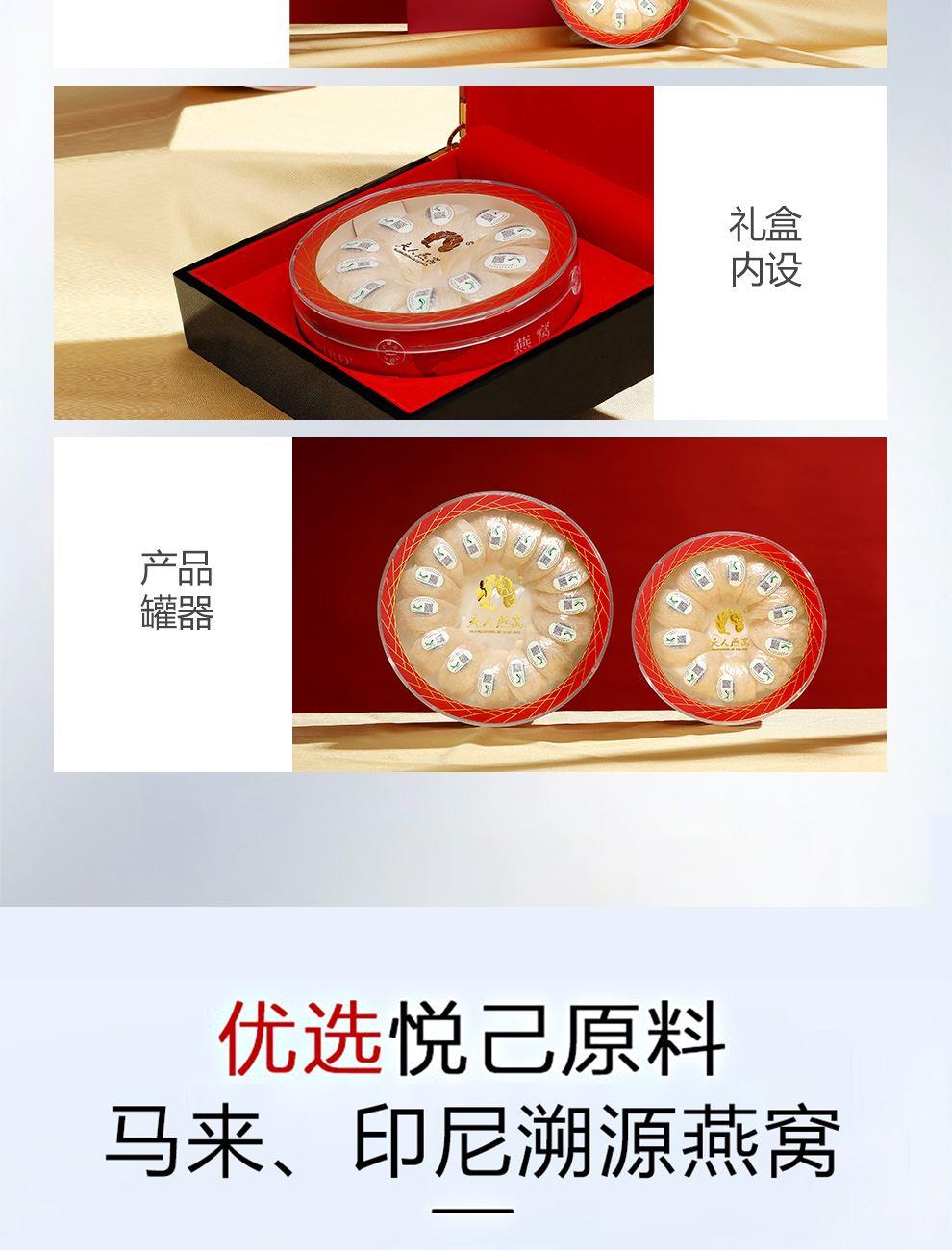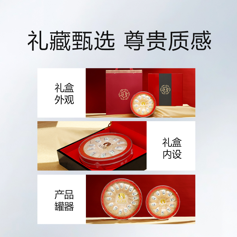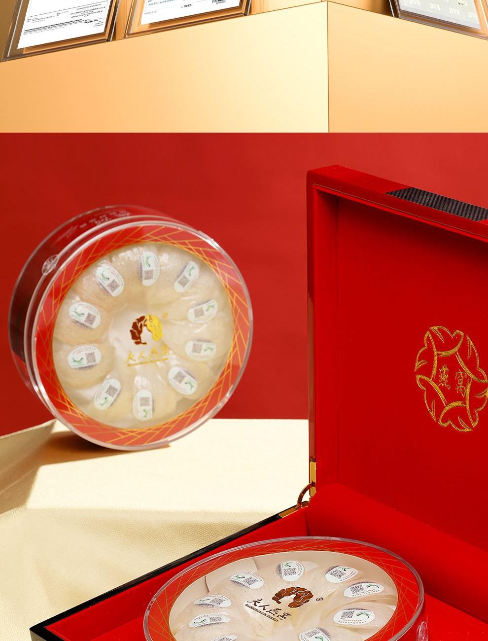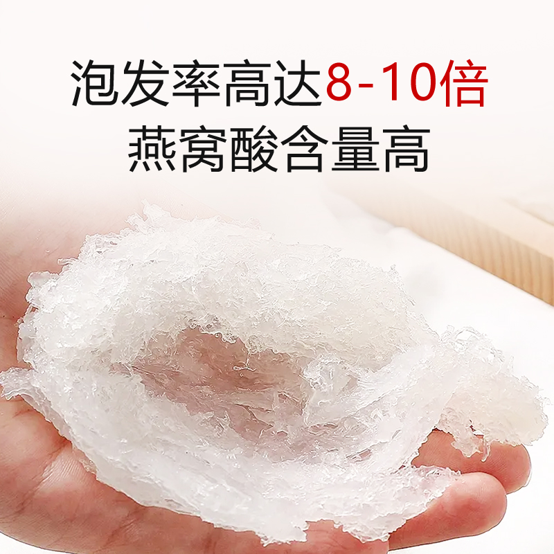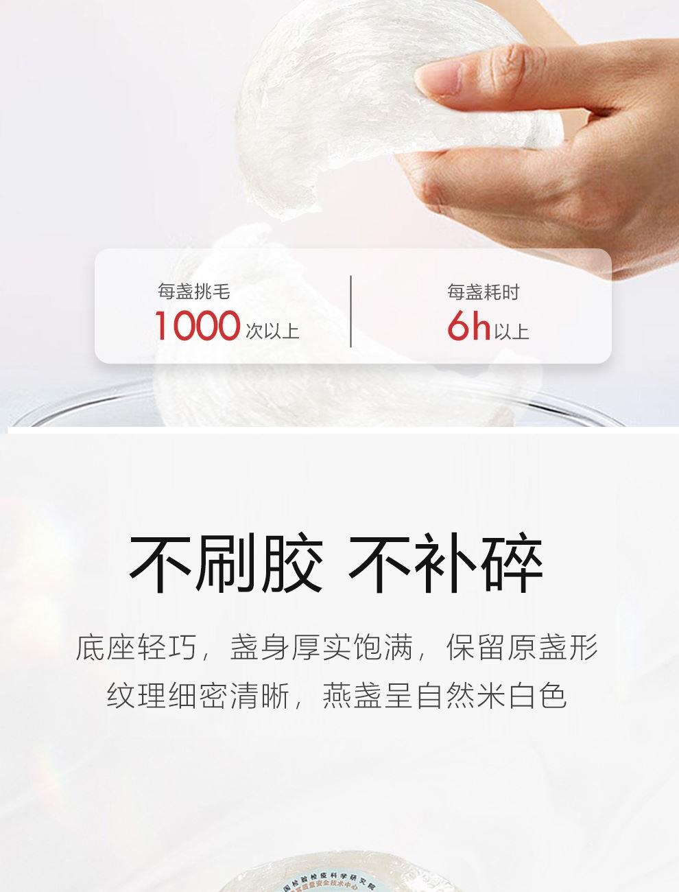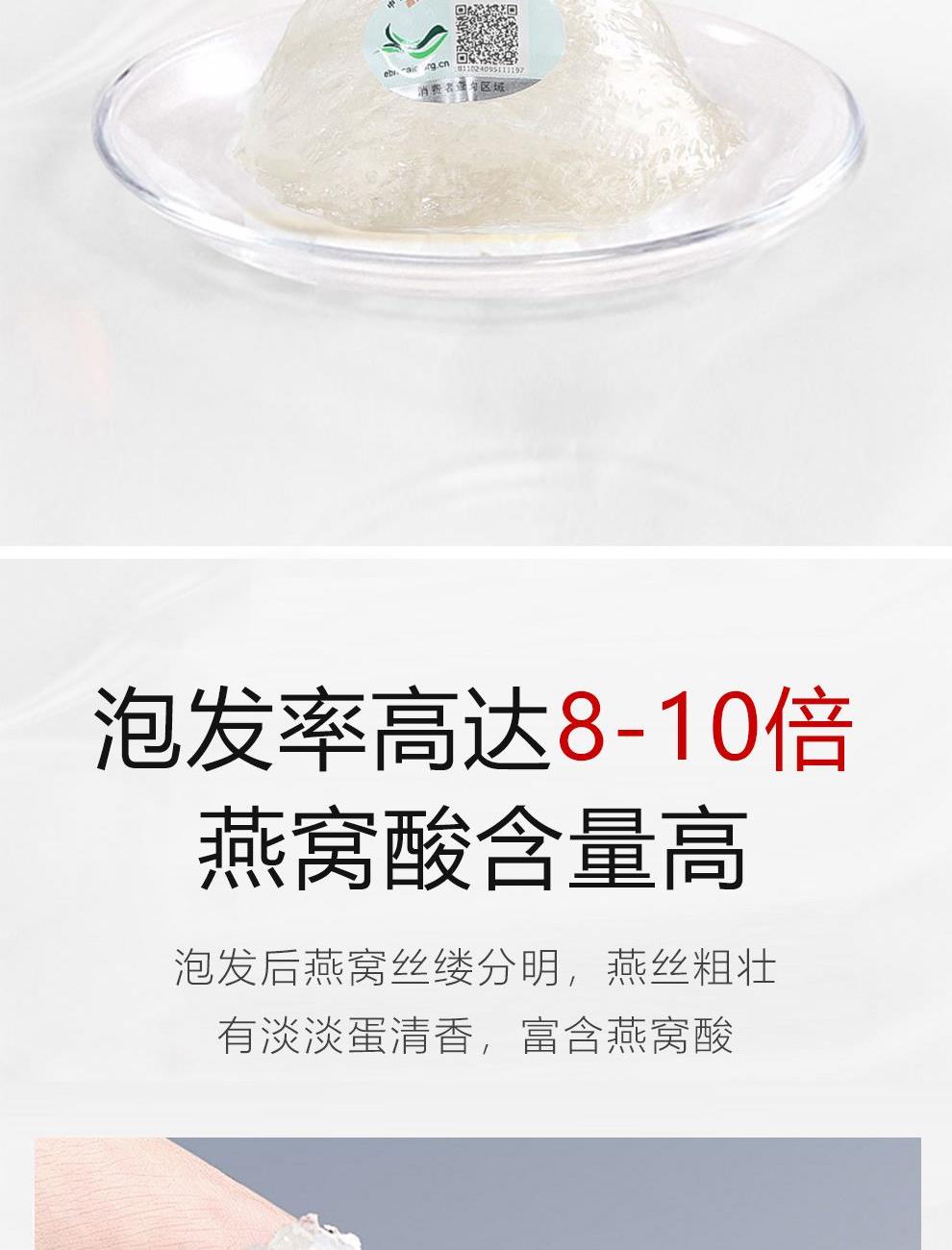 规格:溯源大盏50克 卖点: 1、一盏一码,溯源可查,品质有保障。 2、不刷胶,不补碎,泡发率高达8-10倍。 3、99.9%洁净度,足干足称,不为一滴水分买单。 4、节省时间、免泡发燕盏省去了泡发的时间,可以开始炖煮。 5、免泡发燕盏的加工过程更加标准化,品质更加稳定。