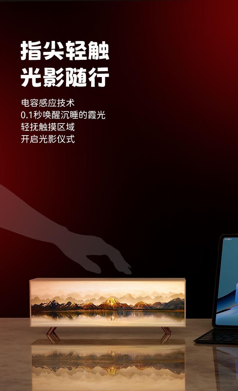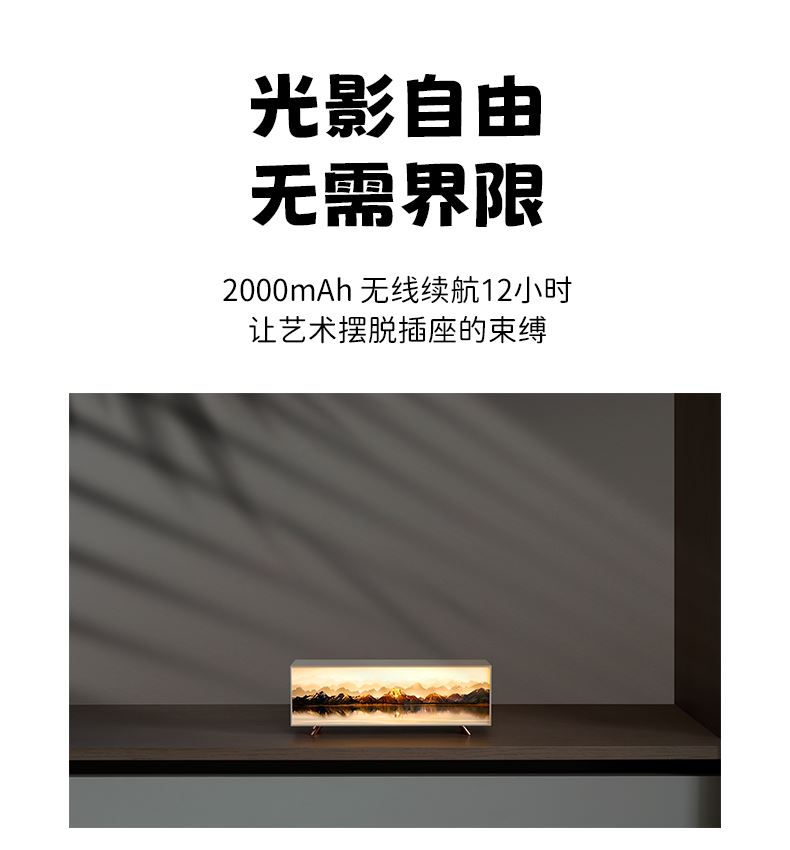 【颜色】木色 【电池容量】2000mAh 【材质】木材+亚克力 【产品尺寸】271*70*97mm 【彩盒尺寸】 【电源输入】 5V 【产品重量】290g/380g 长按触摸开关,无极调光,,氛围灯,营造氛围感,精致摆件 三色灯光,冷暖光源,轻松切换,暖色光源助眠又温馨,冷色光源明亮清新,亮度自由调节 实木3D效果,艺术画夜灯,内置电池
