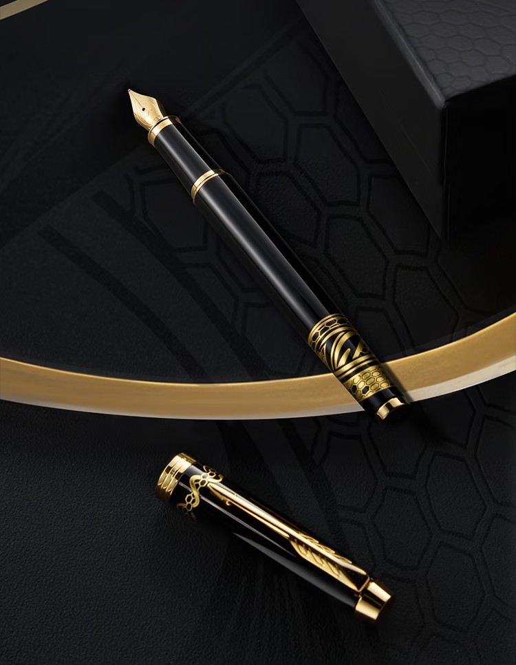 笔帽:丽雅漆面,黄铜材质,烫金蛇纹 笔环:不锈钢PVD金,笔夹及笔环 笔身:丽雅漆面,黄铜材质,烫金蛇纹 笔尖:不锈钢PVD金,激光雕刻,蛇头图案 灵蛇蜿蜒,绘就蛇年璀璨画卷 祥瑞萦绕,铸就非凡辉煌新篇