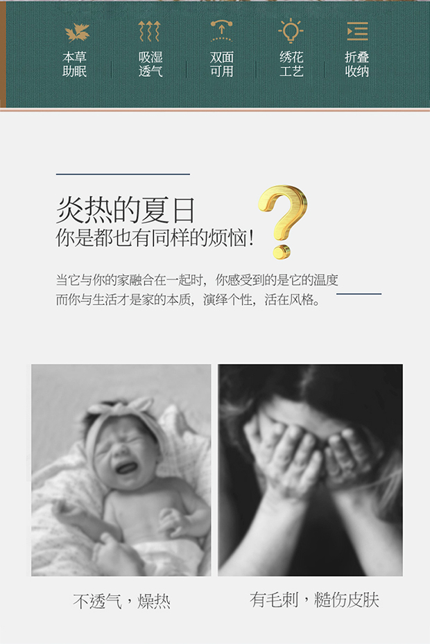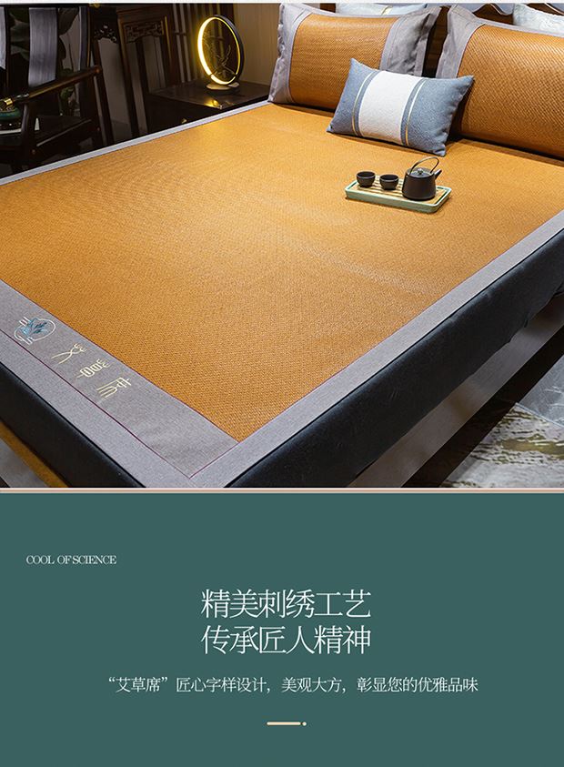 1:一“席"两用可折叠绣花艾草养生席双面设计, 2:正反可用带来不一样的肌肤体验 双面材质倍感舒适, 3:“艾草席”匠心字样设计,美观大方,彰显您的优雅品味 尺寸:180*200cm*1 枕套:48*74cm*2 包装:彩盒