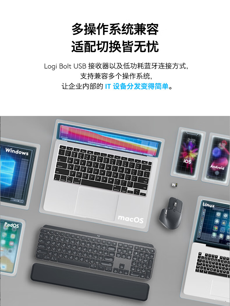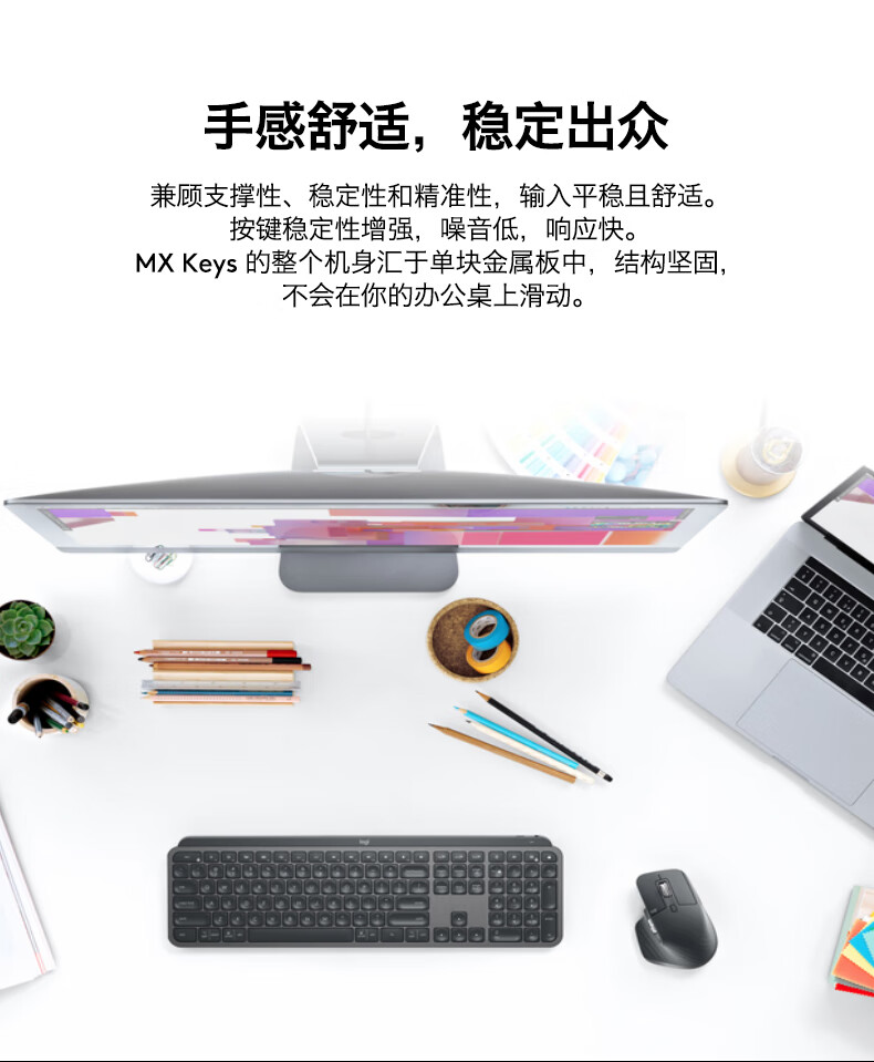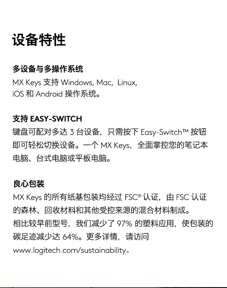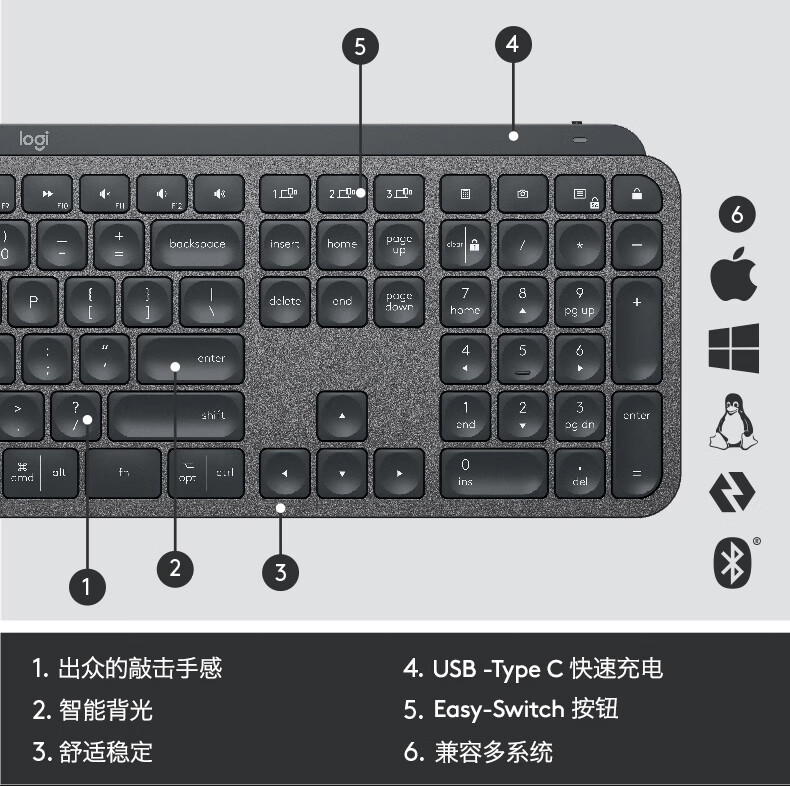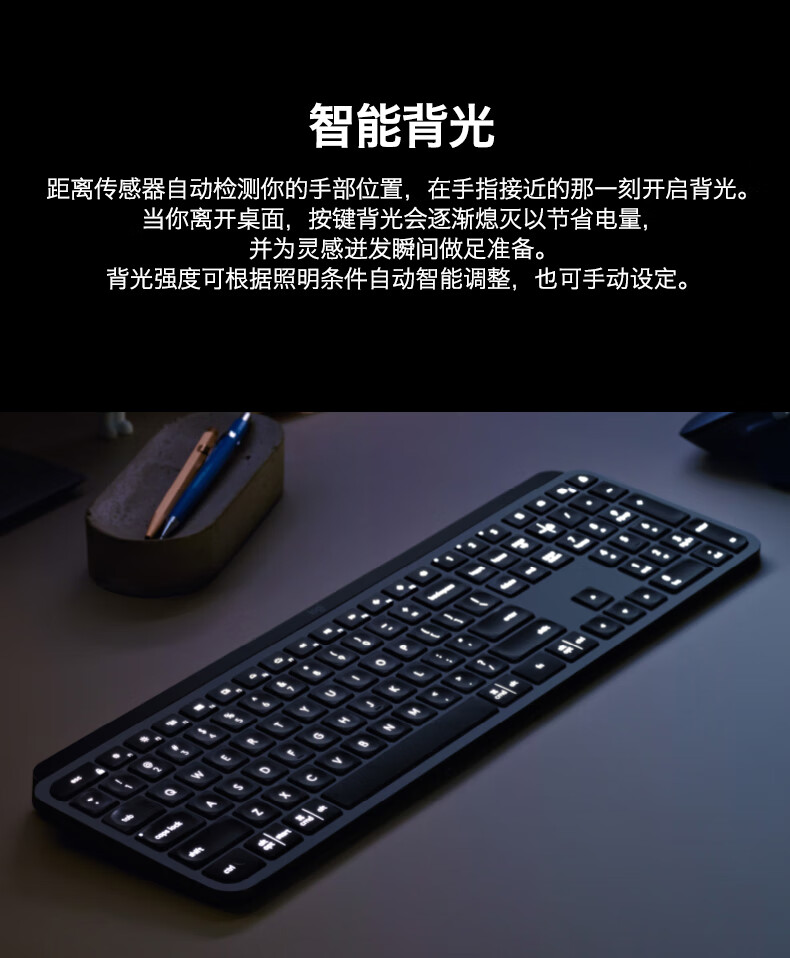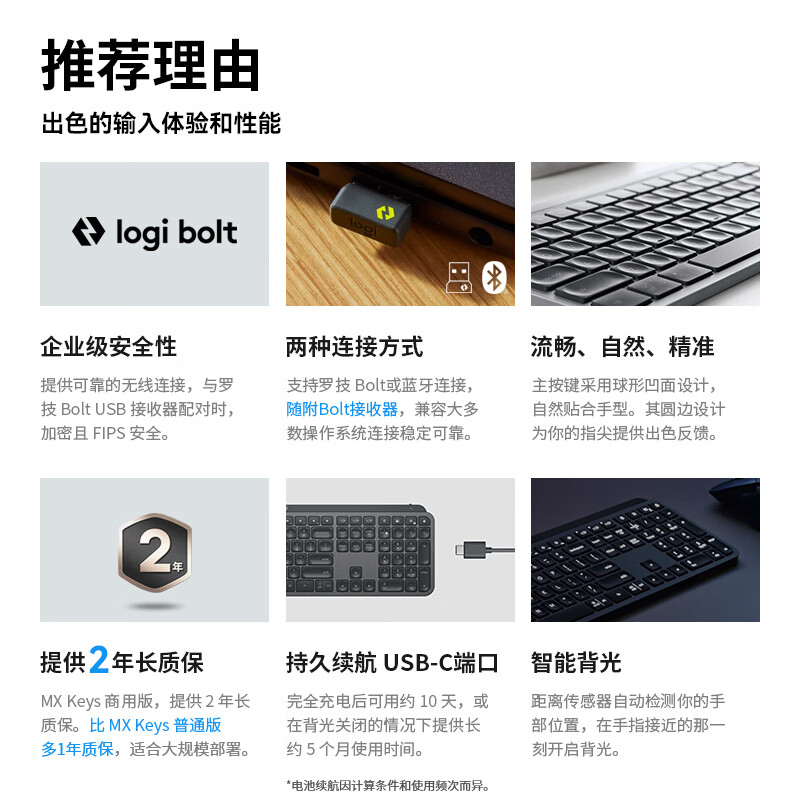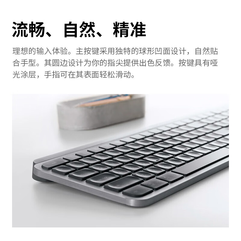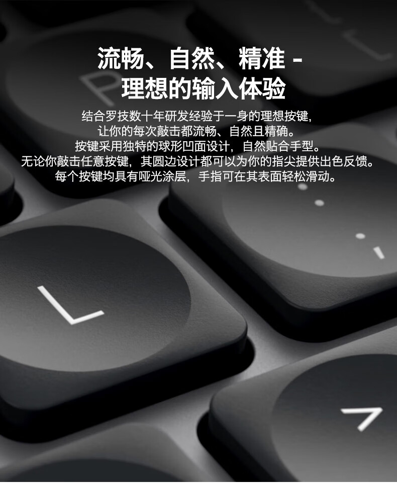 1. 球形凹面键帽、优化的剪刀式结构、智能背光 (仅部分型号)。 2.强大的连接性与多设备切换:罗技 Unifying 接收器 + 蓝牙、Easy-Switch 技术、持久续航,可靠耐用 3.坚固品质、智能功能与人体工学设计、智能按键 4.Flow 跨屏控制 (需配合 MX Master 系列鼠标) 5.舒适设计、符合人体工学的倾角设计(部分型号配备可拆卸式掌托),提供自然舒适的输入姿势,有效缓解手腕压力。