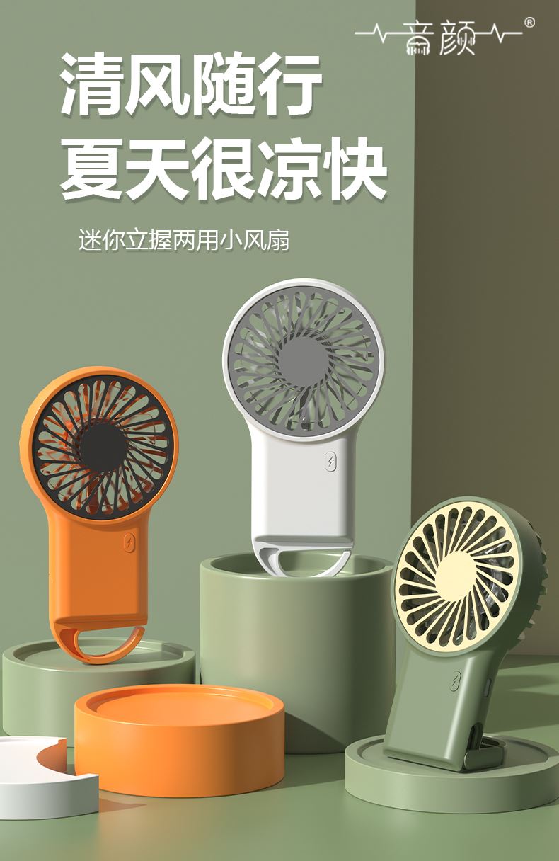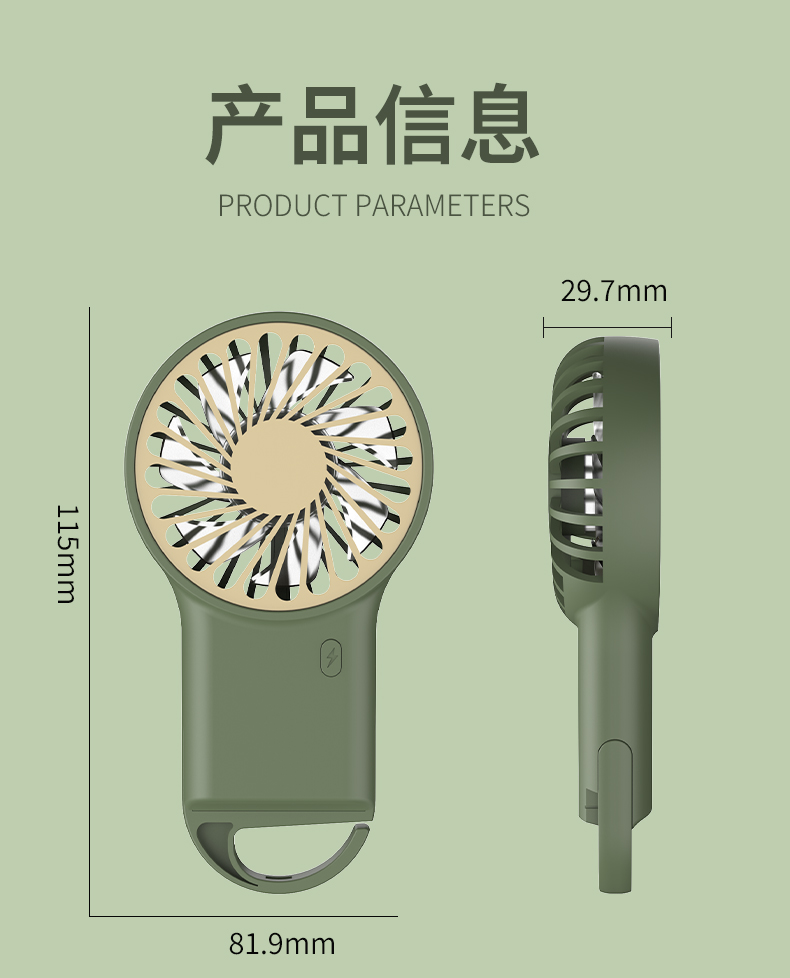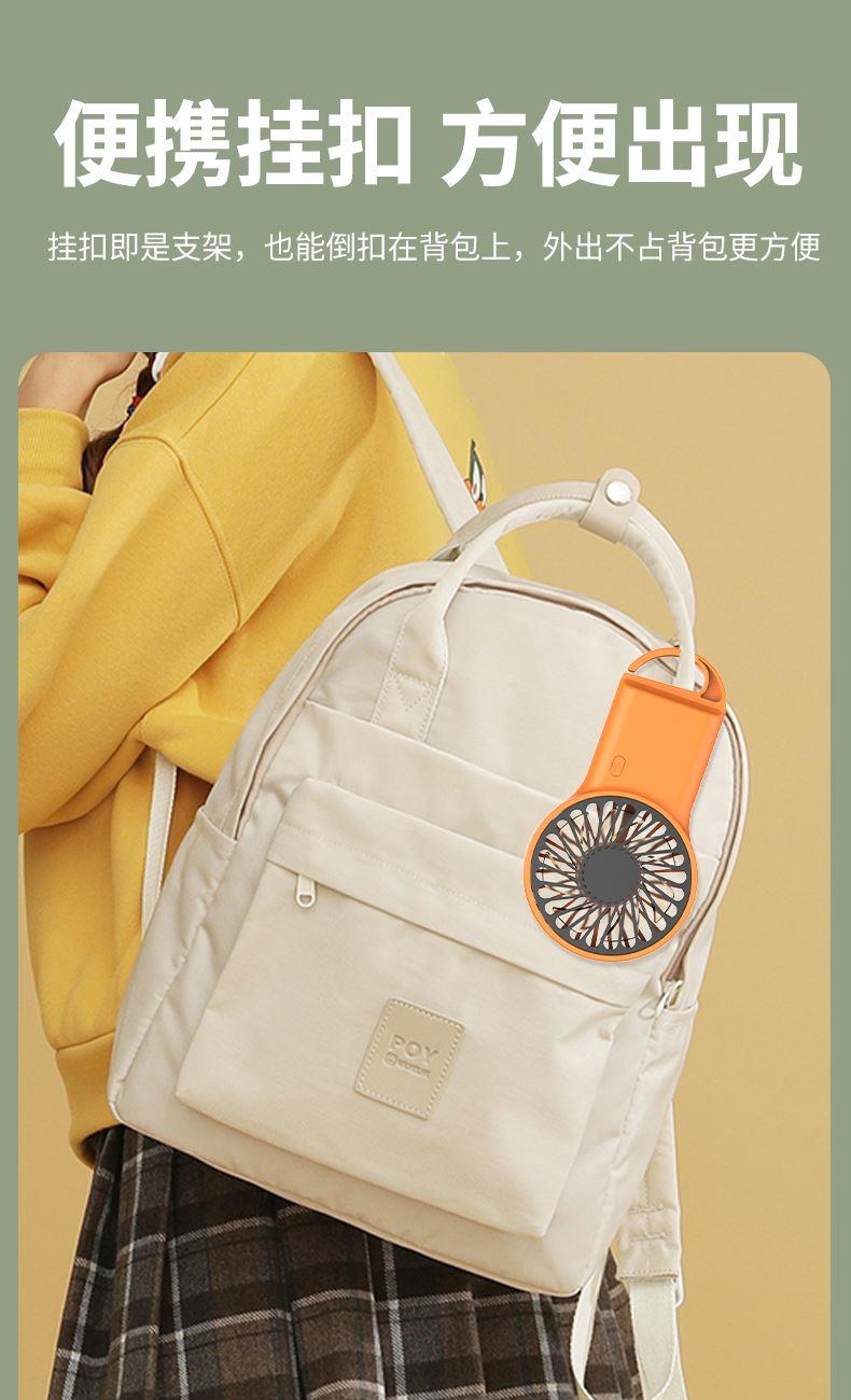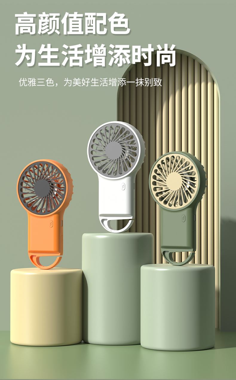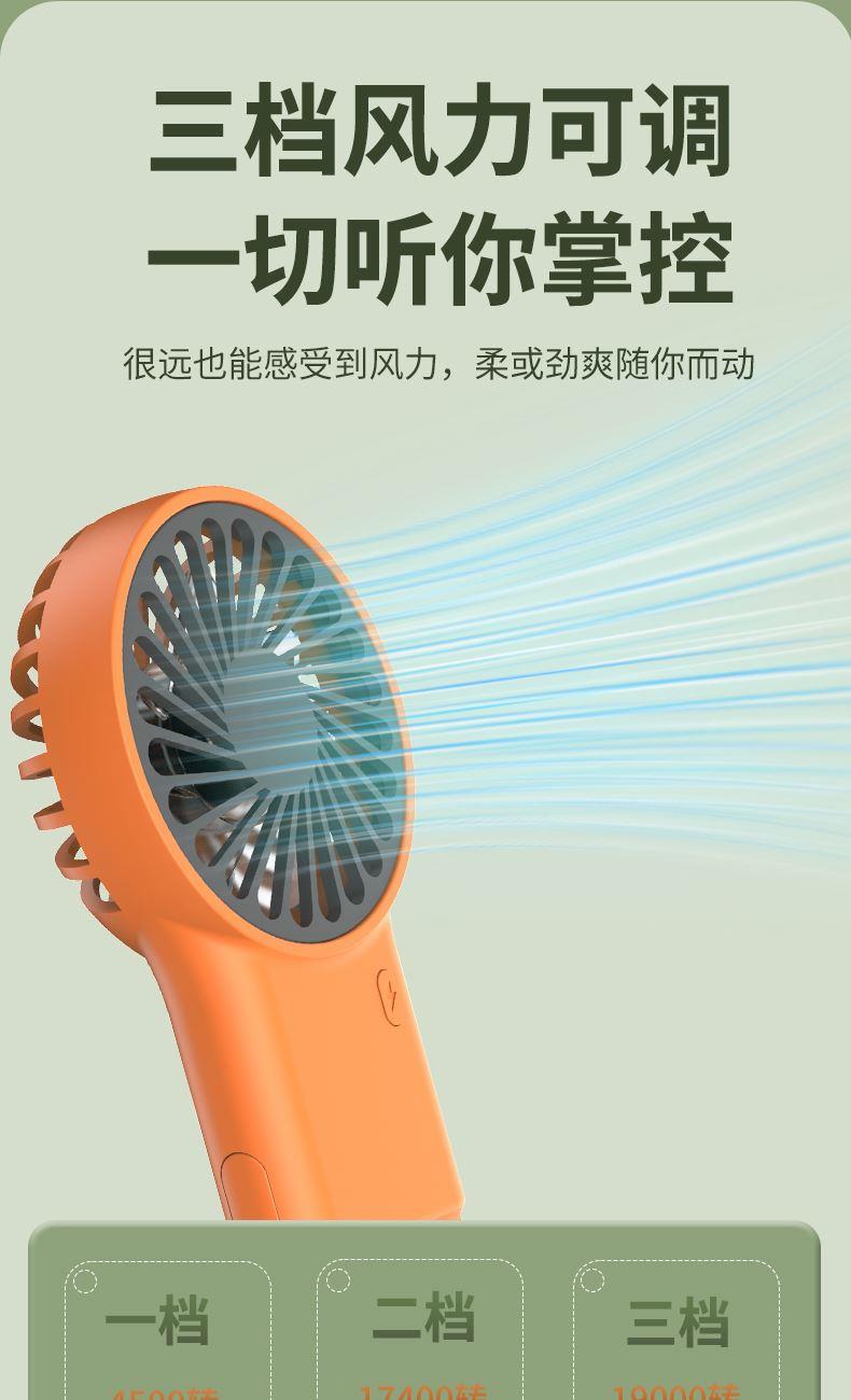 【推荐理由】: 精致小巧,方便携带 可挂背包,可立桌面 多场景 三档风速可调 风扇罩可拆卸清洁 颜色:绿色 白色 橙色 尺寸:85*33*160mm 容量:300mAh 包装:彩盒包装