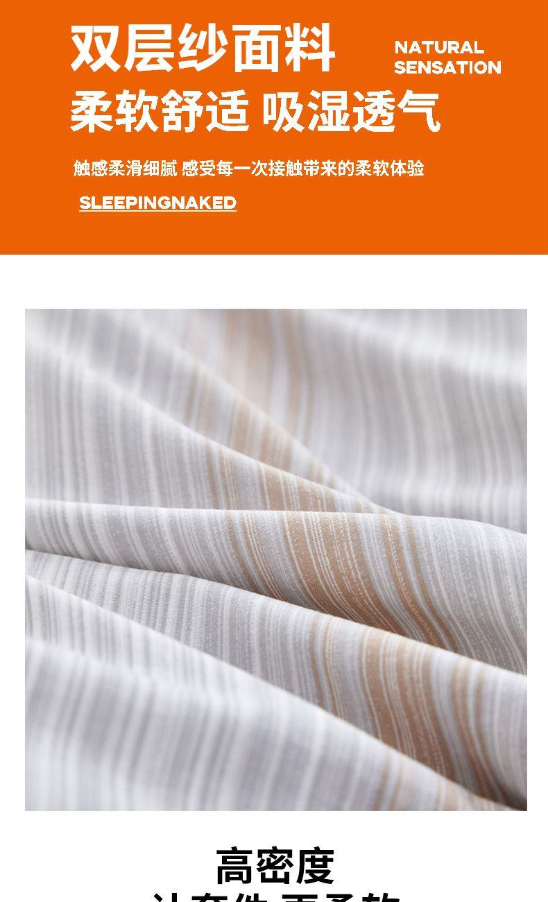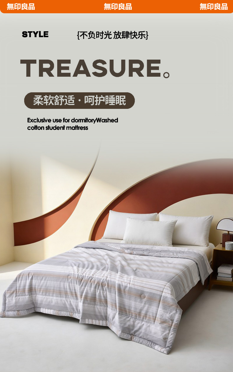 规格:150*200cm 面料:双层纱 填充:羽丝棉 克重:800g 执行标准:GB/T22796-2021 安全类别:GB18401-2010 B类 1.甄选优质双层纱面料,纤维柔软蓬松,手感柔软,拉力强度高,织物贴身舒适; 2.填充物选用优质A类整张羽丝棉纤维手感犹如羽绒般,轻盈蓬松,柔软舒适 3.采用单边暗合缝制,定点绗缝工艺,日式简约设计风格,简约时尚,让您感受科技生态睡眠!
