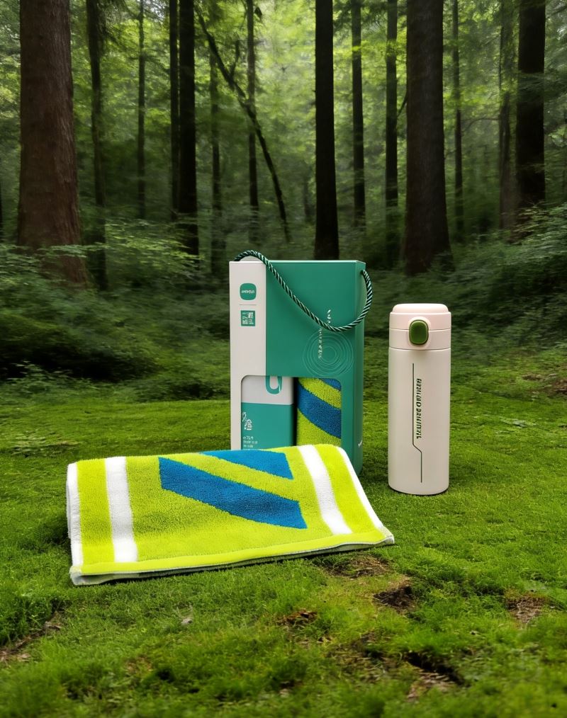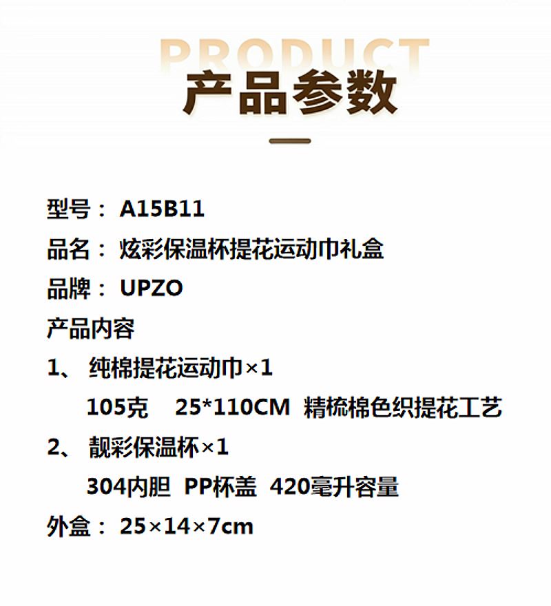 型号: A15B11 产品内容 1、 纯棉提花运动巾×1 105克 25*110CM 精梳棉色织提花工艺 2、 靓彩保温杯×1 304内胆 PP杯盖 420毫升容量 外盒: 25×14×7cm 纯棉运动巾 时尚外观设计 靓丽配色 提花工艺体现运动与清凉视觉感受 优质精梳棉 适合运动的克重与规格设置 靓彩保温杯融入祝福元素和时尚设计理念,给与保温杯常规功能外更多的靓丽色彩 内胆采用304材质 杯盖优质PP