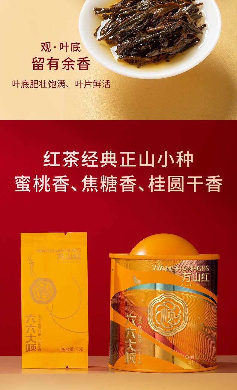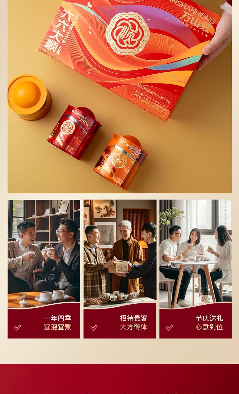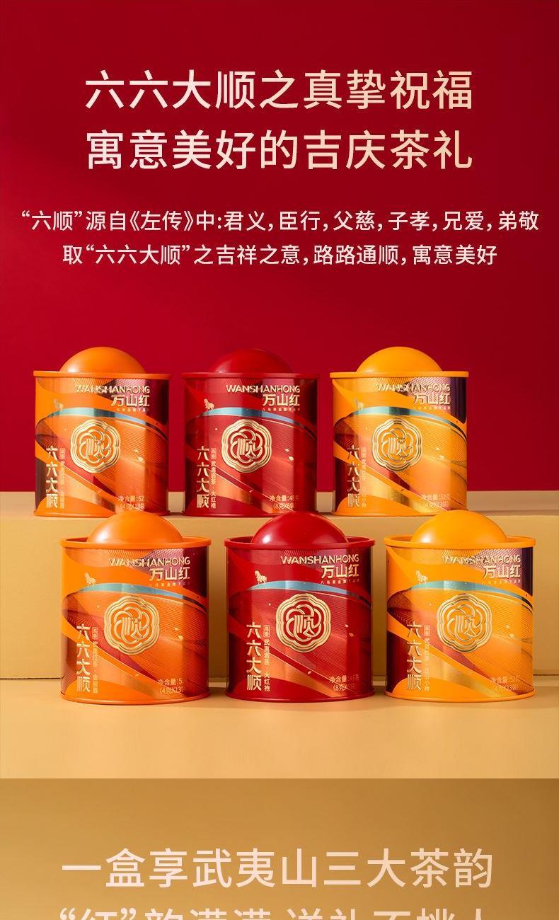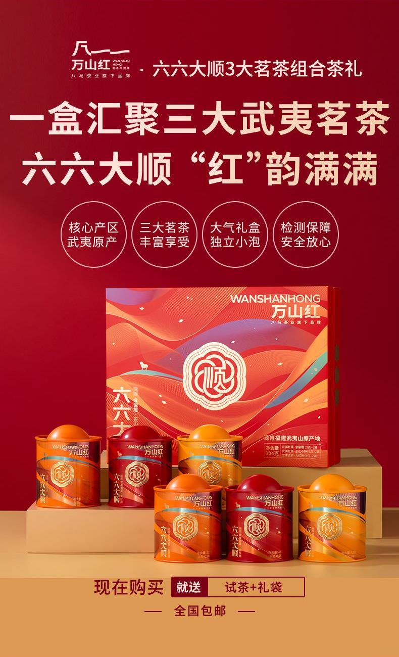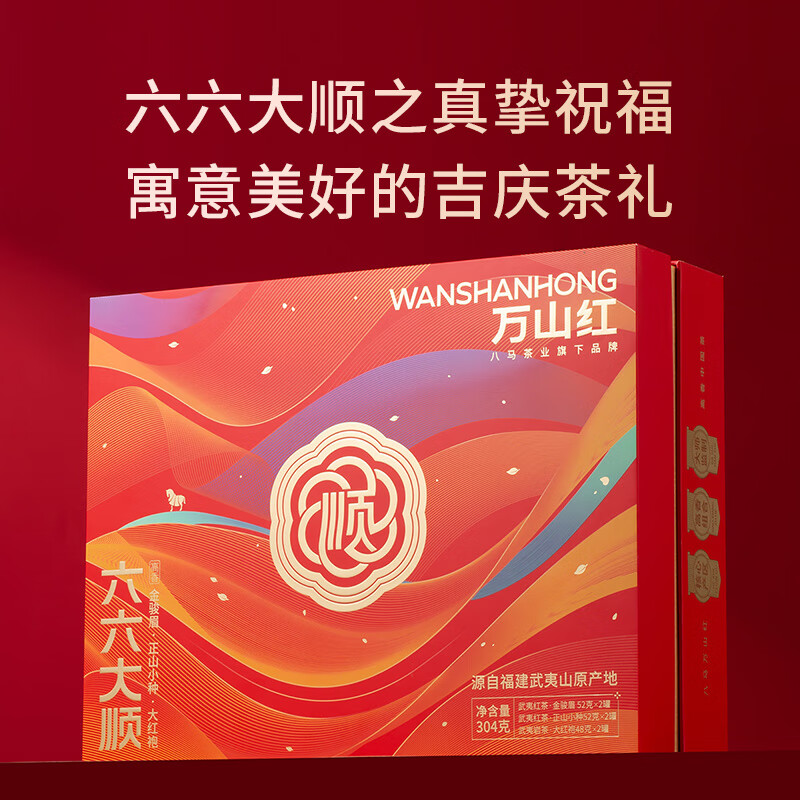 礼盒内配: 大红袍48克X2罐;金骏眉52克X2罐;正山小种52克X2罐 净含量:304g 单罐内配:正山小种400克 净含量:400g 推荐理由: 自饮一罐,送礼一盒; - 产品组合:涵盖武夷原产三大名茶,以“六六大顺”为主题打造礼盒,内含多罐不同品类茶叶,一次可品鉴多种武夷茗茶风味,满足多样饮茶需求。 - 包装与寓意:国潮风礼盒设计,色彩喜庆且富有文化感,“顺”字元素与“六六大顺”的命名,兼具送礼的祝福寓意与收藏价值,是节日、商务馈赠的优质选择。 - 产地与工艺:源自福建武夷山原产地,采用传统焙火工艺制作,保证地道岩茶的风味特质,是正宗武夷大红袍的典型代表。 - 品质与口感:滋味醇浓,茶香浓郁且耐泡,冲泡后香气持久、茶汤醇厚,能带给饮茶者丰富的味觉与嗅觉体验。 - 规格与场景:实在大罐包装,容量充足,无论是自饮囤茶还是送礼都很适宜,满足日常品饮或分享的需求。