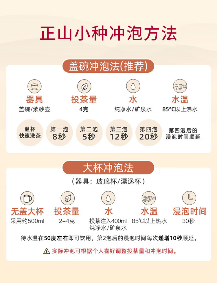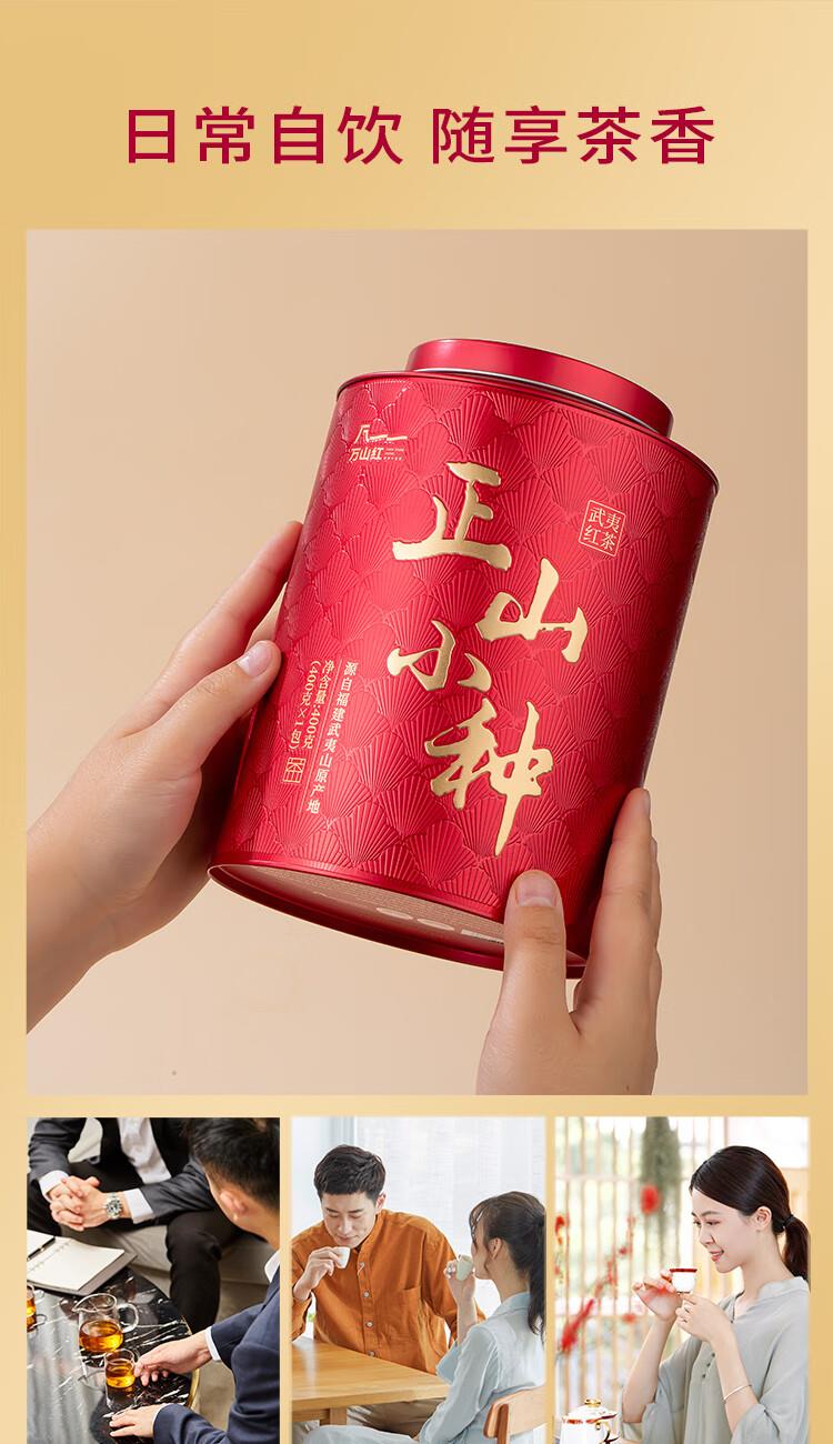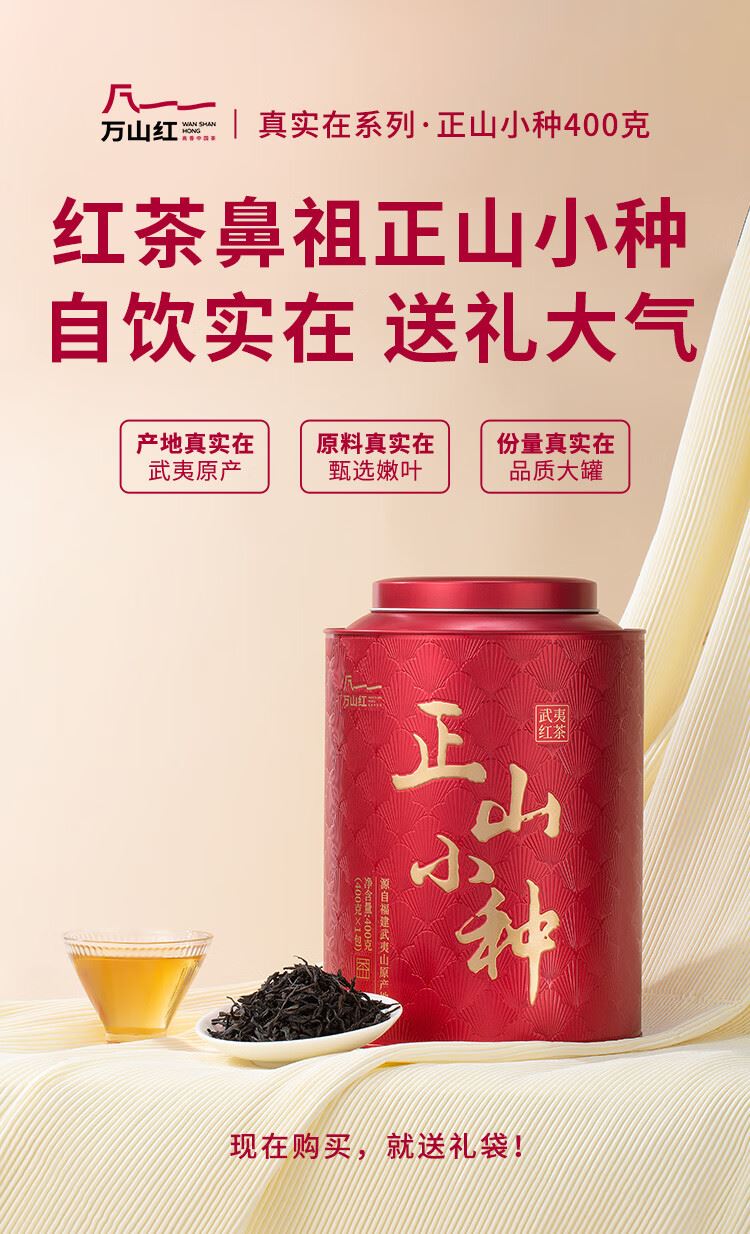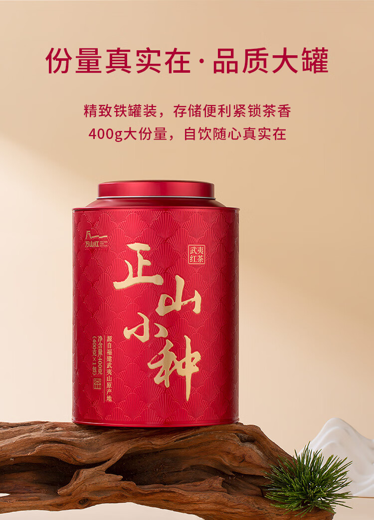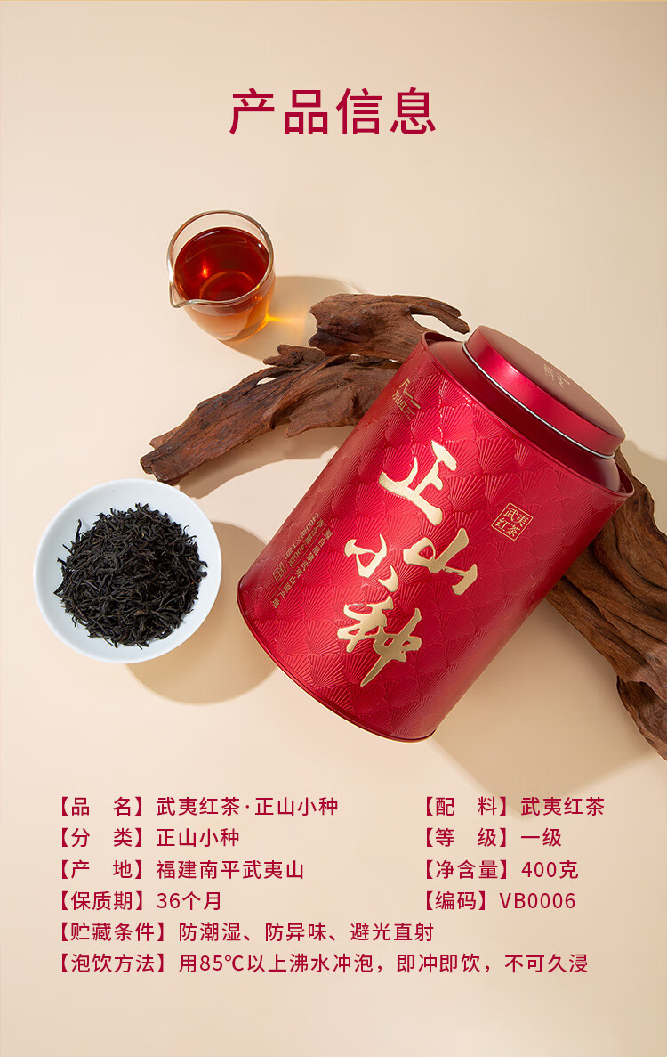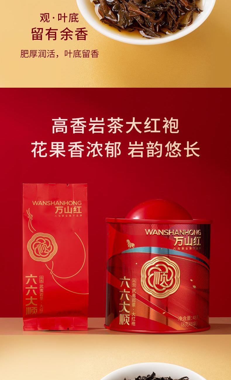 礼盒内配: 大红袍48克X2罐;金骏眉52克X2罐;正山小种52克X2罐 净含量:304g 单罐内配:正山小种400克 净含量:400g 推荐理由: 自饮一罐,送礼一盒; - 产品组合:涵盖武夷原产三大名茶,以“六六大顺”为主题打造礼盒,内含多罐不同品类茶叶,一次可品鉴多种武夷茗茶风味,满足多样饮茶需求。 - 包装与寓意:国潮风礼盒设计,色彩喜庆且富有文化感,“顺”字元素与“六六大顺”的命名,兼具送礼的祝福寓意与收藏价值,是节日、商务馈赠的优质选择。 - 产地与工艺:源自福建武夷山原产地,采用传统焙火工艺制作,保证地道岩茶的风味特质,是正宗武夷大红袍的典型代表。 - 品质与口感:滋味醇浓,茶香浓郁且耐泡,冲泡后香气持久、茶汤醇厚,能带给饮茶者丰富的味觉与嗅觉体验。 - 规格与场景:实在大罐包装,容量充足,无论是自饮囤茶还是送礼都很适宜,满足日常品饮或分享的需求。